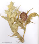 Plant 20-100 cm. Stems erect, branched, often shining, glabrous or sparsely arachnoid. Leaves rigid, glabrous or arachnoid, with prominent nerves, lanceolate-in outline, sessile or base decurrent into spiny stem-wings, pinnatifid to sub-2-pinnatisect, with spiny-dentate margins; lower leaves 7-30x4.5-16 cm, those above decreasing in size. Heads solitary, 2-5 x 2-4 cm excl. bracts. Bracts spiny-margined, ovate-acuminate and scarcely exceeding capitula or apex prolonged into a hard subterete or flattened spine up to 7 cm. Capitulum 7-17 mm long, incl. exserted corollas. Flowers c. 4-8. Capitula at time of dispersal obovoid to tetragonal, 10-16x5-9 mm. Fertile achene smooth, ovoid. Fl. 5-6. Rocky limestone & igneous slopes, steppe, nr salt lakes, open woodland, fallow fields, 100-2500 m.