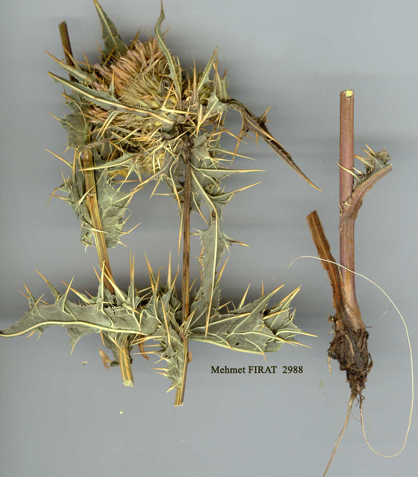 | C. obvallatum (Bieb.) Fischer in Cat. Jard. Gorenki ed. 2:35 (1812). Syn. Cnicus obvallatus Bieb., Fl. Taur.-Cauc. 2:279 (1808). Ic: Fl.Azerb. 8: t. 40 f. 2 (1961), poor. Perennial, 25-70 cm. Stems unwinged, shortly corymbose and few-capitulate above. Median cauline leaves oblong-pinnatifid, lobes shortly divided into several triangular shortly spined lobules (spines slender, 1-6 mm), subglabrous, pale bright green (in vivo), base ampiexicaul and spinose-lobulate. Capitula 2-6(-10) per stem, overtopped by many involucrate leaves which are linear-lanceolate and deeply dissected into many very unequal slender whitish simple or pinnatisect spines. Involucres hemispherical, 17-20 mm, glabrous, phyllaries 6-7-seriate, median oblong-lanceolate, with a darkened linear 4-6 mm vitta, acuminate intoa short spinule. Corollas 16-18 mm, greenish-white; anther tube mauve. Achenes c. 4 mm. Pappus c. 14 mm. Fl. 8. Ravines, rocky igneous slopes near streams, 2050-2800 m. Type: [Georgia] in herbidis subalpinis Caucasi, circa acidulam Narzana, versus cacumen Beschtau et in convallibus alpium ibericarum (LE). N.E. Anatolia. A8 Çoruh: Şavval Tepe above Murgul, 2700-2800 m, D. 32272! A9 Çoruh: Yalnizçam Da., nr Kutul, 2050 m, D. 32444! Caucasia, N. & N.W. Iran. Hyrcano-Euxine (mt.) element. Material seen from N. Iran (Bornm. 7284) has longer stouter spines than that from Turkey. In N.W. Iran this species varies in the direction of C. hygrophilum Boiss. In Turkish material of C. obvallatum grown in Scotland (D. 32444), the involucral leaves are shorter and less conspicuous than in the wild gathering. A hybrid between this species and C. simplex (C. x koslowskyii Petrak!) has been collected at Bakuriani in Adjaria and should be looked for in neighbouring Çoruh. |