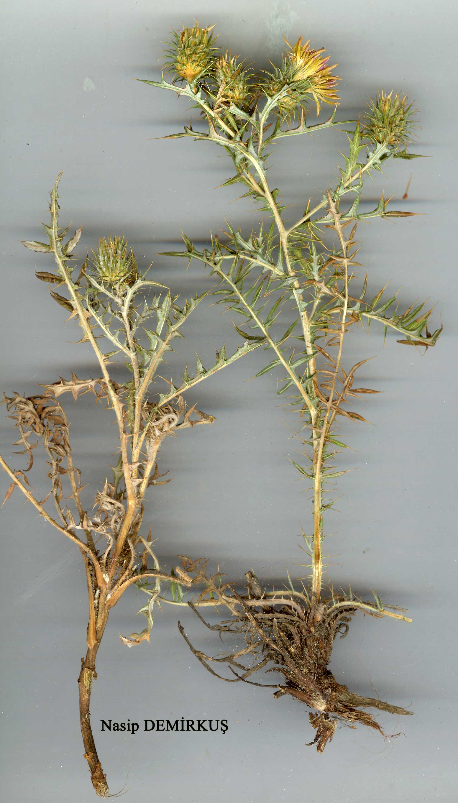 | C. nabelekii Bornm. in Öst. Bot. Zeitschr. 63:59, t. 1 f. 5, 6 (1913). Map 31, p. 339. Perennial, 20-45 cm, 5-9-headed, ± dichotomously branched. Stems slender, terete, arachnoid-woolly, soon glabrescent. Leaves finely prickly, loosely arach-noid-woolly, glabrescent above, densely white-tomentose below; basal leaves oblong-linear, 5-12 x 1.5-4 cm, pinnatipartite, with up to 12 pairs of linear or linear-lanceolate segments up to 4 mm broad; stem-leaves smaller, segments narrow, less numerous, (0.5-)l-2 cm, decurrent into wings (0.5-)l-3 cm long. Capitula 30-45-flowered. Involucre broadly ovoid, 2-2.5 cm broad incl. spines; phyllaries 90-120 (-175), arachnoid-woolly, oblong-lanceolate to linear-subuiate, basal part 2 mm, adpressed, oblong, upper part 6-10(-12) mm, reflexed or horizontally spreading. Bristles of receptacle smooth. Flowers yellow, 12-14 mm. Achenes brown, oblong-obovate, 4-5 x 2-2.5 mm, striped lengthwise, wrinkled, finely denticulate at apex. Fl. 6-9. Rocky slopes, steppe, 1300-2550 m. Type: [Turkey C9 Hakkari] Aufstieg vom Zabfluss nach Kotschanes (Koçanis), c. 1300 m, 1 ix 1910, Nâbělek 3902 (holo. BRA). S.E. Anatolia. B9 Van: Toprak Kale nr Van, 1620 m, Hub.-Mor, 8920! C9 Hakkari: Koçanis, 2550 m, D. 24313! Endemic. Ir.-Tur. element. Hub.-Mor. 8920, with less numerous phyllaries (70-86) and short (5 mm) decurrent stem leaves, is very near to C. urumiensis. |