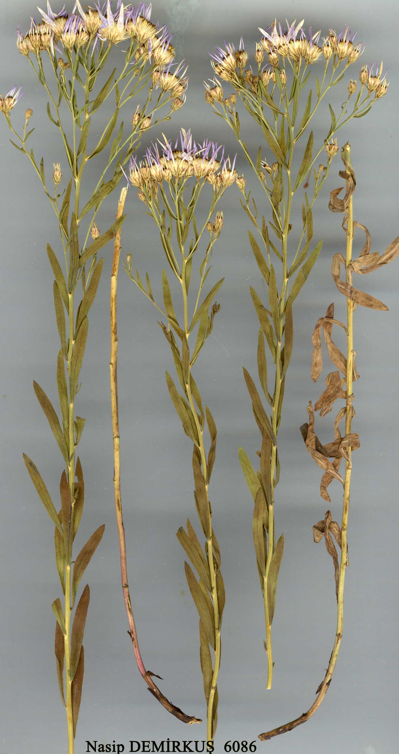| G. punctata (Waldst. & Kit.) Nees, Gen. et Sp. Aster 187 (1833). Syn: Aster punctatus Waldst. & Kit., PL Rar. Hung. 2:113, t. 109 (1805); Galatella armena Boiss., Fl. Or. 3:161 (1875)! 1C sosnowskyana Kemul.-Nath. in Monit. Jard. Bot. Tiflis 3-4:137 (1927). Ic: Jâv. & Csap., Ic. Fl. Hung. f. 3641 (1933). Stems 25-50 cm, pubescent and subsessile-glandular. Leaves elliptic-lanceolate, 15-50x2-10 mm, semi-amplexicaul at base, acute at apex, entire, 3-nerved, papillose (papillae tapering when young into fine lanate hairs), sometimes glandular-punctate. Capitula generally more than 6 per corymb, peduncles bearing small scale-like leaves. Involucre 5-6 mm broad; phyllaries 3-4-seriate, oblong-lanceolate, 3-nerved, 2.5-4x0.75-1 mm, margins membranous. Ray flowers 6-12, ligules lilac or bluish-mauve, 10-15 x 1.5-2 mm. Disc flowers 10-24, 4.5-6 mm. Achenes 2.5-4 mm, sericeous and glandular. Pappus brownish-white, 5-6 mm. Fl. 7-8. On moist soil of stream sides, meadows, hillsides and mountain steppes, 1800-2500 m. Type: [Hungary] crescit in subsallis comitatus Csongradiensis, Kitaibel. E. Anatolia. B8 Erzurum: Aşkale to Tercan, 1800 m, D. 32667! Muş: nr Liz, 1840 m, Buttler 16005! B9 Van: 10 km N.W. of Başkale, 2500 m, D. 24522! Kars: Eleşkirt to Tutak, Tong 376! Ağri: E. side of Tahir Da. pass 19 km from Eleşkirt to Horasan, 2400 m, D. 47161! C10 Hakkari: Zab gorge 48 km S. of Başkale, D. 23825! C. Europe to C. Asia. Euro-Sib. element? The species limits of the G. punctata complex are by no means clear. G. dracunculoides (Lam.) DC, which Boissier reduced to synonymy under G. punctata, is kept distinct in Fl. URSS and refers to plants with obtuse leaves and capitula with 6-16 flowers of which 3-6 are ray flowers. Most of the above cited specimens have distinctly punctate leaves, but in D. 47353 (B8 Erzurum: Palandöken Da., 20-23 km from Çat to Erzurum, 2300-2380 m) this character appears to be poorly developed or lacking. The fine lanate terminal hairs of the papillae are abundantly present on Tong 376 and D. 47161, but are almost completely absent in D. 23825 and 24522. Boissier (loc. cit.) claimed that G. armena differed in having obtuse non-punctate and almost 1-nerved leaves but the syntype (B8 Erzurum: Bingoldagh, Kotschy 398) has distinctly 3-nerved acute leaves and, in view of the above variability, G. armena can only be regarded as a synonym of G. punctata. I have not seen the type of G. sosnowskyana but, from the description, it seems likely that it should be included here. |