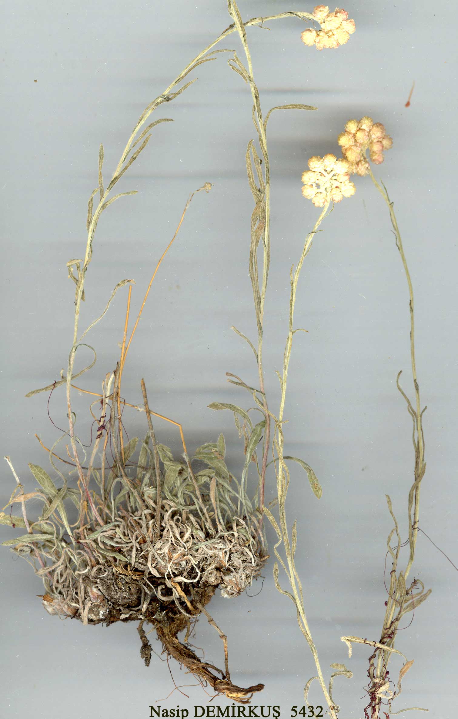 | H. arenarium (L.) Moench, Meth. 575 (1794). Syn: Gnaphalium arenarium L., Sp. PL 854 (1753). Plant grey-adpressed-tomentose, eglandular. Flowering stems 9-46 cm, arising from short stout branched caudices. Sterile shoots with prominently swollen leaf-bases. Basal leaves often crowded, linear-oblanceolate to spathulate, 7-60x1∙5-8 mm; cauline ones narrowing to linear above; sometimes with crisply undulate margin. Capitula numerous, subglobose. Phyllaries ± flat or cucullate, yellow (rarely straw-coloured) or apricot. All flowers hermaphrodite. Fl. 5-8. Dry calcareous or sandy soils; steppe, banks, 250-3200 m. 1. Phyllaries cucullate, apricot, yellow or straw-coloured subsp. rubicundum 1. Phyllaries flat, yellow 2. Leaves undulate; basal leaves 7-20 x 1∙5-4 mm subsp. erzincanicum 2. Leaves not undulate; basal leaves 10-50 x2-8 mm subsp. aucheri subsp. rubicundum (C. Koch) Davis & Kupicha in Notes R.B.G. Edinb. 33:239 (1974). Syn: Antennaria rubicunda C. Koch in Linnaea 17:49 (1843); Helichrysum undulalum Ledeb., Fl. Ross. 2:606 (1845)! H. arenarium (L.) Moench var. plinthocalyx C. Koch in Linnaea 24:348 (1851); if. arenarium wax. rosea Trautv. in Acta Horti Petrop. 1:23 (1871); H. rubicundum (C. Koch) Bornm. in Bull. Herb. Boiss. ser. 2, 7:34 (1907); H. undulatum Ledeb. subsp. rubicundum (C. Koch) Takht. in Takht. & Fedorov, Fl. Erevana 283 (1972). Figure 5, p. 87. Map 11, p. 91. Described from Armenia. E. Anatolia. A9 Kars: Kars to Selim, 1800 m, D. 30662 (ABb)! A/B9 Kars: Iğdir to Tuzluca, 1080 m, M.Zohary & Plitm. 2266-3 (Ab)! B7 Malatya: 3 km E. of Malatya, 920-950 m, Hub.-Mor. 9464 (Ab)! B9 Ağri: nr Diyadin, 1065-1220 m, Hewitt 182 (Ab)! Van: d. Başkale, ispiriz Da., 3200 m, D. 23773 (aB)! Kars: Aralik to Takjaltu, B.Post 2027 (ab)! B10 Ağri: Doğubayazit to Iğdir, 1620 m, M.Zohary & Plitm. 2264-47 (AB)! Kars: Araş valley, 800 m, D. 43818 (AB)! Caucasia, N.W. Iran. Ir.-Tur. element. Within subsp. rubicundum there is variation in both degree of leaf-undulation and phyllary colour. In the preceding specimens, leaves with wavy margins are shown by 'A', straight by 'a'; apricot capitula are shown by 'B', yellow or straw-coloured by 'b'. |