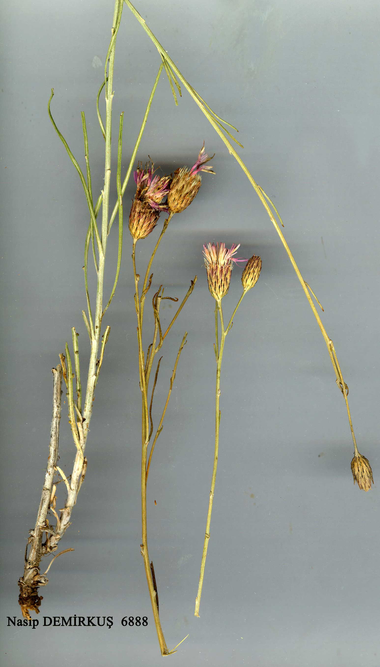 | J. pulchella DC, Prodr. 6:676 (1838). Syn: Serratulapidchella Fisch. & Mey. in DC., loc. cit., nomen pro syn. Map 48, p. 449. Perennial; stems 20-60 cm, adpressed-canescent, woody at base, densely leafy below, sparingly leafy and branched above. Lower leaves pinnatisect, segments and undivided upper leaves linear, 5-60 x 1-2 mm, with revolute margin. Capitula borne in corymbs; branchlets (peduncles) 1.5-8 cm. Involucre ovate-oblong, 12-15 x 6-10 mm; phyllaries c. 5-seriate, lanceolate, strongly adpressed, not spiny, with prominent dark keel (median nerve). Flowers lilac-pink. Achenes 6 mm, coronulate, smooth. Pappus hairs scabrous, slightly longer than achenes. Fl. 7-9. Hillsides, rocky slopes, steppe and fields, 1400-2500 m. Type: [Iran] in collibus sterilissimus circa Khoi prov. Aderbeischan, Szowits (holo. G, photo! iso. K!). E. Anatolia. B9 Van: Van to Hoşap, c. 20 km E. of Haspaşa, 1920 m, Hub.-Mor. 11247! B1O Kars: Pamuk Da., 1500 m, D. 47046b! Ağri: Doğubayazit, 2000 m, Rech. 14965! Van: 10 km N.E. of Başkale. 2500 m, D. 24519! C9 Hakkari: above Koçanis, 1400 m, Nábélek 3923. C10 Hakkari: Zab gorge, 48 km S. of Başkale, D. 23830! Transcaucasia, W. & N.W. Iran. Ir.-Tur. element. |