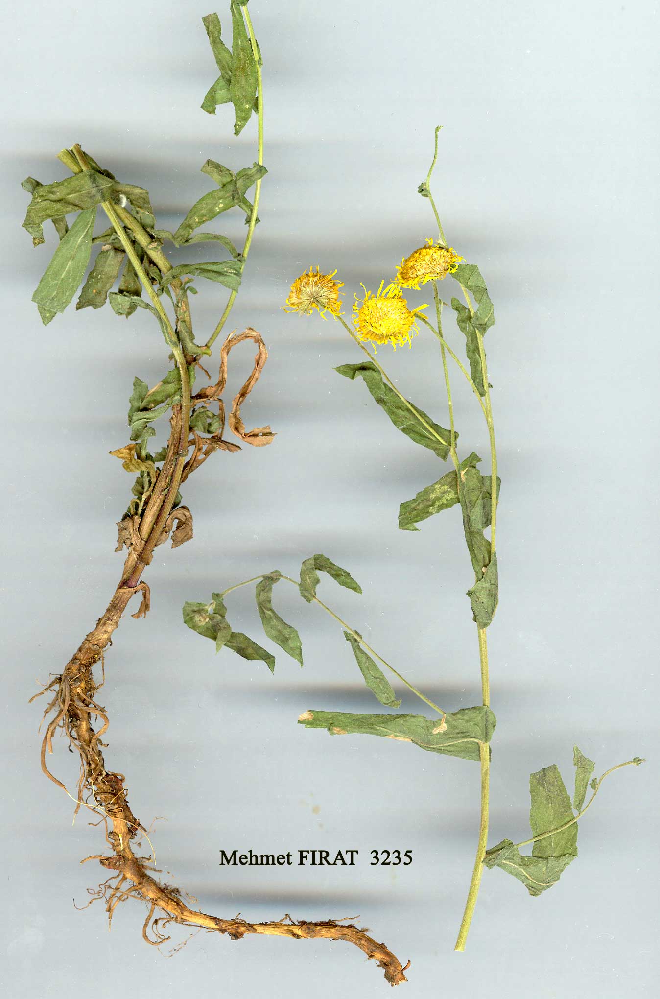 | P. dysenterica (L.) Bernh., Syst. Verz. Pfl. 153 (1800). Syn: Inula dysenterica L., Sp. PI. 882 (1753); P. uliginose Stev. in DC, Prodr. 5:478 (1836); P. dysen-terica var. microcephala Boiss., Fl. Or. 3:202 (1875). Ic: F1. URSS 25: t. 30 (1959). Rhizomatous, floccose-arachnoid or pubescent perennial. Stems 30-75 cm, usually branching at least above. Leaves oblong-lanceolate, 2∙5-6 x 0∙5-1∙5 cm, acute at apex, cordate-auriculate at base, subentire or denticulate, pubescent on both surfaces, glandular beneath. Capitula several (c. 3) or numerous (c. 70) in corymbs. Involucre 0∙7-1 ∙5 cm broad; phyllaries 4-5-seriate, linear-acuminate, 3-5 x 0∙3 mm, pubescent and glandular, often purplish at apex. Ray flowers numerous; ligules 4∙5-7 mm. Disc corollas 3∙25-3∙75 mm. Achenes oblong, 1-1∙25 mm, finely 10-ribbed, sparsely pubescent above. Inner pappus of 15-20 hairs, 3-3∙25 mm. Fl. 7-9. Stream and river banks, often near the coast, s. 1.-1600 m. Described from Europe (Hb. Linn. 999/14!). Widespread, but rare in S.E. Anatolia. A1(E) Tekirdağ: 27 km from Tekirdağ to Malkara, 200 m, D. 47820! A2(E) Istanbul: Silivri, s.1., D. 39216! A2(A) Kocaeli: Pendik to Touzla, t x 1893, Azn.! A3 Bolu: Abant G., 1300 m, D. 32892! A4 Kastamonu: Kastambuli (Kastamonu), Sint. 1892:4966! A5 Amasya: nr Amasya, Maniss. 91! A6 Samsun: Boraboy, 900 m, Tobey 2299! A8 Erzurum: 3 km S. of Tortum G., 1150 m, D. 47511! Bl Izmir: Karagöl, Yamanlar Da., 800 m, Oflas et al.(EGE 6203)! B5 Kayseri: 5 km S. of Ürgüp, 1100 m, Roper 159! B6 Maraş: d. Elbistan, Kapidere, D. 20413! B7 Malatya: 10 km E. of Kale, 690 m, Buttler 15787! B8 Diyarbakir: 70 km from Diyarbakır to Bitlis, McNeill 506! B9 Van: 5 km N. of Çatak, D. 23180! Cl Aydin: Samsun Da., 400 m, D. 18348! C2 Denizli: Acıpayam to Abbas, D. 13293! C3 Antalya: Kaş, Elmalı to Finike road, Khan et al. 206! C5 Niğde: Ulukişla, 1200 m, D. 16524! C6 Hatay: above Yeşilkent, 305 m, Darrah 597a! Is: Khios, Kampos, Platt 600! Kos, Hansen 429. Europe (Britain to C. Russia), N. Africa. Because of variation in size and number of capitula, some believe that the plants with more numerous capitula and smaller flowers should be placed in a separate species, P. uliginosa Stev., which corresponds to P. dysenterica var. microcephala Boiss. However, although large and small individuals may be observed among collections, there is every stage of intermediacy between them and it seems better to regard this as a unified species. |