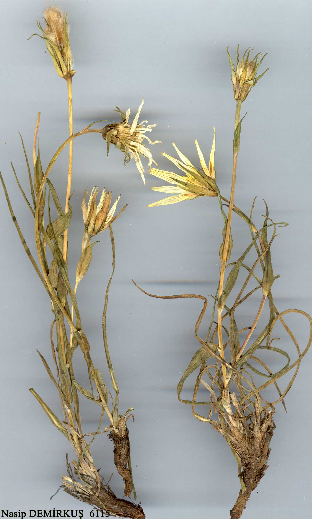 | T. reticulatus Boiss. & Huet in Boiss., Diagn. ser. 2(3): 90 (1856). Figure 25, p. 661. Sparsely floccose to glabrous perennial, 10-60 cm, base of stem with fibrous remains of old leaf bases, often very dense. Stems little-branched or unbranched. Leaves linear to narrowly linear, 3-15 mm wide, margin flat or undulate. Peduncles not thickened below capitula. involucre often floccose at base. Phyllaries (5-)8(-10), lanceolate, shorter than flowers, 2-3 cm in flowering capitulum, 2.5-4.5 cm in fruiting capitulum. Flowers yellow, often turning bluish when dry. Achenes 18-30 mm, whitish-fawn, with 5 longitudinal rows of remote scales, beak ± equal to or slightly shorter than achene, clavate at apex. Pappus 20-23 mm, pale greyish-brown, annulus hairy. Fl. 4-9. Stony slopes, meadows, damp places, 450-3350 m. Type: [Turkey B8] in Armenia prope Erzeroum, Huet du Pavilion. N.E. & E. Anatolia. A7 Trabzon: Zigana Da., 1600 m, Tobey 1993! Gümüşane:Kurdomer, 9 vii 1894, Sint. s.n.! A8 Çoruh: Mağara Y., Şavval Tepe, Murgul, 2400 m, Stn. & fiend. 6041! Erzurum: ridge E. of Ferik Da., E.S.E. of Ispir, Barclay 960! A9 Kars: Yalnizçam, 1900 m, D. 29615! Çoruh: 1 km from Ardanuç, 450 m, Hub.-Mor. 15906! B7 Tunceli: 8 km from Pülümür, 1760 m, Reese (Hub.-Mor. 16869)! Erzincan: Eğin (Kemaliye), Sint. 1890:2272! B9 Van: Çuhgediği pass between Hoşap and Başkale, 2820 m, Hub.-Mor. 11287! Bitlis: Pelli Da. above Pelli, 2590 m, D. 22454! Hakkari: Kara Da., 3350 m, D. 24417! B10 Kars: Gt. Ararat (Büyük Ağri Da.), 2400-2700 m, B.Post 2116! C10 Hakkari: Cilo Da., Djezra, 2800 m, Nábělek 3746! Caucasia. Close to T. graminifolius DC. from Caucasia and Iran with which it may be synonymous (see p. 668). A specimen from A9 Kars (Sarikamiş, 2100 m, D. 30779!) matches the material of T. reticulatus but has white flowers. |