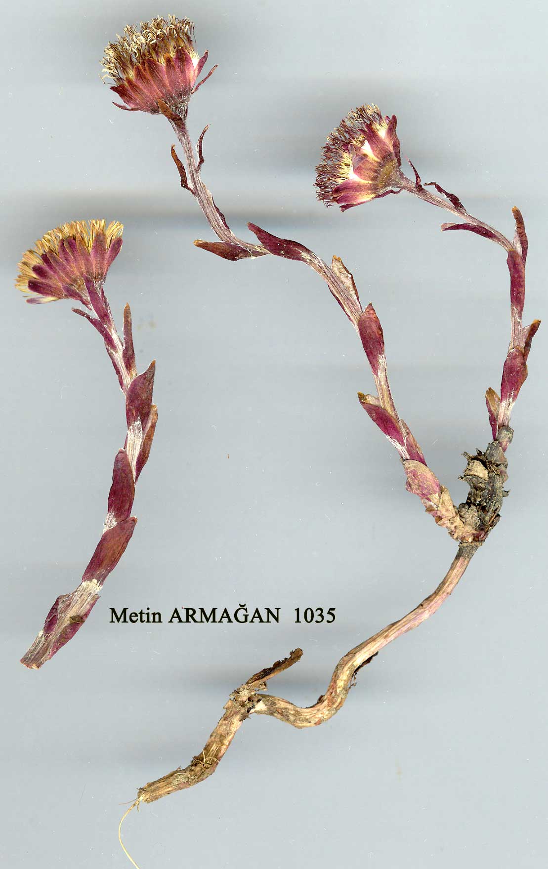 | T. farfara L., Sp. Pl. 865 (1753). Ic: Ross-Craig, Draw. Brit. Pl. 16: t. 20(1961); Polunin, Fls. Europe t. 149 (1969). Leaves petiolate, lamina 10-20(-30) cm diam., with rather acute lobes, margin irregularly toothed, at first white-floccose on both sides, becoming glabrous above. Scapes 4-15 cm (lengthening in fruit to c. 30 cm), with numerous purplish scale-leaves, floccose, erect in bud, nodding after anthesis. Capitula 1.5-2.5 cm broad. Phyllaries linear, obtuse, often purplish and white-hairy, sometimes with black glandular hairs. Achenes 3-4 mm. Pappus 10-15 mm. Fl. 3-4. Waste and sandy places, damp ground, s.1.-2400 m. Described from Europe (Hb. Linn. 995/10, photo!). Widespread except in E. Anatolia; commonest in N. Turkey. A1(E) Tekirdağ: Gölçük Köyü, A.Baytop (ISTE 13503)! A1(A)Çanakkale: Renkoei (Erenköy). Sint. 1883:279! A2(E) Istanbul: Therapia (Tarabya), 29 iii 1896, Azn.! A2(A) Istanbul: Beicos (Beykoz), 16 ix 1900, Azn.! A3 Bolu: below Abant G., 1200 m, D. 37268! A4 Kastamonu: Tosya, Karadere to Devrendi, Sint. 1892:3830! A5 Samsun: Çetirli Pinar Köy, Bafra, 70 m, Tobey 450a! A6 Samsun: 3 km N. W. of Samsun, 10 m, Tobey 450! A7 Gümüşane: above Gümüşane, Sint. 1894:5429! A8 Erzurum: Kop Da. pass, 2400 m, Tobey 2069! Bl Izmir: Yamanlar Da., Kara G., 13 iii 1969, Fitz & Spitz.! B4 Ankara: Beynam Orman, Kasapligil. B6 Sivas: Sivas, Maunsell! B7 Elaziğ: Maden, Romieux s.n. B8 Erzurum: nr Erzurum, Calvert & Zohrab! C2 Antalya: Ak Da., 1300 m, Sorger 68-25a-10! C3 Isparta: Dedegöl Da., 1400 m, Sorger 66-45-7! C4 Konya: 20 km W. of Konya, 1300 m, 2 iii 1969, Fitz & Spitz.! C5 Niğde: Ulukişla to Pozanti, 900 m, D. 26309! C6 Hatay: Amanus, Hasan Beyli to Osmaniye, 500-800 m, Haradj. 3940. Is: Samos, Runemark & Snogerup 19418. Europe except extreme N., N. & W. Asia, N. Africa. Euro-Sib. element. Introduced in N. America. The leaves of this species are medicinal. |