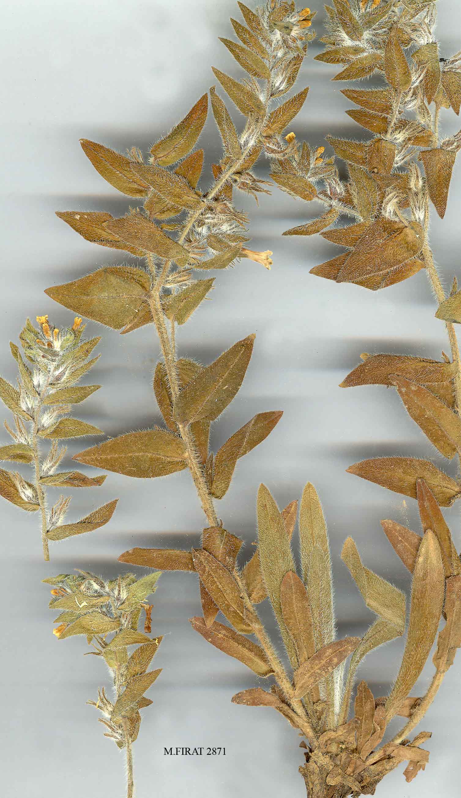 numerous, spreading, 1-3 mm, tuberculate at base, ± without intermediates between short pubeseent and longer setiform hairs. Basal-leaves linear-lanceolate with entire margins, 6-20x0.7-2 cm; cauline lanceolate to elliptic, 4-8 x 1-2 cm. Cymes 10-25 cm in fruit. Bracts lanceolate to ovate, 1-6x0.5-2.5 cm. Calyx 8-10 mm in flower, 13-15 mm in fruit, densely covered with setiformhairs. Corolla yellow, glabrous outside, 10-20 mm, limb 5-8 mm diam. Nutlets 4-6 mm diam., scrobiculate-reticulate; beak strongly deflexed. Fl. 5-7. Fields, rocky slopes, steppe, Quercus scrub, 1000-2500 m. Type: [Turkey B9 Siirt] Südseite des Passes Aghzi Gedik, 10 km nördlich von Mukus, 2500 m, 24 vi 1939, Frödin 147 (holo. W! İso. UPS). , E. Anatolia. B7 Erzincan: Çağlayan, 1700 m, Karamanoğlu 66-38! Tunceli: 16 km N. of Tunceli, 1000 m, Hub.-Mor. 11060! B8 Siirt: Halkis Da. above Şeyhan W. of Sason, 1000-1500 m, Watson et al. 1204(!). B9 Bitlis: 5-8 km N.W. of Tatvan, 1800 m, D. 43353! Van: 5 km W. of Gevaş, 1670 m, Hub.-Mor. 11055! C9 Hakkari: Çukurca, 1300 m, 22 v 1966, Eiselt(!). Endemic. Ir.-Tur. element. Related to A. cordifolia. |