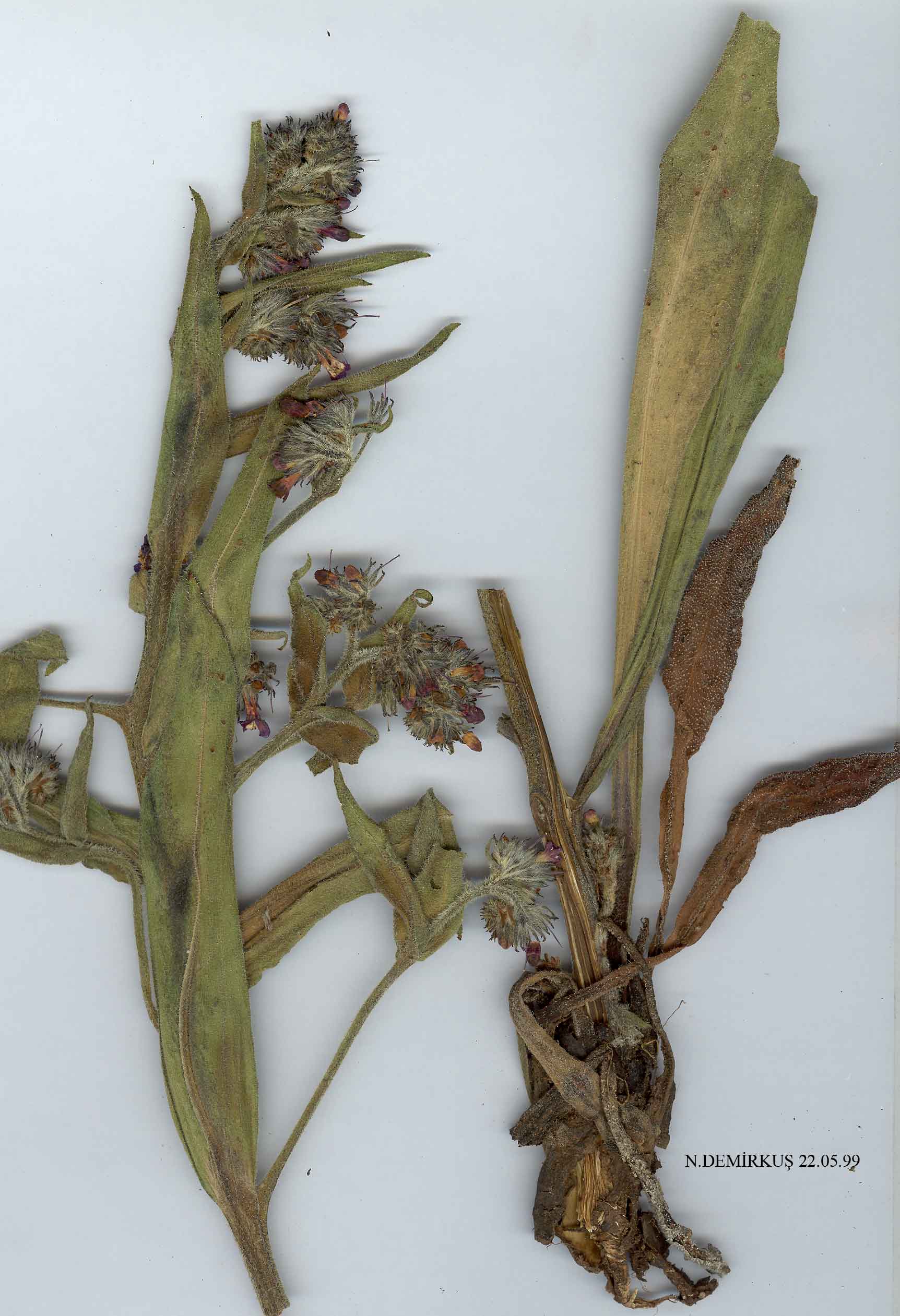| A. leptophylla Roemer & Schultes, Syst. Veg. 4:90 (1819). Syn: A. ochroleuca Bieb. var. canescens Boiss., Fl. Or. 4:151 (1875). Strigulose to canescent-strigulose biennials or perennials; stems erect,40-70cm, ± simple to much-branched. Leaves linear, 60-110 x 6-8(-18) mm, entire. Inflorescence sericeous to ± spreading-strigulose, elongating in fruit; bracts ovate-lanceolate, minute. Calyx 4-9 mm in flower, elongating in fruit, divided to 1/3-1/2 into obtuse lobes. Corolla usually bright blue with white throat, occasionally white to yellow; tube 6-10 mm, lobes 2-4 mm. Nutlets 2-3 x 2.5-4 mm, obliquely ovoid. Fl. 6-7. Rocky slopes, sandy steppe, 800-3000 m. 1. Calyx 7-9 mm in flower; corolla tube 8-10 mm subsp. tomentosa 1. Calyx 4-6(-7) mm in flower; corolla tube 6-8 mm 2. Calyx divided to 1/2 or more, ± spreading-hairy, indumentum sometimes sparse; stems branched copiously throughout subsp. incana 2. Calyx divided to c. 1/3, densely sericeous; stems branched only near base subsp. leptophylla subsp. incana (Ledeb.) Chamb. in Notes R.B.G. Edinb. 35(3):298 (1977). Syn: A. incana Ledeb., Fl. Ross. 3(1): 117 (1847); A, angustissima C.Koch in Linnaea 22:633 (1849); A. aspera Boiss. in Ann. Sci. Nat. 4(2):243 (1854); A. boissieri Bornm. & Guşul. in Bul. Fac. Stiinte Çern. 1(2):242 (1927). Ic: Feddes Rep. 26: t. 93 f. A-E (1929), as A. angustissima. Map. 24, p. 395. Type: [Turkey A9 ?] in provinciis Caucasicis versus fines Turcicae, Nordmann (LE). N. Turkey & Inner Anatolia. A1(E) Edirne: Enez, s.l., Coode & Jones 2894! A4 Ankara: Çubuk valley, 10 vi 1932,Kotte! A5 Amasya: Köle mazar, nr Amasya, Maniss. 727! A7 Gümüşane: Gümüşane to Zigana, 1100 m, Balls 287! A8 Rize: Hemşin, 1700 m, C.Koch (type of A. angustissima). A9 Kars: nr Çildir (Grossheim 7: map 290). B5 Kayseri: Kelgin to Gücen, Gözler (lSTE 12039)! B7 Erzincan: Keşiş Da., above Cimin, 2700 m, D. 31824! B8 Erzurum: Palandöken Da., 2400 m, D. 47406! B9 Erzurum: E. of pass between Ağri and Horasan, 2450 m, Lamond 2587! C4 Konya: Karapinar, Birand & M.Zohary 7104! C5 Niğde: 8 km N. of Pozantı, 1200 m, Coode & Jones 1233! Endemic. Ir.-Tur. element? The following have the sericeous indumentum of |
