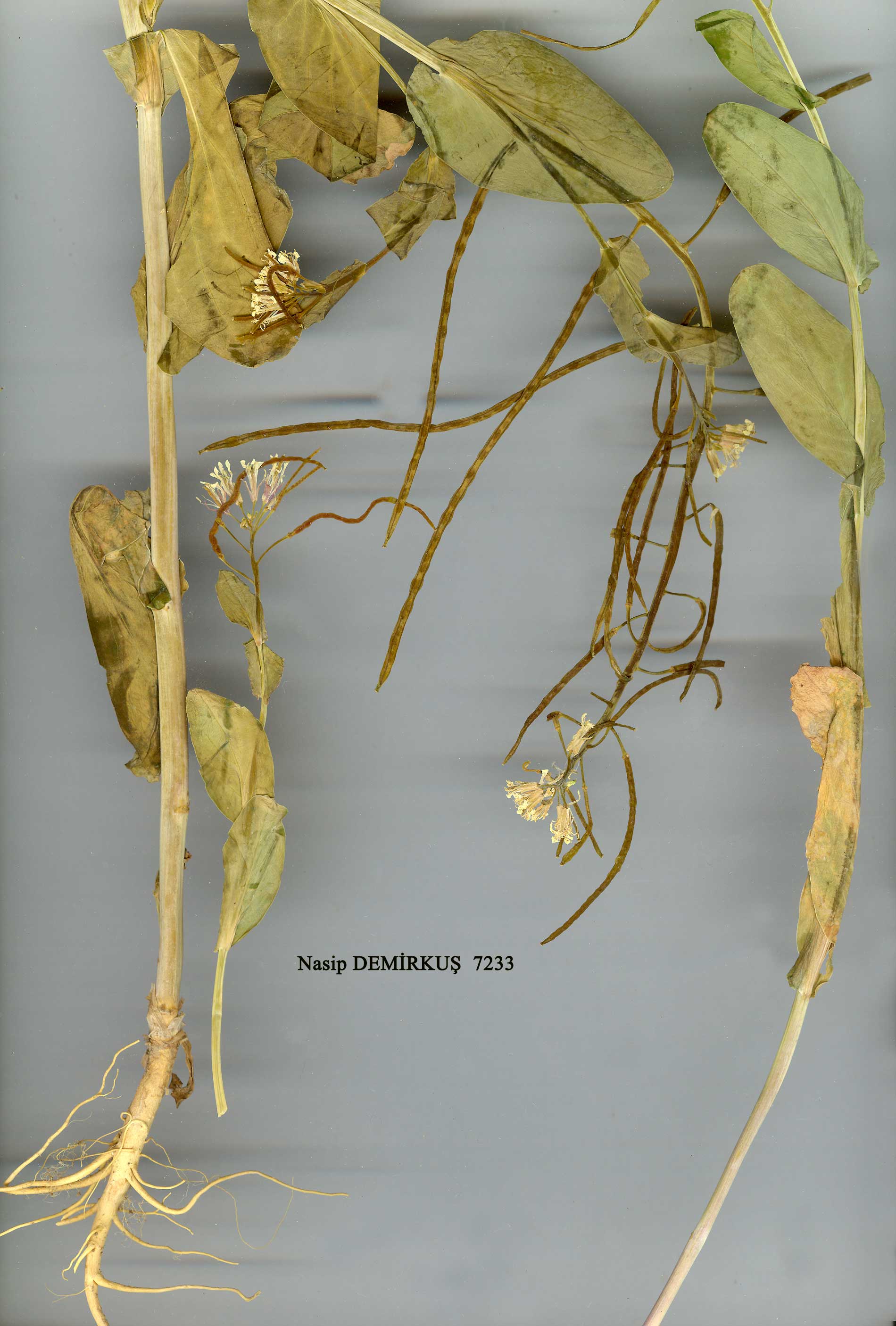 | C. orientalis (L.) Andrz. in DC, Syst. 2: 508 (1821). Syn: Brassica orientalis L., Sp. PL 666 (1753). Ic.: Ross-Craig, Draw. Brit. PL 3: 45 (4949). Figure 11, p. 253. Annual, 19-60 cm, usually unbranched. Basal leaves obovate, subsessile. Stem leaves 2-6 cm, oblong-elliptic, apex slightly emarginate or entire, cordate, am-plexicaul at base, often tinged violet. Pedicels 4-15 mm, erect-spreading. Outer sepals linear inner larger, oblong-saccate. Petals 8-12 x 4 mm, pale creamy-white. obovate, gradually narrowed into the claw. Stamens ± equal. Stigma capitate. Siliquae usually irregularly spreading, tetragonous, straight or curved, 6-9 cm*1-2.5 mm. shortly beaked: valves clearly 1-nerved. Seeds darkish-brown, papillose. Cotyledons incumbent. Fl. 3-5. Cultivated ground, waste places. 50-2000 m. Described from Armenia (Hb. Linn. 844/1 photo.!). Scattered, chiefly in the N. A1(A) Çanakkale: Erenköy, Sint. 1883: 81! A2(E) Istanbul: Florya, 50 m, /t. Leyd. 1959:47! A2(A) Istanbul: Prinkipo (Büyük Ada), 26 v 1901, Azn.! A3 Bolu: Abant G., 9 vii 1940,Post! A5 Amasya: Amasya, Bornm. 1889: 399b. Kastamonu: Tosya, Sint. 1892: 4110. A7 Gümüşane: Kel-kit, 1600 m. Stainton 3433! A8 Çoruh: nr. Hopa (Grossheim 4: map 207). A9 Kars: Sarikamiş to Selim, 1900 m, D. 29544! B3 Konya: Sultan Da., 1300 m, Wall. B9 Muş: Malazgirt, 1500 m, Schischkin. C4 Konya: Konya to Çumra, 980 m. Helbaek 2355! C5 Niğde: Ulukişla to Ereğli. 1060 m, Hııb.-Mor. 13791. Is.: Lesvos. Cand. S. & C. Europe, N. Africa, Iran, Iraq, Caucasia, W. Pakistan, Afghanistan. |