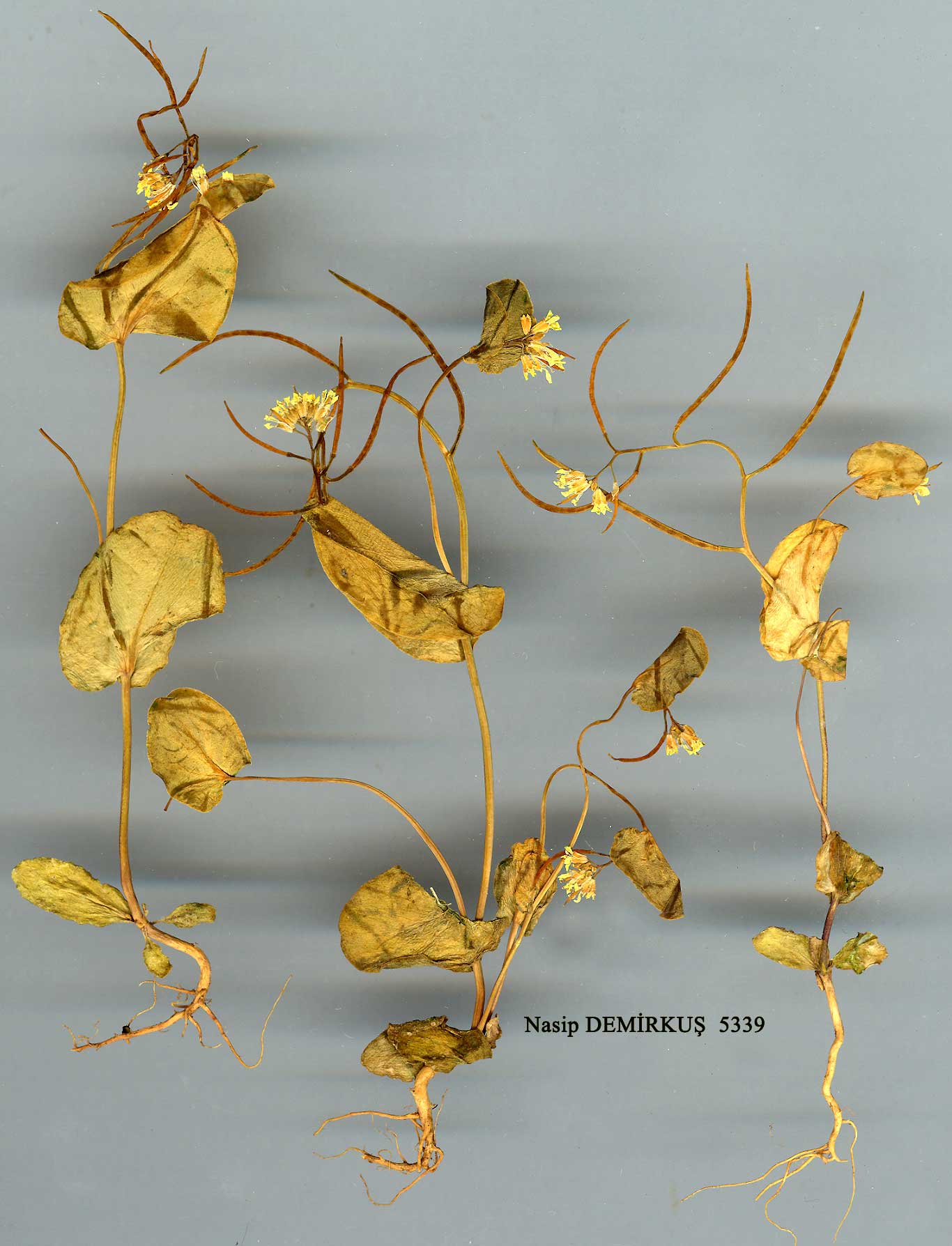 | C. persica Boiss., Diagn. ser. 1(6): 12 (1845). Ic.: Solms in Bot. Zeit. 64: t. 2, f. 7-8 (1906). Annual 5-25 cm, branched from base or sub-simple, often violet-stemmed. Leaves ovate-elliptic, deeply cordate at base. Pedicels c. 2 mm in flower, c. 4 mm in fruit. Sepals equal, none saccate. Petals small, 5x2 mm, yellow or deep yellow, oblong, slightly broader towards apex, sometimes veined with purple. Stamens ± equal. Stigma rather indistinctly bilobed. Siliqua erect, loosely adpressed to stem, 2-4 cm x 1.5 mm with a very short punctiform stigma and several indistinct nerves. Seeds pale brown, papillose. Cotyledons incumbent. Fl. 3-5. Cultivated land, roadside, 1000-2000 m. Type: [Iran] prope Schiraz et in convallibus superioribus montis Kuh-Barfi, Kotschy 339 & 251a (K!). Armenia. Turkish Armenia; Culvert! A8 Erzurum: Tortum G.. 1070 m, Hub.-Mor. 14795. A9 Kars: Kars. 1800 m. D. 29567! B9 Ağri: banks of river Murat, Schischkin. Muş: Malazgirt, Schischkin. Caucasia. Iran, N. Iraq, Afghanistan. |
