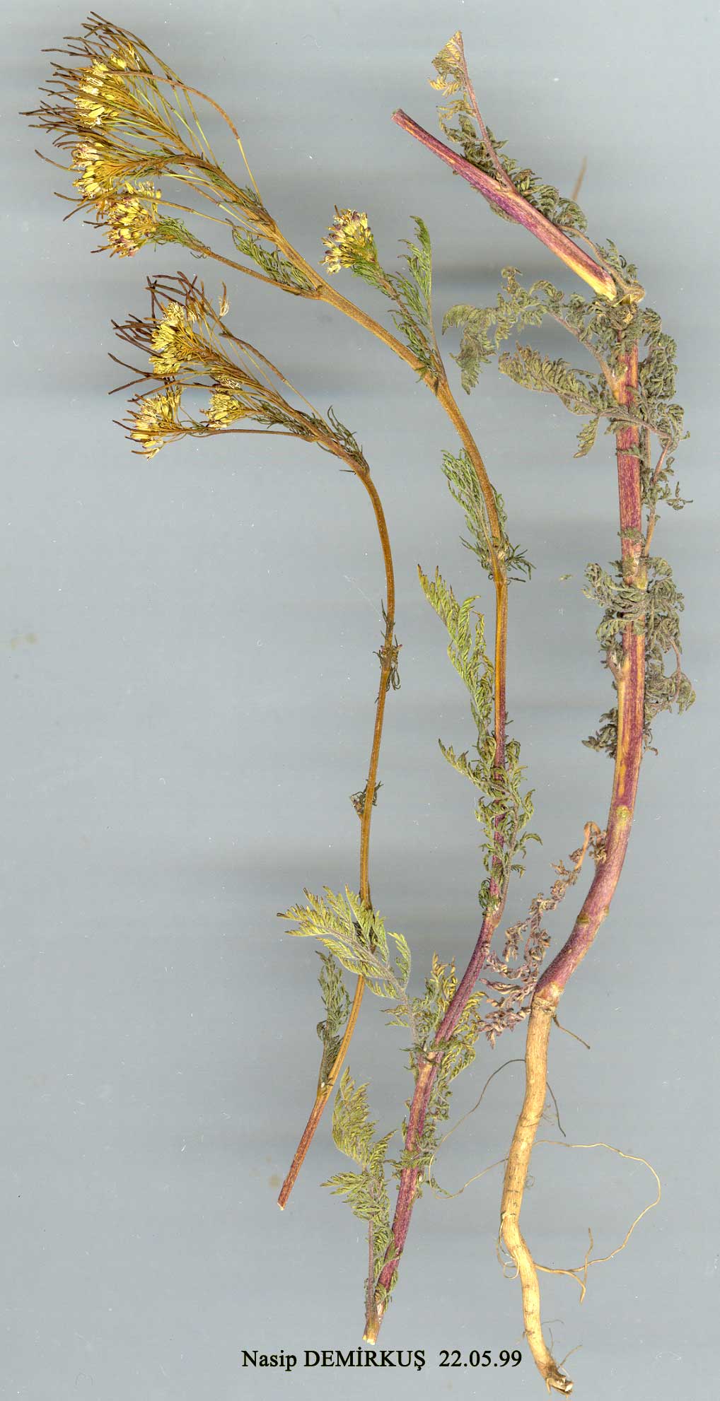 | D. sophia (L.) Webb ex Prantl, Pfianzenfam. 3(2): 192 (1890). Syn: Sisymbrium sophia L., Sp. PI. 659 (1753). Ic.: Ross-Craig, Draw. Brit. PL 3: 42 (1949). Figure 12, p. 255. Annual or biennial herb, 30-80 cm, stems erect, simple and branched in the region of inflorescence or branched from base, glabrous or more commonly with a greyish indumentum of stellate and simple hairs below, glabrescent above. Basal leaves long-petiolate, 2- or 3-pinnatisect with linear segments; cauline leaves ± sessile, 2- or S-pinnatisect, rarely simply pinnatisect. Inflorescence long. Petals (2-)2.5-4 x 0.5-1 mm, pale yellow, slightly longer than sepals. Fruiting pedicels spreading or erect-ascending, (5-)10-15 mm. Fruit 13-35 x 0.5-1 mm, straight or slightly curved, ± torulose; style very short. Fl. 4-6. Waste places, 300-1700 m. Described from Europe (Hb. Linn. 836/3.1 photo.!). Widespread. A2(E) Kocaeli: Tuzla (SE of Pendik), 31 v 1896, Azn.! A5 Amasya: Amasya, Bornm. 1889: 1329. A6 Tokat: Tokat, Bornm. 1893: 3239! A7 Giresun: below Tamdere, 1600 m, D. 20692! A9 Kars: nr. Kars & Kağizman (Grossheim 4: map 193). Bl Çanakkale: Troy, Schmidt. B3 Konya: Akşehir, 1000 m, Bornm. 4069. B4 Konya: Yavşan Memlehasi, D. 18690B! B6 Sivas: Gürün, 1400 m, Stn. & Hend. 5243! B7 Elaziğ: Elaziğ to Hazar G., 850 m, D. 28978! B8 Erzurum: Pasinler to Horasan, 1700 m, D. 29450! B9 Van: Darma-köy, Tchitouny 264. C2 Denizli: Tavas to Denizli, 800-900 m, D. 35559! C3 Konya: Beyşehir, 1100 m, It. Leyd. 1959: 928! C4 Konya: Konya to Çumra, 980 m, Helbaek 2350! C6 Urfa: Birecik, Sint. 1888: 391! C8 Mardin: Mardin, Post. Widespread in Eurasia, N. Africa. Variable in most characters, especially leaf lobing. In some specimens the leaves are only simply pinnatisect. Differs from the European material in having the petals about twice as large. A complex species in which further investigation might reveal several recognisable taxa. |