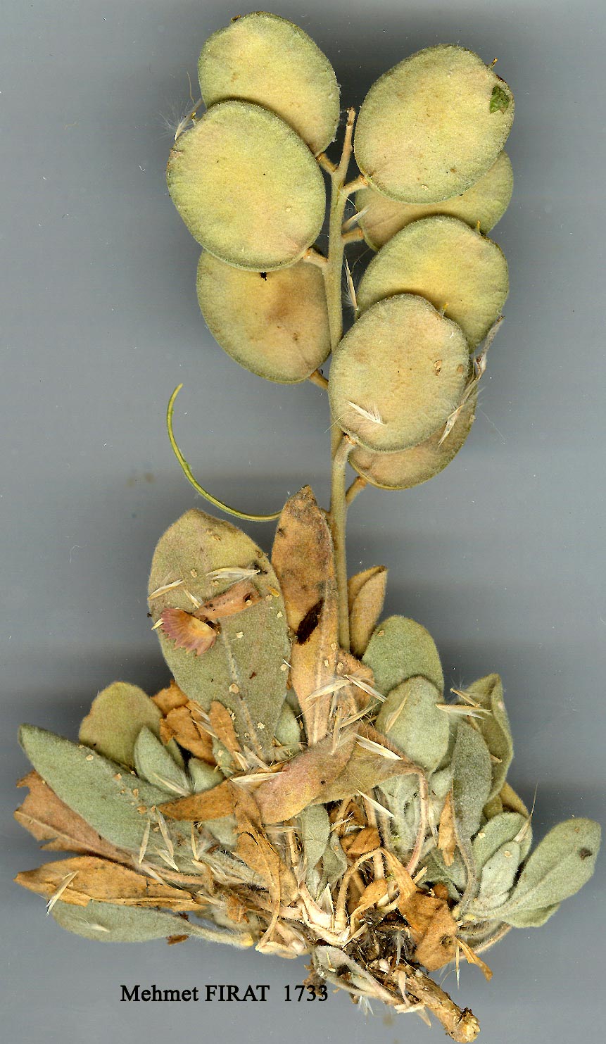F. lunarioides (Willd.) Sibth. & Sm., Fl. Graeca. 7:22, t. 625 (1830). Syn: Alyssum lunarioides Willd., Sp. PI. 3(1): 461 (1800). Small shrub, stems up to 30 cm, stellate-hairy. Leaves oblong-oblanceolate, entire, canescent with stellate hairs. Fruiting raceme somewhat conferted. Sepals 7-9 mm. Petals yellow, 12-16 mm. Siliculae obovate to elliptic, somewhat acute at both ends, asperous-canescent with stellate hairs. Seed wing about as broad as seed. Fl. 4. Limestone cliffs. |