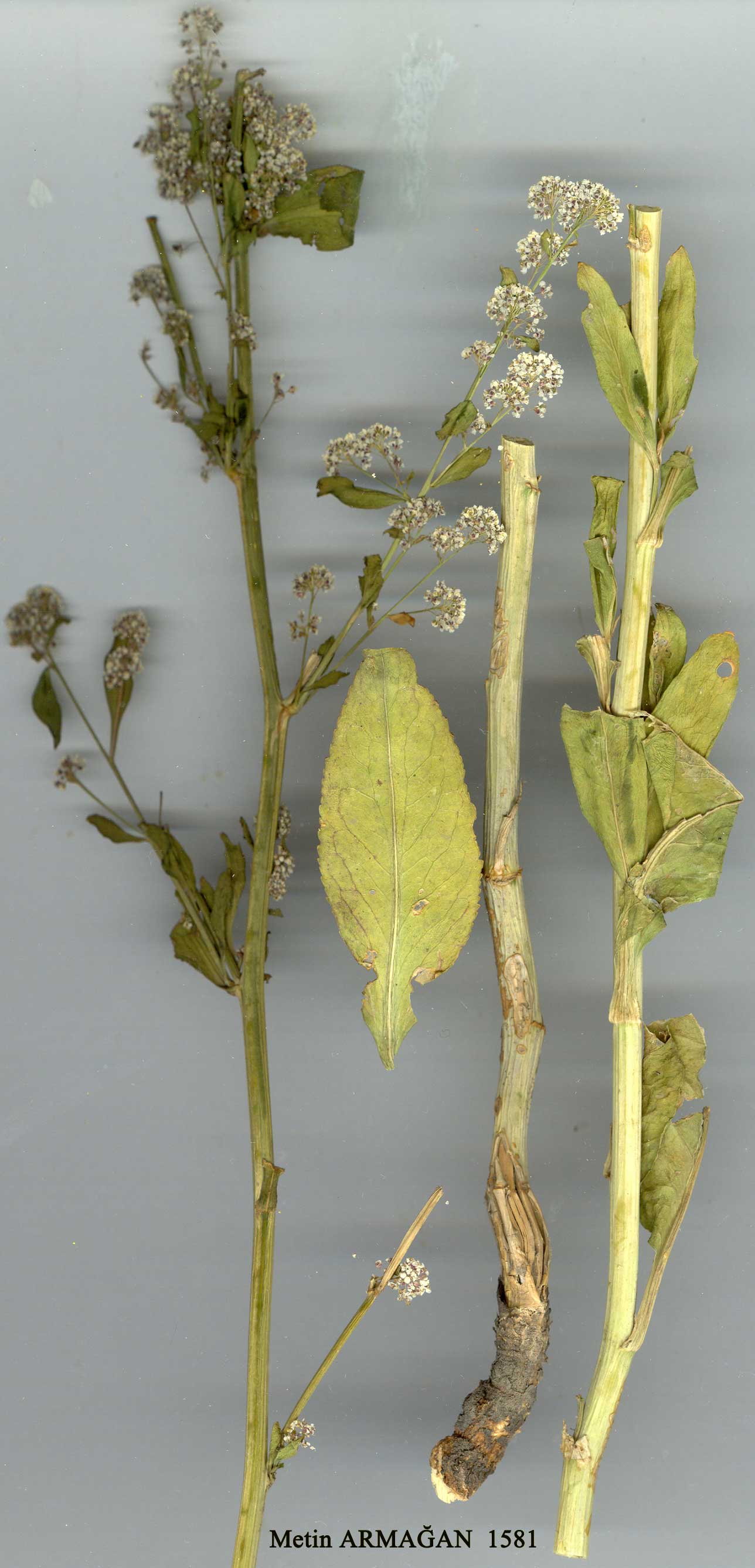 | L. latifolium L., Sp. PL 644 (1753). lc.: Ross-Craig, Draw. Brit. PI. 3: 61 (1949). Figure 10, p. 251. Perennial up to 1 m, stoloniferous, flowering stems single, much branched in region of the dense paniculate inflorescence, glabrous or rarely pubescent. Basal leaves long-petiolate, simple, ovate-lanceolate, toothed at margins, glabrous or velutinous with stellate hairs (var. velutina). Cauline leaves lanceolate sessile. Petals white or pale pink, 2.5-3 * 1.5 mm, obovate-orbicular, distinctly clawed. Fruiting pedicels slender, 3-5 mm. Siliculae orbicular to obovate, 1.5-2 * 1-2 mm without apical sinus. Stigma capitate, sessile. Fl. 5-7. Marshy places, edge of cultivation, s.1.-1500 m. Described from Europe (Hb. Linn. 824/1 la!). Widespread. A1(A) Çanakkale: Renkoi (Erenköy), Kirk! A2(E) Istanbul: Küçük Çekmece, 19 vii 1917. Azn.! A5 Kastamonu: Tosya, Sint. 1892:4975! A9 Kars: nr. Kağizman (Grossheim4: map 135). Bl Izmir: Izmir, Bal. B2 Uşak: west of Uşak, Reese. B3 Kütahya: Eskişehir to Kütahya, 900 m, Dudley, D. 36088! B4 Ankara: Mogan G., D. 13074! B5 Nevşehir: Nevşehir, 1200 m, D. 19098! B6 Maraş: nr. Göksun, Post 175! B7 Diyarbakir: nr. Ergani, Post 308! Malatya: 27 km S of Arapkir, 1380 m, Reese. B8 Erzurum: west of Tercan, 1500 m, D. 30946! B9 Ağri: nr. Aralik, Post 2039! C2 Denizli: Hierapolis (Pamukkale), Reese. C5 Seyhan: Pozanti, Siehe 1896: 646! C7 Adiyaman: nr. Kjachta (Kahta), Hand.-Mazz. Is.: Lesvos, Cand. Throughout Europe & S.W. Asia, N. Africa. |