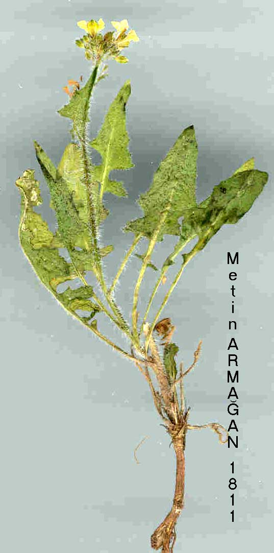 | R. sylvestre(L.) Bess., Enum. PL Volhyn. 27 (1822). Syn: Sisymbrium sylvestre L., Sp. PL 657 (1753); Nasturtium sylvestre (L.) R. Br. in Aiton, Hort. Kew, ed. 2, 4: 210 (1812). I?: Ross-Craig, Draw. Brit. PL 3: 5 (1949). Figures 12, 19, pp. 255, 435. Stoloniferous perennial herb. Stems ascending to erect, 12-60 cm, furrowed, ± glabrous. Leaves all pinnate to pinnatisect (very rarely the uppermost almost entire), with oblong, toothed segments. Petals bright yellow, 3-5 mm, clearly exceeding the sepals. Fruits siliquiform, linear, often curved, 7-18 mm, borne on horizontal or somewhat ascending pedicels. Fl. 6-9. Marshes, swampy ground, river banks, etc., very rarely in cultivated land, s.1.-1800 m. Described from Switzerland, Germany & France (Hb. Linn. 836/6!). Widespread. Al Edirne: nr. Maritsa (Meriç), Davidov. A2(E) Istanbul: Rumelihisarı, Post ! A3 Bolu: Abant G., Khan et al. 541! A5 Amasya: Tersakan Valley, Çetik! A6 Ordu: Ordu, Hand.-Mazz. 1035. A7 Trabzon: between Trabzon & Bayburt, 1853, Huet! A8 Rize: Rize, Post 1910: 2002! Bl Çanakkale: Pınarbaşı, Sint. 1883: 1013! B2 Kütahya: Gediz to Kütahya, 1000 m, D. 36909! B4 Ankara: Ankara, Çubuk Su, D. 21432! B9 Muş: Malazgirt, 1500 m, Schischkin. C2 Muğla: Girdev G., 1800 m, D. 13753! C3 Antalya: Serik to Karanlik Sokak, 150 m, Tengwall! C4 Konya: d. Çumra, Küçük Köy, 980 m, Helbaek 2669! Temperate Eurasia. Very variable. R. prolifera (Heuff.) Neilr., which is said to differ from R. sylvestre in having numerous short, branched racemes and smaller fruits, has been recorded for Turkey by Bornmüller (Feddes Rep. Beih. 89(1): 28, 1936). However, its diagnostic characters occur in combinations with characters of R. sylvestre in many of the specimens cited above, and it therefore does not seem worthy of specific recognition. |