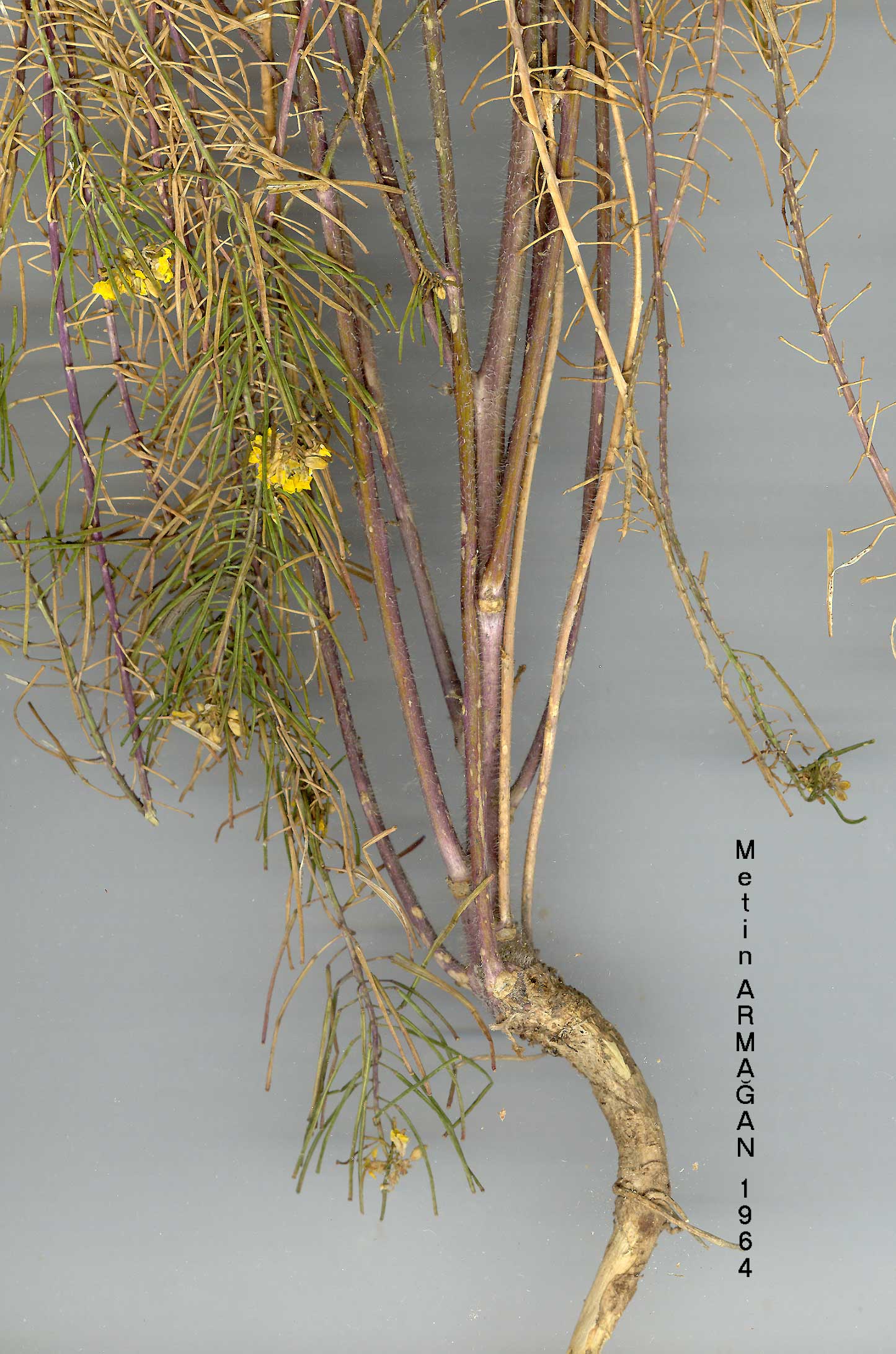 | S. loeselii L., Cent. PL 1: 18, n. 49 (1755). Syn: S. glabratum Schulz, op. cit. 99 (1924)! I?: Fiori, I? Fl. Ital. 1: t. 1350 (1899). Annual, biennial or perennial, 20-100 cm, with an indumentum of long down-wardly directed white hairs, or glabrous. Basal leaves not rosette-forming, lyrate-pinnatipartite with a large hastate or triangular terminal lobe. Cauline leaves with hastate-lanceolate terminal lobe and 2-3 pairs of lateral lobes. Petals 5-7 x 2.5-3.5 mm, bright yellow; blade broad-obovate with a long narrow claw. Fruit-ing pedicels 6-12 mm, erect-spreading. Siliquae 10-35(-46) x c. 1 mm, straight or curved; valves thin-walled, thinly 3-nerved; style c. 0.5 mm; stigma deeply bi-lobed. Seeds slightly papillose. Radicle incumbent or oblique. Fl. 3-6. Rocky slopes, roadside, near cultivation, s. 1.-1800 m. Described from Europe (Hb. Linn. 836/40, photo.!). Widespread. A1(E) Edirne: Edirne, Dingier. A2(A) Bilecik: Bilecik, Dingier. A4 Zonguldak: Amasra peninsula, sea level, Khan et al.777! A5 Amasya: Yeşilirmak valley, Cetik! A7 Gümüşane: Artabir (Ertabil), Sint. 1894: 7326! A8 Çoruh: nr. Artvin (Grossheim 4: map 175). A9 Kars: Kars to Susuz, 1800 m, D. 30647! B2 Kütahya: Gediz to Kütahya, 1000 m, D. 36940! B3 Konya: Akşehir, 1000 m, Bornm. 4070. B4 Ankara: Ankara, Warburg & Endlicher 751. B6 Malatya/Maraş: Göksu, Nâbëlek 1277. B7 Malatya: west side of Bey Da., Çaliken, 1380 m, Hub.-Mor. 10092. B8 Erzurum: Pasinler to Horasan, 1700 m, D. 29447! B9 Ağri: Ağri Da. (Grossheim 4: map 175). C5 Seyhan: Adana, Siehe. C8 Mardin: Mardin, 1200 m, D. 28333! C9 Hakkari: Hakkari, Nâbëlek 1446. C. Europe, Balkans, Caucasia, Syrian Desert, N. Iraq, Iran, Afghanistan, C. Asia. Variable in leaf shape, indumentum, fruit length and the size of the stigma. |