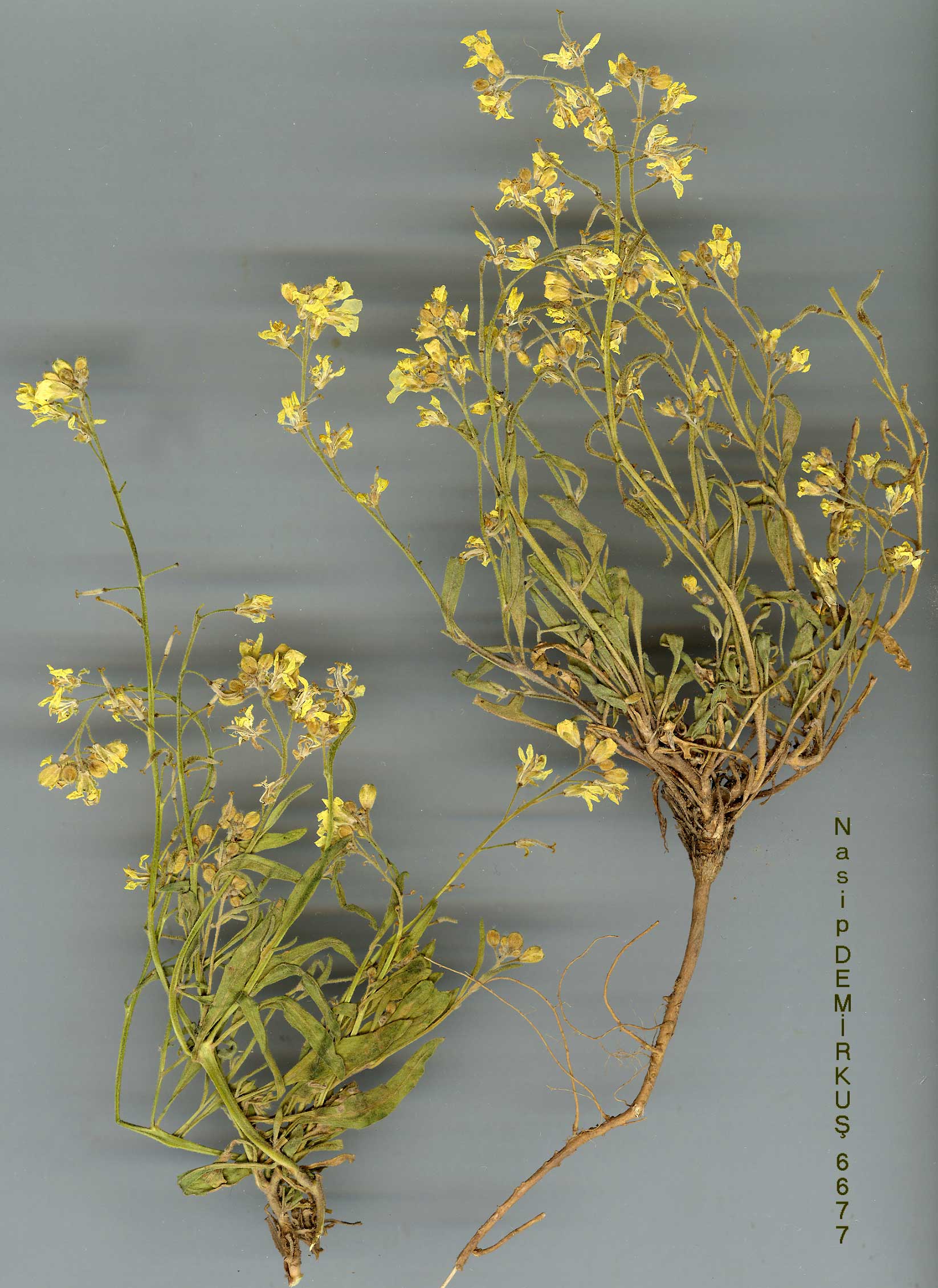 | S. incanum Bieb., Fl. Taur.-Cauc. 3: 444 (1819). Syn: Cheiranthus torulosus Bieb., Fl. Taur.-Cauc. 2: 121 (1808), non Thunberg (1800); Sterigma tondosum (Bieb.) DC., Syst. 2: 580 (1821); Sterigmostemum torulosum (Bieb.) Stapf in Denk. Akad. Wiss. Wien, Math.-Nat. Kl. 51: 301 (1886). Ic: Takhtajan & Fedorov, Atlas Risunkov K Flore Erevana', t. 45 (1946). Biennial herbs, somewhat glaucous, the whole plant with an indumentum of stellate hairs, and longer, stipitate, glandular hairs. Stems branched, erect, up to 50 cm. Lower leaves lanceolate, dentate to pinnatifid. Upper leaves usually entire. Petals 6-9 mm, yellow. Siliquae contorted, twisted, scabrid with glandular hairs. Stigma bifid, the lobes spreading, 0.5 mm long. Fl. 6. Calcareous steppe, 1000 m. Type: in Iberia, Steven. Scattered in C. & E. Anatolia. A8 Gümüşane: Bayburt, 24 vi 1862, Bourgeau! A8 Erzurum: Ispir to Tortum, Huet! B6 Malatya: Gürün to Darende, 1000 m, D. 21941! B8 Erzurum: Erzurum, Tchihatcheff. B9 Van: Varak Da., 1899-1900,Maunsell. A9 Kars: Kağizman, & B9 Kars: nr. Iğdir (Grossheim 4: map 284). C4 Konya: Karapinar, Zed. Caucasia, N., N.W. & W. Iran. Ir.-Tur. element. |
