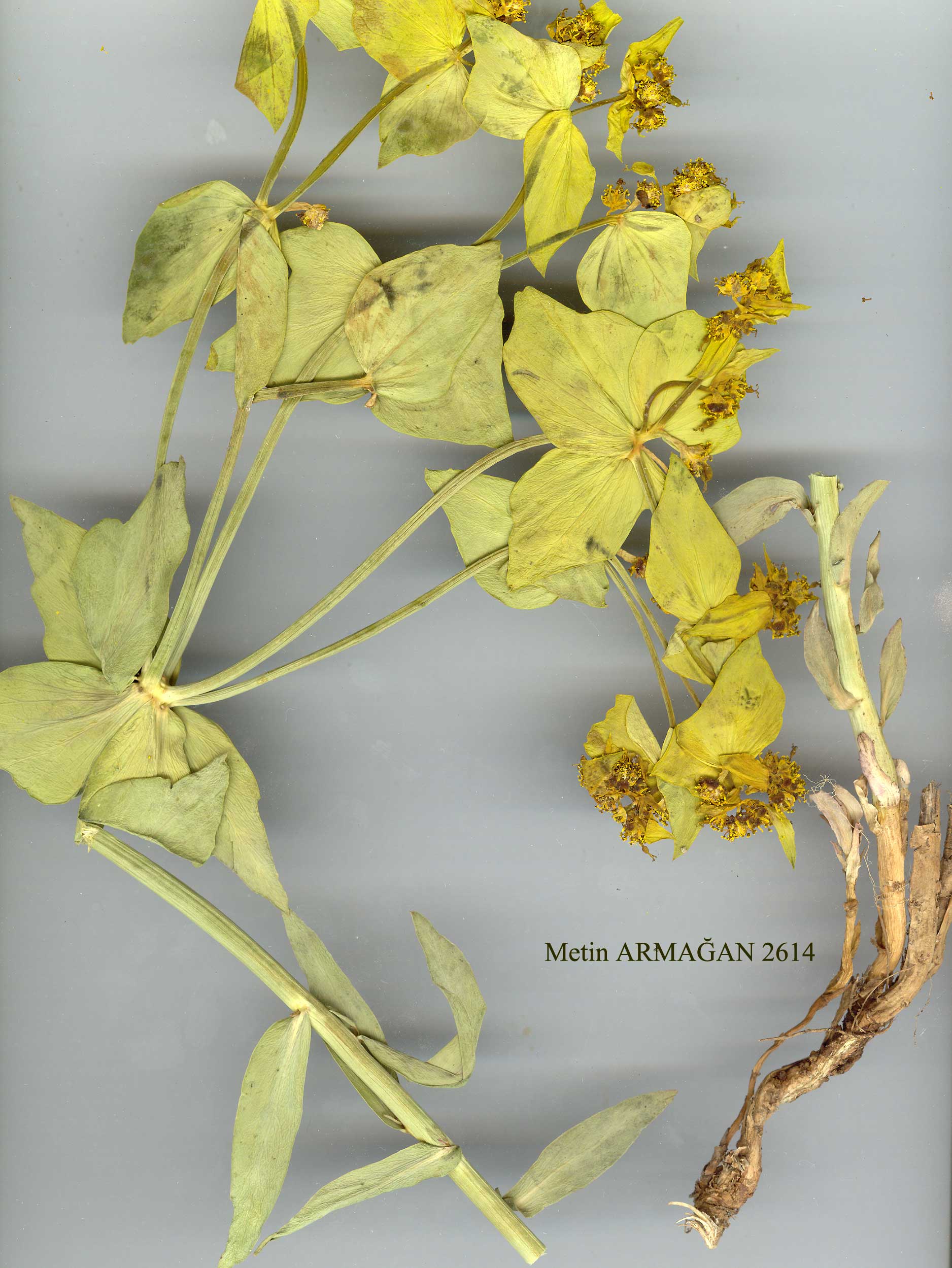 | E. heteradena Jaub. & Spach, I11. PL Or. 2: t. 131 (1845). Syn: E. ispahanica Boiss., Diagn. ser. 1(7):91 (1846); E. megalantha Boiss., op. cit. 95 (1846)! E. coriacea C. Koch in Linnaea 21:730 (1849); E. froedinii Rech. fil. in Symb. Bot. Upsal. 21(5):48, t. 24 (1952). Ic: Boiss., Ic. Euphorb. t. 59 (1866); Rech. fil. & Schiman-Czeika in Fl. Iranica 6: t. 3 f. 1, 2 (1964). Figure 17. Glabrous glaucous perennial to 70 cm, often with lateral leafy branches developing later from near base. Cauline leaves linear to lanceolate, 3-8(-9) x 0.2-2(-3) cm, acute or subacute, cuneate, ± entire. Ray-leaves lanceolate to ovate-trullate, 2-7 x 0.5-3.5 cm. Raylet-leaves resembling ray-leaves, but smaller. Rays (3-)5(-6). Glands transversely ovate, ± truncate or shallowly crescent-shaped. Cyathial lobes linear. Fruit 5-6 mm diam., smooth. Seeds ± square in outline, rounded-quadrangular in section, 3.5 mm, smooth, pale grey; caruncle strongly fluted, 1.5 mm. Fl. 5-9. Lakeside marsh, steppe, sandy hills, stony slopes, fields, roadsides, 1000-2300 m. Type: [Iran] Ispahan (Esfahan), Aucher 5313 (holo. P, iso. K! W). E. Anatolia. A9 Kars: Tuzluca, 1000 m, D. 43636! B9 Bitlis: Nemrut Da., 1750 m, D. 23561! Van: Edremit to Gevaş, 2000 m, D. 22661! B10 Ağri: nr Doğubayazit, 1650 m, D. 43953! Van: N.E. of Başkale, 2300 m, D. 44534! C10 Hakkari: Zab gorge, 1800 m, D. 45837! Caucasia, N. Iraq, Iran (except S.), Afghanistan. Ir.-Tur. element. The related species E. retusa Forsskål is wrongly recorded by Tchihatcheff (Asie Min. Bot. 1:163, 1860) from Bithynian Olympus (Ulu Da.); this species is found only in N. Africa, Palestine, Jordan and Iraq. Sect. Esula Dumort. Perennial herbs. Leaves pinnately nerved, usually mem-branous, sometimes coriaceous. Glands 2-horned. Fruits trilobate, smooth or granulate. Seeds smooth. Caruncle small, conical. Subsect. Esulae Boiss. ex Pax. Raylet-leaves free. |