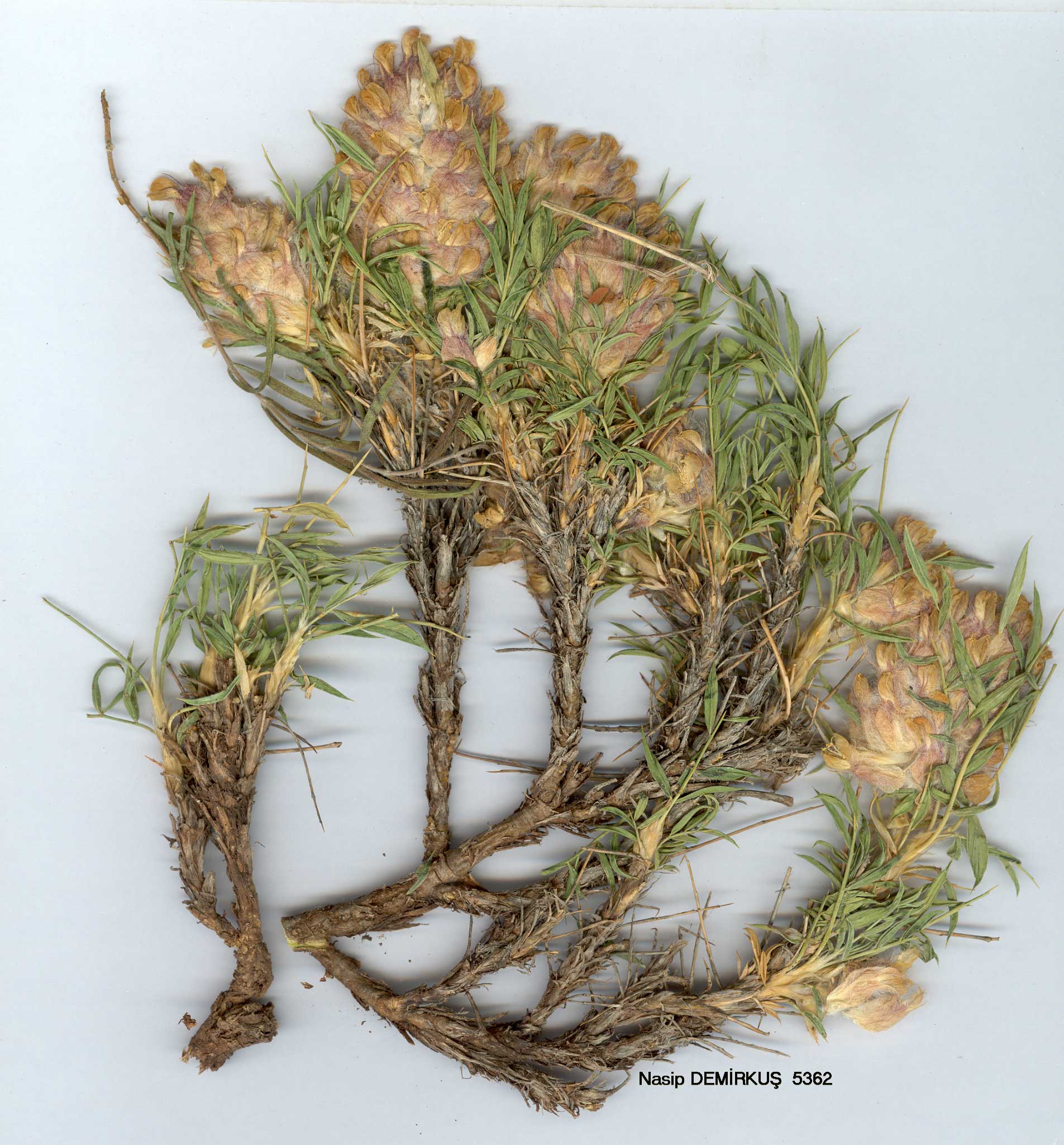 | A. trifoliastrum Hub.-Mor. & Matthews in Notes R.B.G. Edinb. 29: 301 (1969). Dwarf shrub with short stems. Leaves 2-4 cm; rachis spiny; leaflets 15-25 mm. lanceolate-elliptic, acute. spine-tipped, glabrous above, sparsely simple-sericeous below, 2-3-paired: stipules 13-16 mm, lanceolate, membranous, united at base, glabrous, ciliate. Peduncles scapiform, shorter than leaves, long white-pilose. Flowers in globose, 15-40-flowered spikes. Bracts 9-12 mm, ovate, acuminate, paleaceous, glabrous, ciliate. Calyx 13-15 mm, tubular at first, becoming inflated, long simple-white-pilose; teeth 5-6 mm. Corolla whitish; standard 15-18 mm. Ovary elliptic, compressed, densely and shortly simple-white-pilose. Legume unknown. Fl 6-7. Steppe, 1850-1950 m. Type: [Turkey B9] d. Van, Van-Hoşap, 20 km N von Van, 1950 m, 8 vii 1951, Renz & Simon, Hub.-Mor. 11467 (holo. Hb. Hub.-Mor.!). E. Anatolia, rare. B9 Van: 7 km from Van to Erçek, 1850 m, D. 44283! Endemic; Ir.-Tur. element. Probably related to A. woronowii. Species doubtfully recorded |