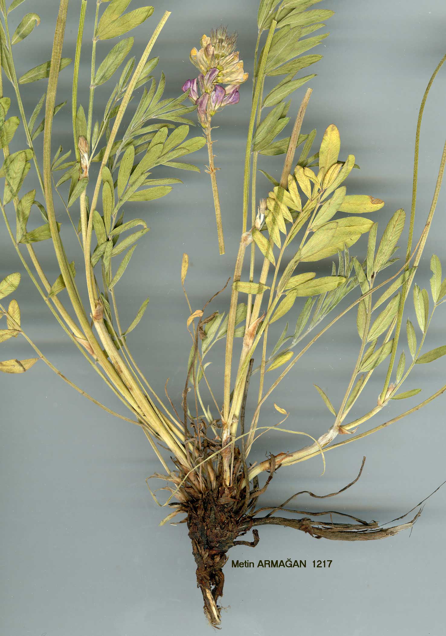 | O. fallax Freyn & Sint. in Öst. Bot. Zeitschr. 42:81 (1892). Figure 15, p. 585. Syn: O. leucantha Schischk. in Ber. Tomsker Staats.-Univ. 81:485 (1928)! Perennial with a woody base and erect stems, 25-50 cm high. Leaves with 4-6 pairs of leaflets; lower leaves with ovate or ovate-elliptic leaflets and a dense adpressed silvery indumentum on lower surface, pilose above and ± green; upper leaves with oblong-elliptic or linear-oblong leaflets, pilose above and be-low; stipules white, scarious. Peduncles clearly longer than leaves. Inflorescence many-flowered, ovate-oblong, elongating in fruit. Calyx (4-)5-8 mm with teeth 2-3 x length of tube, ± densely covered with short spreading villous hairs. Corolla rose with darker striations; standard (7-)8-10 mm; wings 2-3 mm; keel (6-)7-9 mm. Fruit 6-7(-9) mm long, adpressed pilose with hard triangular teeth on crest and shorter teeth on disc. Fl. 6. Limestone slopes, steppe, 1150-1500 m. Type: [Turkey B7 Elazığ] Kharput (Harput) prope Buslutasch, 5 vi l889, Sintenis 561 (K!). Scattered in C. & E. Anatolia. B7 Erzincan: Egin, Sint. 1890:2339; Elaziğ: Harput, 1380 m, Hub.-Mor. 9058! Tunceli: above Pertek, 1500 m, D. 31526! B9 Muş: Melazgerd, 1500 m, ann. 1916, Saposhnikov & Schischkin (type of O. leııcantha)! C4 Konya: d. Ermenek, Ermenek to Mut, 1170 m, Hub.-Mor. 17496! Endemic; Ir-Tur. region. Related to O. podperae Širj, but with larger corollas and broader leaflets. The specimen cited from Konya {Hub.-Mor. 17496) is geographically distant from all the other gatherings seen. It also differs in the . much thinner calyx indumentum. Although it may merit taxonomic recognition, more material from the Konya region is needed. |