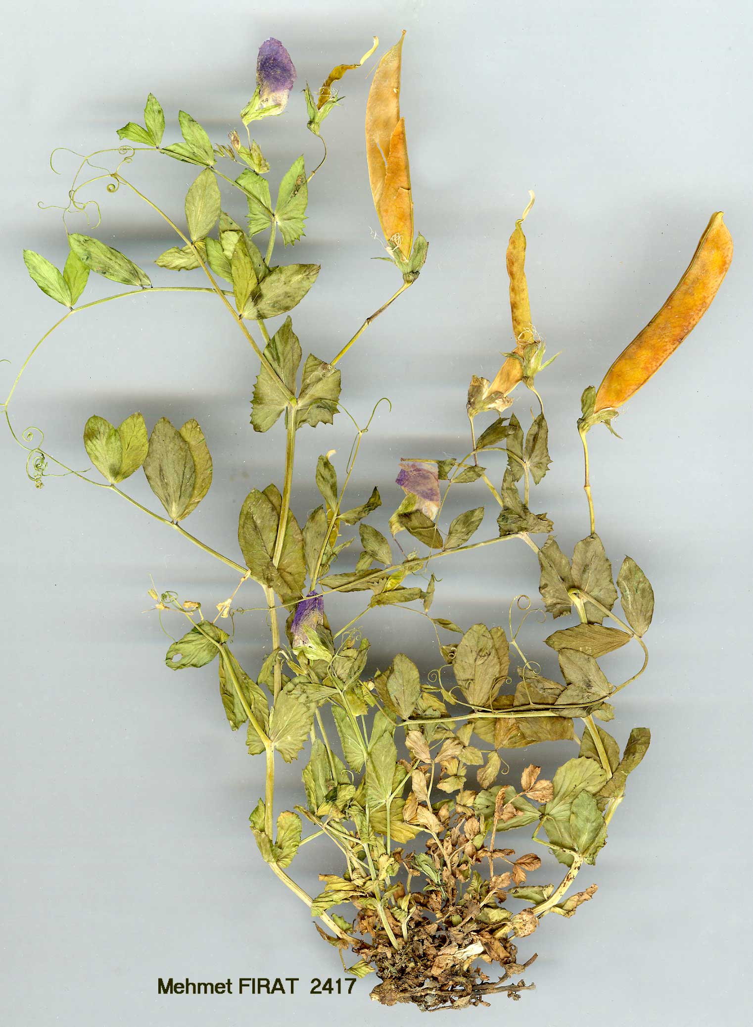 | P. sativum L., Sp. PL 727 (1753). Govorov in Bull. Appl. Bot. PL Breed. (Leningrad) 19(2):517 (1928); Zhukovsky, Turquie Agricole, 366 (1933). Glabrous, glaucous annual, stems 10-200 cm, often climbing. Leaflets 1-4-paired, entire or dentate; stipules 1.5-8 cm long, obliquely ovate, dentate at least below, rounded and semi-amplexicaul at base; tendrils branched. Peduncle ¼-4 x as long as the stipules, 1-3-flowered, with or without a short awn, usually larger than the leaflets. Flowers 16-30 mm, with a broad lilac standard and darker reddish-purple wings, or flowers white. Calyx 8-15(-20) mm; teeth sub-equal, longer than tube, ovate-lanceolate,' ± acuminate, herbaceous. Legume oblong-linear or linear, 40-70(-150) x 7-17(-30) mm; seeds 3-10, at least 5 mm diam., testa densely papillose, or smooth or wrinkled. Fl. 4-5{-6). 1. Seeds densely papillose; peduncles ¼-4 x as long as stipules; flowers bi-coloured; legumes 7-12 mm broad (wild) subsp. elatius 2. Flowers 20-30 mm; legumes (50-)55-70 x 9-12 mm; leaflets (l-)2-4-paired, ovate-elliptic, entire or subdentate; stems 30-200 cm 3. Peduncles l-2(-3)-flowered, 2-4 x as long as stipules; leaflets (2-)3-4-paired; stems 60-200 cm; flowers (20-)25-30 mm var. elatius 3. Peduncles 1-flowered, ¼-l(-l½) x as long as stipules; leaflets (l-)2(-3)-paired; stems 30-60 cm; flowers c. 20-22 mm var. brevipedunculatum 2. Flowers 15-18 mm; legumes 40-45 x 7-8(-ll) mm; leaflets 1-3-paired, elliptic or elliptic-obovate, usually ± dentate; stems 10-30 cm, more slender var. pumilio 1. Seeds not papillose, but smooth or wrinkled; peduncle ½-2 x as long as stipules; flowers white or bicoloured; legumes 12-17(-30) mm broad (cultivated, spontaneous or wild) subsp. sativum 4. Flowers bicoloured; stipules with a reddish spot; seeds 4-8 mm. often angled and blotched var. arvense 4. Flowers white; stipules without a reddish blotch; seeds usually larger, globose and unblotched var. sativum subsp. sativum. Ic: Villax, Cult. PL Fourr. Médit. Occid. t. 146 (1963). var. sativum. Ic: Reichb., Ic. Fl, Germ. 22: t. 270 (1903). Field crop. Described from Europe (Hb. Cliff.! Hb. Linn. 903/1!). A2(E) Istanbul: Pisani, Therapia, 29 vi 1890, Azn.! Bahçeköy, 9 vi 1892, Azn.! C5 Içel: Çukurova. Çakuli Köy nr. Tarsus, Beaver T203. Cosmopolitan. Cultivated for its edible seeds (field pea, Turkish bezelye) and represented by numerous cultivars. var. elatius. Syn: P. elatius Bieb., Fl. Taur.-Cauc. 2:151 (1808). Ic: Reichb., Ic. Fl. Germ. 22: t. 268 (1903); Fl. Armenii 4 : t. 81 (1962). Rocky or grassy slopes, ruins, field margins, s.1.-1700 m. Wild. Type: [Georgia] Iberia, Steven. Turkey-in-Europe, Outer Anatolia, Islands. A1(E) Çanakkale: Gelibolu, Jam Baz De., Ingoldby 154! A1(A) Çanakkale: Erenköy, Dumbrek valley, Sint. 1883: 348! A2(E) Istanbul: Rumelihisari, 20 v 1918, B. Post! A2(A) Istanbul: valley of Büyük Göksu, 2 v 1917, Azn.! A4 Kastamonu: Inebolu, nr. Ibras, Sint. 1892: 4059. A5 Amasya: Çengelhan, nr. Amasya, 600 m, Bornm. 1889:248. A8 Çoruh: Artvin (Grossheim: map 527). A9 Çoruh, Ardanuç (Grossheim: map 527). Bl Izmir: Ilica, Soğan dere, 200-300 m, Bornm. 1906:9427. B5 Adana: Gürümze, 1700 m, Kotschy 154! Cl Muğla: nr. Selimiye, 170 m, D. 40727! C2 Aydin: d. Karacasu, Aphrodisias (Geyre), 600-700 m, D. 41610! C3 Antalya: Kirkoz,, 300 m, Tengwall 332! C4 Içel: Anamur to Silifke, Karamanoğlu 21/1961! C5 Hatay: El Ourdou (Yayladağ), 420 m, Samuelsson 5292. C6 Hatay: 30 km from Antakya, 800 m, Dinsmore 20337! Is: Samos, W of Marathokampos, Rech. 4073. S. Europe, Crimea, N. Africa, Cyprus, W. Syria, Caucasia, N. Iran. Medit. element ? |