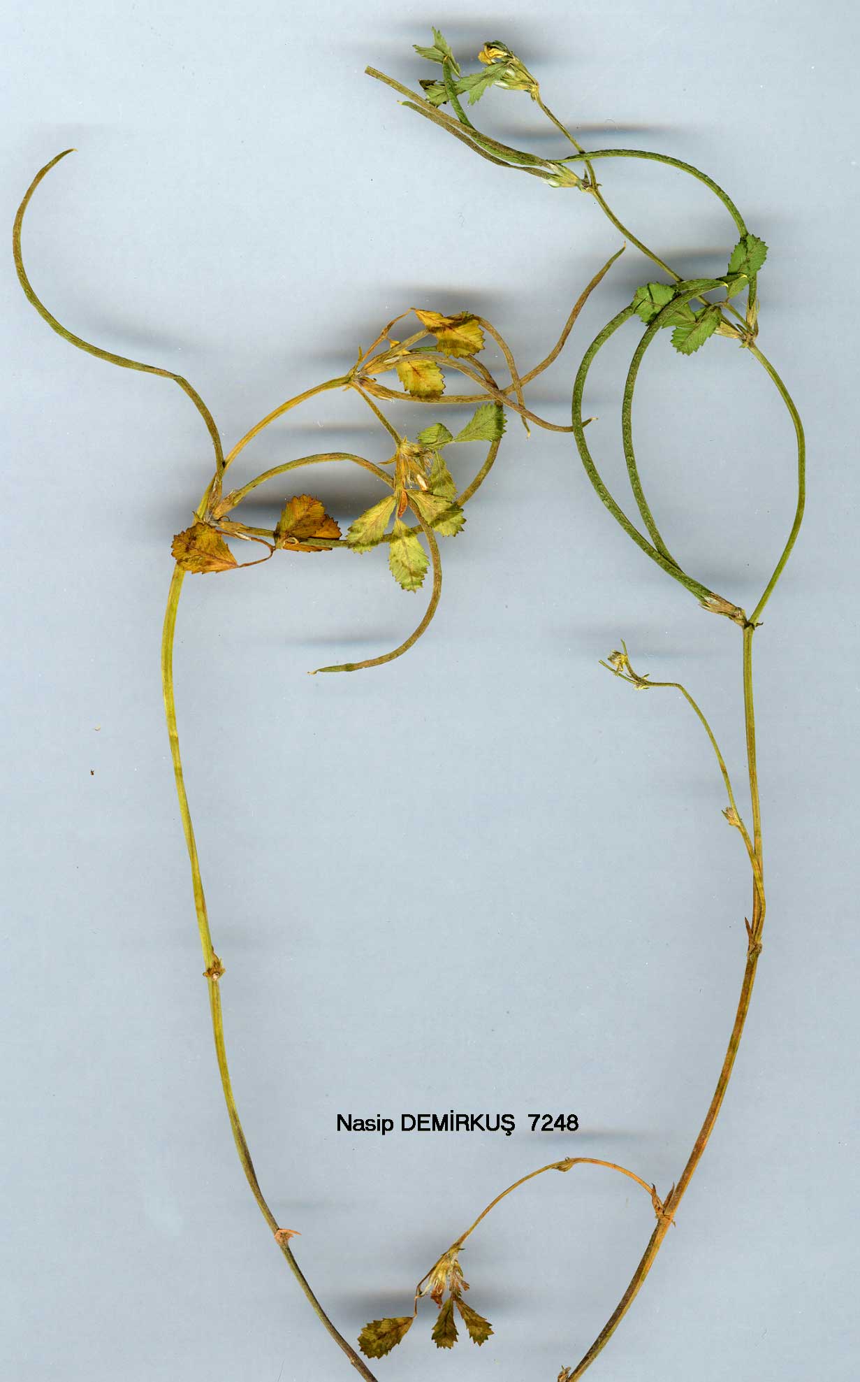| T. monantha C. A. Meyer, Verz. Pfl. Cauc. 137 (1831). Adpressed-pubescent, branched from base; stems prostrate-ascending, 5-30 cm. Stipules semisagittate denticulate. Leaflets oblong to cordate-cuneate, dentate, incised or pinnatifid, 5-12 x 3-8 mm. Peduncle 0(-4) mm. Flowers 1-3 in the leaf-axils. Calyx campanulate, 5-6 mm; teeth lanceolate-acuminate, about as long as tube. Corolla yellow, 6-8 mm. Legumes erect-spreading, curved, somewhat compressed, 4-10 x 0.1-0.2 cm, lengthwise reticulate-netted, with linear to oblong areoles, many-seeded. Seeds oblong-cylindrical, 2-2.5 x 1 mm, tubercled. 1. Legumes single or rarely two together, reticulate-netted with narrow, linear areoles subsp. monantha 1. Legumes two, rarely three together, reticulate-netted with broader, oblong areoles subsp. noeana subsp. noeana (Boiss.) Hub.-Mor., comb, et stat. nov. Syn: T. noeana Boiss., Diagn. ser. 2(2): 11 (1856). Ic: Širj., op. cit. 1(4): t. 9 f. 83, t. 10 f. 6, 9. Figure 12, p. 473. Fl. 5-6. Cultivated fields, vineyards, 400-1300 m. Type: [Iraq] in herbidis Babyloniae ad Kutt, v 1851, Noë (holo. G!). Inner Anatolia. A7 Gümüşane: Gümüşane, 1100 m, Görz 547! B3 Konya: Akşehir, Bornm. 1899:4285! B5 Kayseri: Kayseri, Bal. 1856:913! B6 Sivas: S W of Sivas, Reese! Maraş: Elbistan to Darende, G. E. Post 524! B7 Elaziğ: Elaziğ to Kale, 26 km from Elaziğ, 1300 m, D. 28918! C4 Konya: Konya to Çumra, Küçük Köy, 980 m, Helbaek 2468! C5 Niğde: N of Niğde, Reese] C6 Gaziantep: Nizip to Birecik, 400 m, D. 27959! Urfa: Birecik, Kefre, Sint. 1888:567! C7 Urfa: Akçakale, 400 m, D. 28096! C8 Mardin: 2 km N of Gercuş, 900 m,. D. 42997! Syrian Desert, Palestine, N. Iraq, Transcaucasia, Iran, Afghanistan, Turkestan. Ir.-Tur. element. Intermediates between the above two subspecies are frequent in E. Anatolia: Prov. Çorum, Amasya, Sivas, Elaziğ, Gaziantep, Mardin. |