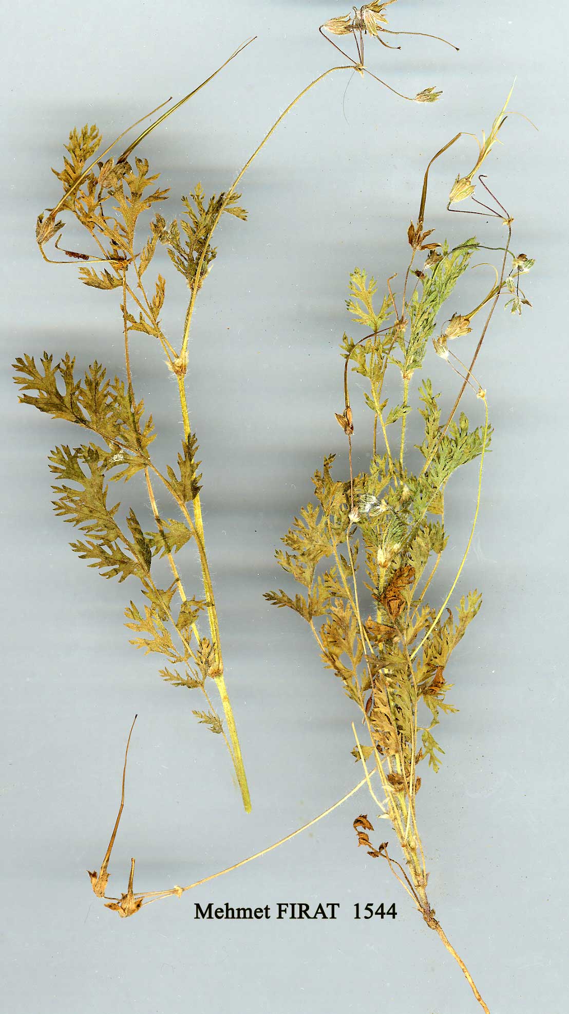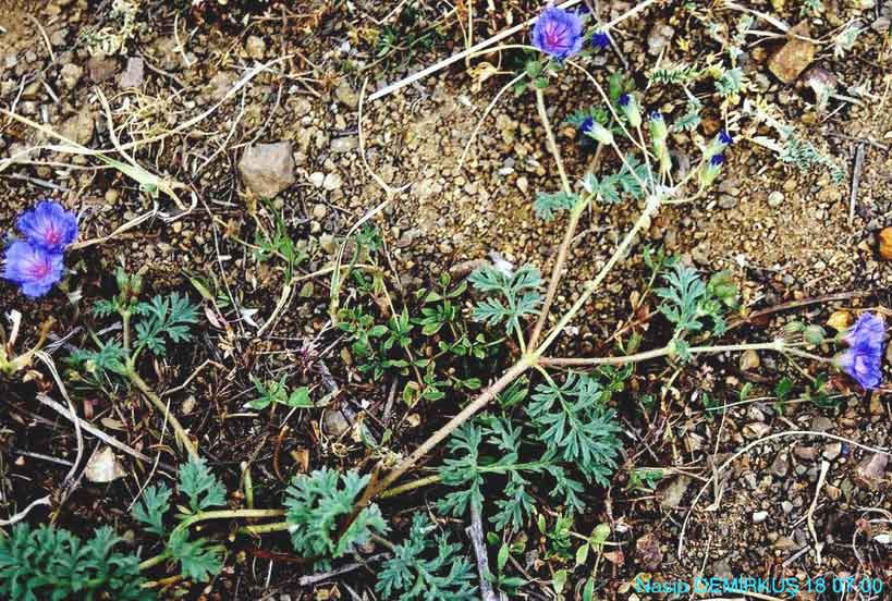 | E. absinthoides Willd., Sp. PL 3: 627 (1800). Dioecious perennial, usually with few lax rosettes. Basal leaves l-2(-3)-pinna-tisect, blade ovate to narrowly oblong, 2-13 cm, primary segments varying from shortly pinnatifid to deeply 2-pinnatisect, adpressed-pilose, canescent or sub-sericeous, usually eglandular. Stems simple or sparsely branched, prostrate or ascending, hirsute or canescent. Sepals 4.5-7 mm in flower, usually pilose and glandular-pubescent; awn 0.2-2.8 mm. Petals obovate, 1-2½ x sepals, white, pink or lavender-blue. Beak of fruit 4-7 cm, stout. A very variable species, to which several of its allies should perhaps be subordinated. Four subspecies are recognised here; another (subsp. elatum (Form.) Davis & Roberts) grows in N. Greece. 1. Lamina of basal leaves oblong, length 2-4 x width, segments laxly and deeply 2-pinnatifid into lanceolate acute laciniae; stems bearing 1-12 peduncles 2. Leaves densely canescent; stems grey with short, retrorsely adpressed hairs; flowers white subsp. absinthoides 2. Leaves greenish, adpressed-pilose; stems patently hirsute, often also bearing subsessile glands; flowers lavender-blue . subsp. armenum 1. Lamina of basal leaves ovate, length c. 1.5 x width, segments 1-2-pinnatifid into short obtuse laciniae or teeth; stems bearing 1-2 peduncles 3. Segments deeply pinnatifid, subsericeous; flowers bright pink subsp. latifolium 3. Segments lobed only to the middle, greenish; flowers white subsp. haradjianii subsp. armenum (Trautv.) Davis in Notes R.B.G. Edinb. 28: 36 (1967). Syn: E. absinthoides var. armenum Trautv. in Acta Horti Petrop. 2: 517 (1873)! E. armenum (Trautv.) Woronow in Acta Horti Petrop. 27: 432 (1910)! Ic: Grossh., Fl. Kavk. 5: t. 5 f. 2 (1962). Fl 7-8. Rocky slopes, 2300-3200 m. Type: [Soviet Armenia] in Armeniae monte Alagos, Radde (LE!). A8 Gümüşane: Kop Da., Balls 1786! B7 Erzincan: Sipikor Da., Sint. 1889: 1099! Erzurum: Palandöken Da., nr. Erzurum, Kotschy 542! B8 Bitlis/Van: d. Reşadiye, mt. 10 km SE of Pelli, 2400 m, D. 22563! B8 Siirt: Mt. Meletus (Mertug), 2400-3100 m, Hand.-Mazz. 2723! B9 Bitlis: d. Kotum, Karz Da. above Kamer, 2300 m, D. 24581! Kars: SW of Iğdir (Grossheim 6: map 30). Van: d. Şatak, Kavuşşahap Da., 3200 m, D. 23123. Soviet Armenia. Ir.-Tur. element. Cf. E. hakkiaricum. |