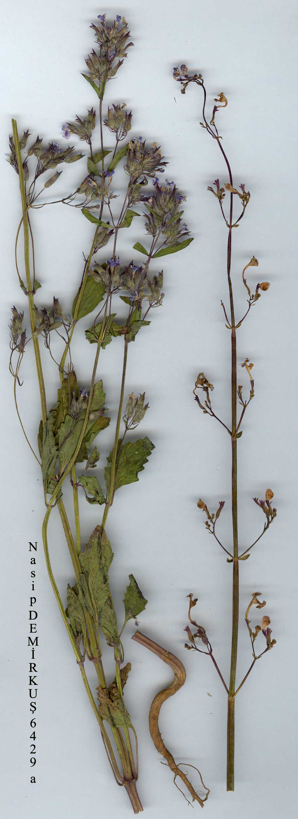 N. fissa C.A. Meyer, Verz. Pfl. Cauc. 93 (1831). Hedge in Notes R.B.G. Edinb. 24:51-71 (1962). Syn: N. rarifolia C. Koch in Linnaea 21:676 (1848); TV. virgata C. Koch, loc. cit. (1848); TV. calvertii Boiss., Diagn. ser. 2(4):25 (1859); TV. trautvetteri Boiss. & Buhse in Nouv. Mem. Soc. Nat. Mosc. 12:175 (1860); TV. gracilescens Boiss., Fl. Or. 4:647 (1879); TV. galatica Bornm. in Bull. Herb. Boiss. 7:241 (1899)! N. velutina Pojark. in Not. Syst. (Leningrad) 15:312(1953). Ic: Fl. URSS 20: t. 21 f. 3 (1954), as N. velutina. Perennial; stem ± erect, 20-95 cm, glabrous to densely and shortly puber-ulous. Leaves usually ± triangular, rarely rhomboid or reniform, 1.4-5 x 1.4-4.5 cm, base truncate or cordate, rarely cuneate, crenate to coarsely dentate, lightly to densely puberulous; petiole 0.7-4.8 cm. Inflorescence usually lax, at least lower cymes pedunculate, flowers congested or loose. Bracteoles lanceolate-elliptic to elliptic-oblong, much shorter than calyx. Calyx tubular, ± straight, 6-8(-9) mm, mouth oblique, teeth acuminate or blunt, ovate-oblong to triangular, much shorter than tube, lower lip deeply cleft, ± pubescent to scabridulous, glandular or not, often purple. Corolla blue or lilac to purple, 10-21 mm, exserted from calyx teeth. Nutlets elliptic to oblong, ± trigonous, smooth, c. 1.7 x 1 ram. Fl. 6-9. Volcanic and serpentine rocks, screes, slopes, steppe, dry or moist banks, (540-)1100-1950 m. Type: [USSR, Azerbaijan] in locis lapidosis aridis montium Talüsch (Talysh) prope pagos Siwirs et Swant, 540-1205 m, C.A. Meyer [797] (holo. LE, photo!). Inner Anatolia. A5 Tokat: Pontus Galaticus between Amasya and Kayseri, 1200 m, Bornm. 1889:1251 (type of TV. galatica)! A6 Sivas: Sivas to Suşehri, c. 3 km W. of Yapi köyü nr Şerefiye, 1510 m, Buttler 14026! A7 Gümüşane: Gouans, Jamurdere nr Sobran, Sint. 1894:6096! A8 Erzurum: Tortum G., 1250 m, Stn. & Hend. 6117! A9 Kars: 30 km from Horasan to Karakurt in Aras gorge, 1500 m, D. 46505! B3 Eskişehir: 12 km S.W. of Eskişehir towards Kütahya, 20 vi 1950, Reese! B6 Sivas: 18 km S. of Zara, 1500 m, Sorger 69-37-30! B7 Erzincan: c. 12 km from Erzincan to Kelkit, 1500 m, D. 31910! B8 Erzurum: Tercan to Selepur, 1400 m, D. 30972! B9 Van: Erek Da., 1980 m, D. 22907! B10 Kars: Takjalta to Sardar Bulag (Serdar Bulak), B. Post 1910:2058! C5 Konya: d. Ereğli, Aydos Da., 1600 m, Erik 2770! C9 Hakkari: Zap gorge nr Dezi, c. 1600 m, D. 24020! C10 Hakkari: Nehil Çayi, 14 km from Yüksekova to Hakkari, 1800 m, D. 45861! Caucasia, N., N.W, W. & C. Iran, N. Iraq. Ir.-Tur. element. Variation within TV. fissa has already been discussed (Hedgef op. cit.) and material collected since then does nothing to alter the conclusions reached. Forms with a very loose inflorescence having soon deciduous flowers, short bracteoles and short, broad, blunt calyx teeth have been noted from Gümüşane, Elaziğ and Hakkari vilayets: all are flowering late in the season, in August and September. Early records of TV. teucriifolia Willd. from Turkey refer toN. fissa. |