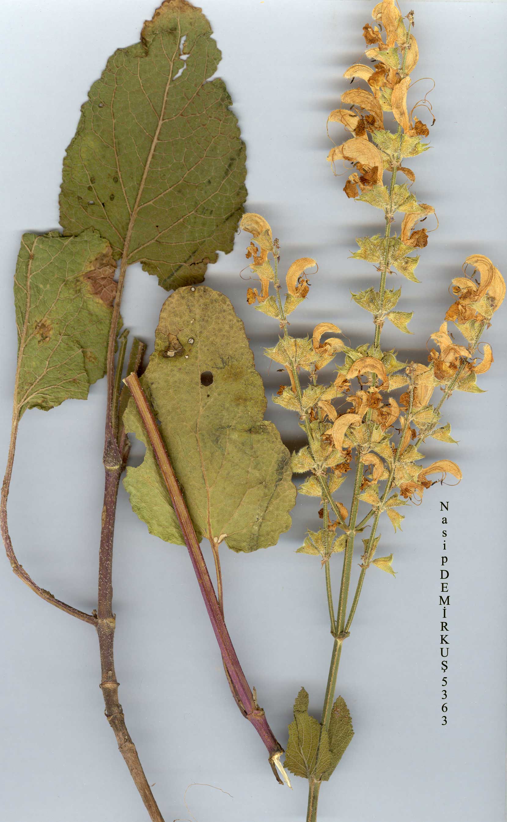 S. limbata C.A. Meyer, Verz. Pfl. Cauc. 86 (1831). Syn: S. chrysadenia Freyn in Bull. Herb. Boiss. ser. 2, 1:279 (1901)! Ic: Takht. & Fedorov, Fl. Erevana ed. 2, f. 82 (1972). Figure 13. Map 54. Perennial herb with erect stems much branched above, 30-100 cm, retrorsely scabridulous below and with sessile glands above. Leaves simple, ovate-oblong, cordate at base, 10-16 x 6-10 cm, glabrous and glandular-punctate below, sparsely pilose above, erose-dentate; petiole to 12 cm. Verticillasters 2-6-flowered, distant. Bracts ovate-acuminate, soon deciduous. 2-6 mm. Pedicels 2-5 mm, erecto-patent. Calyx ovate-campanulate, 8-10 mm, to c. 12 mm in fruit, with scabrid eglandular hairs and sessile glands; upper lip shortly tri-dentate, mucronate, recurved. Corolla white with pale yellow lip, c. 25 mm; tube short, abruptly ventricose, squamulate; upper lip falcate, villous at tip. Stamens B. Nutlets c. 2.5 x 2 mm, rounded trigonous, ovate-oblong. Fl. 6-8. Stony slopes, steppe, sandy loam, roadsides, cornfields, 1060-2340 m. Type: [USSR, Azerbaijan] in locis siccis lapidosis montium Talüsch (Talysh) prope pagum Swant, c. 1280 m, [C.A. Meyer 140] (holo. LE, photo!). E. Anatolia. A8 Erzurum: 8 kmN.E. of Tortum, 1450 m, Hub.-Mor. 15323! A9 Kars: E. of Kağizman, Akçay to Cumaçay, 2100 m, D. 46782! B8 Erzurum: 4 km W. of Erzurum on road to Ilıca, 1810 m, Buttler 14119! B9 Ağri: Doğubayazit to Ağri, Lamond 2554! Van: 7 km from Van to Erçek, 1850 m, D. 44262! Erek Da., Kronenburg 6 (type of S. chrysadenia)! Bitlis: Tatvan, D. 22308! B10 Ağri: 12 km from Doğubayazit to Iğdir, 1060 m, Hewitt 200! C10 Hakkari: 37 km from Şemdinli to Yüksekova, 2000 m, D. 45055! Transcaucasia, N., N.W., W. & C. Iran. Ir.-Tur. element. Unusual in having an indumentum without glandular hairs. |