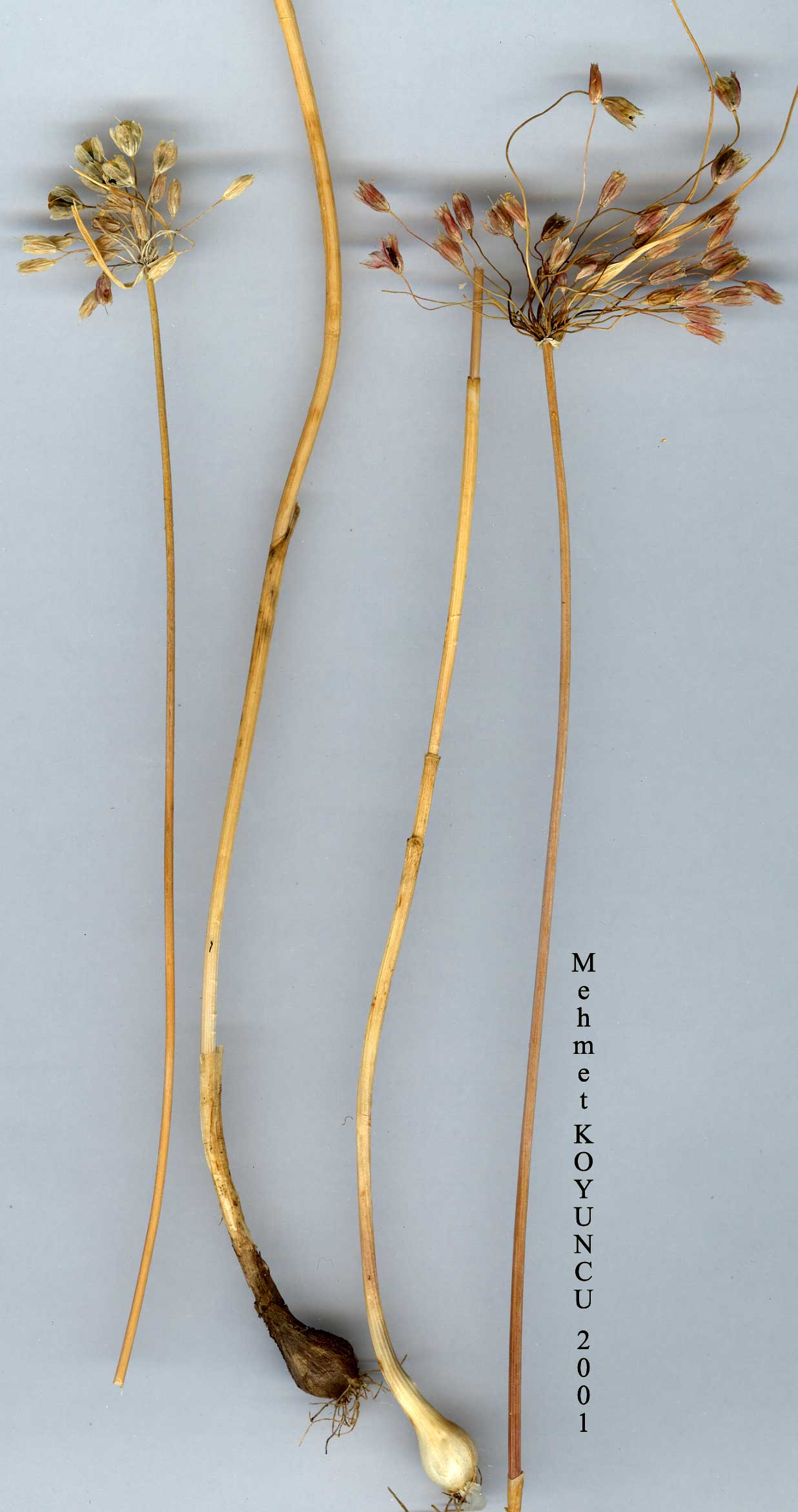 A. paniculatum L,, Systema ed. 10, 2:978(1759). Figure 4. Map 15. Bulb 1-2.5 cm diam.; outer tunics membranous. Stem 30-70 cm. Leaves 3-5, (l-)2(-5) mm broad, fistulose, canaliculate above, prominently ribbed beneath. Valves of spathe unequal, ovate to narrowly lanceolate at base, contracted above into a long appendage exceeding umbeJ. Umbel hemispherical to ovoid, 3.5-7 cm diam., diffuse, usually many-flowered. Pedicels very unequal, outer curving outwards, inner erect. Perianth campanulate, becoming narrowly ovoid; segments narrowly obovate to oblong, 4-6(-7) mm, usually obtuse, often apiculate, sometimes acute. Filaments and anthers included or anthers slightly exserted. Ovary ellipsoid, 2-3 x as long as broad, papillose, narrowed at base and apex. Capsule c. 5 mm. 1. Leaves and sheaths hairy; hairs patent subsp. villosulum 1. Leaves and sheaths glabrous or rarely lower sheaths densely and minutely velutinous 2. Perianth segments reddish-brown, brown, brownish or greenish-brown, 5-6(-7) mm subsp. fuscum 2. Perianth segments pink, white, whitish, greenish-white or pale greenish, 4-5 mm subsp. paniculatum subsp. paniculatum. Syn: A. intermedium DC. in Lam. & DC, Fl. Fr. ed. 3, 5:318 (1815); A. longispathum Delaroche in Redouté, Iiliac. 6: t. 316(1812); A. paniculatum L. var. typicum Regel, All. Monogr. 191 (1875) nom.iilegit.; A. paniculatum L. var. longispathum (Delaroche) Regel, op. cit. 193 (1875). Ic: Reichb., Ic. Fl. Germ. 10: t. 487 (1848); Kirchner et al., Lebensgesch. 1(3): 436, f. 235 (1913); Pastor & Valdes, Revis. Allium Pen.Iber.83,t. 17(1983), as A. paniculatum. 2n = 16. Fl. (6-)7-8. Pinus forests, Quercus and Fagus woods, Juniperus nana scrub, macchie, rocky places, cliffs, limestone hills, steppe, vineyards, roadsides, s.l.-2000 m. Lectotype (designated by Wilde-Duyfjes in Taxon 22:75, 1973): Right-hand specimen, Hb. Linn. 419/21. N.W. Turkey, W., C. & S. Anatolia, Islands. A1(E) Kirklareü: 12 km from Kiriköy, N. & E. Özhatay (lSTE 35915)! A2(E) Istanbul: Belgrad forest, N. Özhatay (lSTE 30132)! A2(A) Bursa: Ulu Da., 305-610 m, D. 14869! A3 Bilecik: Bilecik to Pazaryeri, 400 m, D.36437! A4 Ankara: d. Kizilcahamam, nr Güvan, 1200 m, Koyuncu (AEF 6241)! A5 Çorum: road to lskilip, A. Bay-top & Tuzlaci (lSTE 38228)! A6 Sivas: Yildiz Da. above Sariyer, 1600 m, A. Baytop (lSTE 33637)! Bl Balıkesir: Seitinly {Zeytinli), Sint. 1883:1211! B2 lzmir: Boz Da., 1200 m, D. 18177! B3 Konya: above Cankurturan, 2000 m, A. Baytop (lSTE 33998)! B4 Ankara: Elma Da., 1500 m, Koyuncu et al (AEF 2187)! B5 Kayseri: Ali Da., 1400 m, Koyuncu (AEF 5463)! B6 Sivas: c. 36 km S. of Kangal, 1600 m, Sorger 76-19-30! B7 Erzincan: Egin (Kemaliye), Altikivei, Sint. 1890:2888! B9 Ağri: Şenköy, T. Baytop (lSTE 25990). C2 Muğla: Sandras Da., N. & E. Özhatay (lSTE 45917)! C3 lsparta: foot of DedegölDa., 1650 m, Sorger 66-46-75! C4Konya: 16km W.of Konya, 1200 m, Sorger 66-38-33! C5 lçel: Buluklu Köyü, 200 m, Koyuncu (AEF 6096)! C6 Maraş: 7-9 km S. of Andirin, 700 m, Ehrend. et al. 787-53-1! C8 Mardin: Mardin, Sint. 1888:1458! C9 Siirt: Siirt, 1100 m, Frödin 1936:239. Is: Les-vos, Cand.; Khalki, 0.5 km W. of Chiono, Bothmer 23004! Rodhos, mt. Hag. Elias nr Archangelos, 400 m, Rech. 8419. S. & E. Europe. Medit. element. |