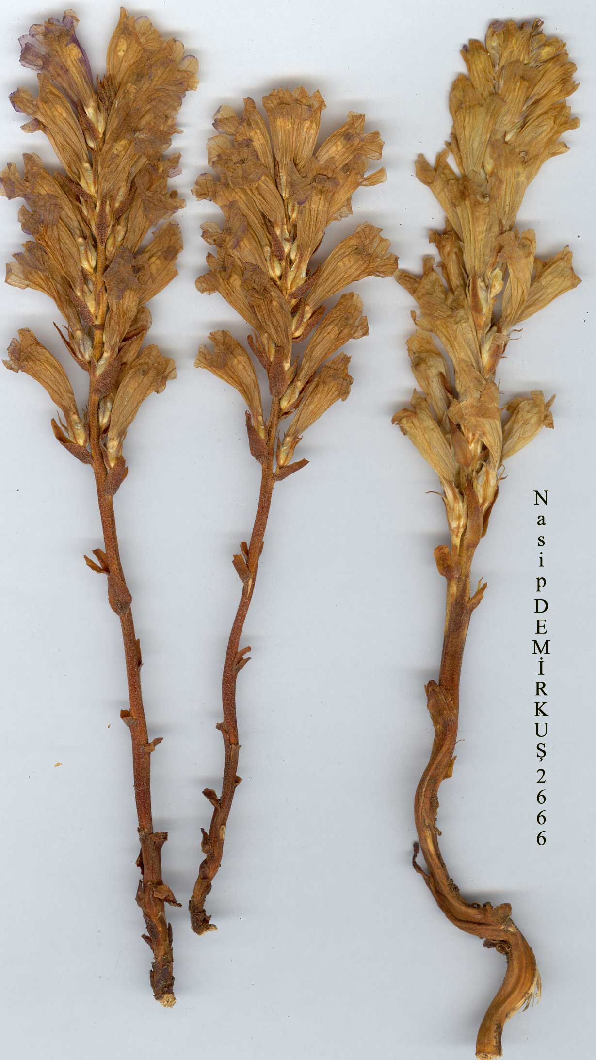 O. bungeana G. Beck, Monogr. Orob. 119: t. f. 25 (1890). Unbranched, 7-23 cm. Spike usually dense and few-flowered. Calyx greyish with numerous long arachnoid hairs; calyx teeth lanceolate, shorter than or equalling tube. Corolla pale yellowish or lilac, nearly erect, 27-35 mm, lobes of lower lip suborbicular, both lips with abundant articulate hairs. Anthers with abundant long woolly hairs. Fl. 5-7. On Afyssum, 600-3000 m. Type: [N. Iran] prope Siaret (Ziarat), 1859, A. von Bunge (holo. LE). N.E., C. & S.E. Anatolia. A8 Erzurum: Sari Koma pass, 3000 m, Furse & Synge 851! A9 Çoruh: Artvin, Woronow. B2 Kütahya: Murat Da. above Kesik Söğüt, 1900 m, D. 36808! B9 Van: 10 km from Gürpınar (Havasor) to Hoşap, 1850 m, D. 44685! C9 Siirt: 28 km from Şirnak to Cizre, 600 m, D. 42579! Greece (Pindus), Caucasus, N. & N.W. Iran, Transcaspia. Hyrcano-Euxine element? |