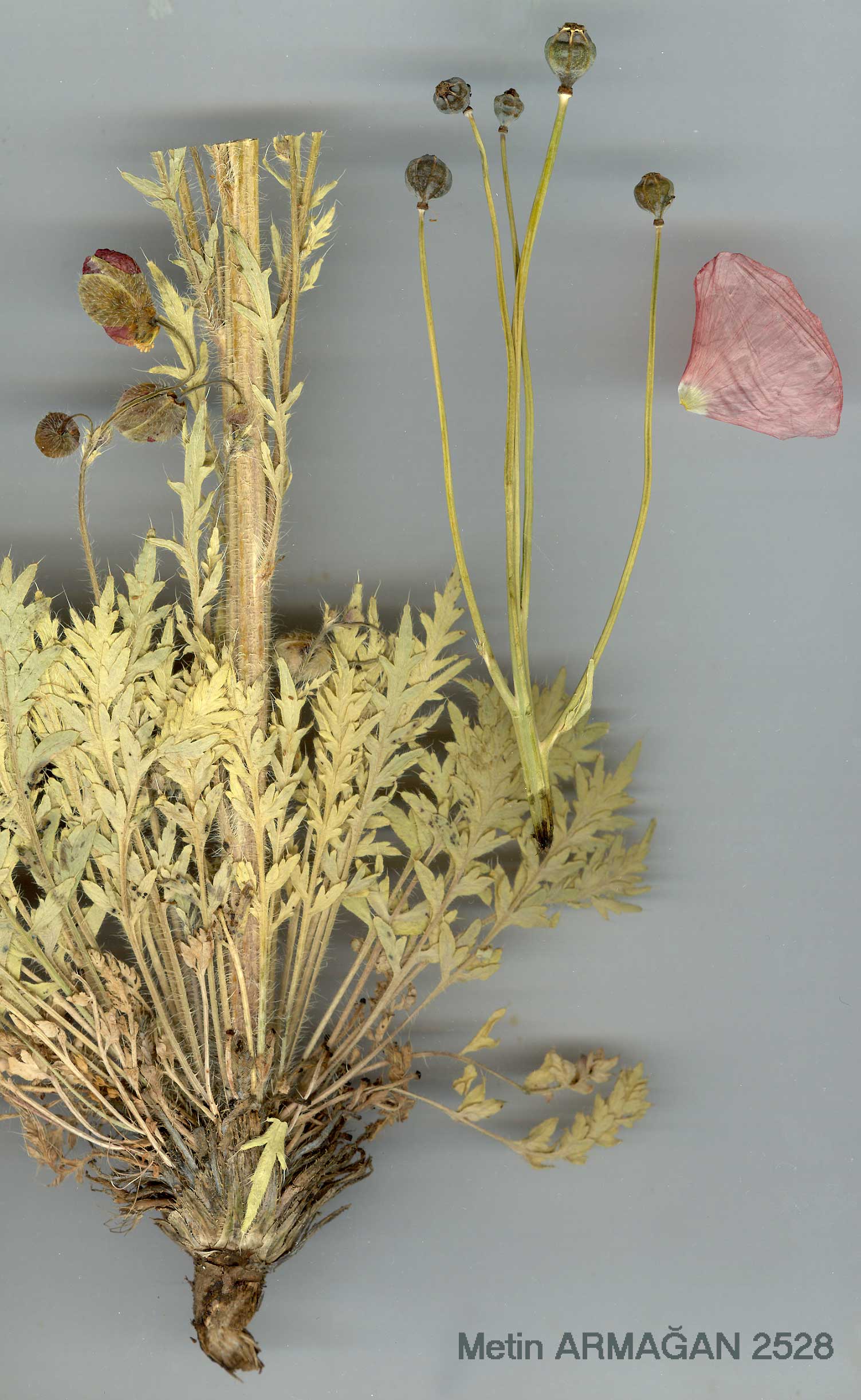 P. tauricola Boiss., Fl. Or., 1: 109(1867). Syn: P. hyoscyamifolium Boiss. & Hausskn. in Boiss., Fl. Or., 1 : 110 (1867) p.p. Figure 8, p. 223. Stems paniculately branched, leafy, 30-40 cm, sparsely spreading-setose. Leaves pinnatisect with oblong, entire or irregularly serrate segments, hispid-setose. Buds hispid with long, orange-brown hairs. Capsule ovate-globose, rounded at the base, covered with long, white adpressed bristles springing from the base, or glabrous (var. leiocarpum (Boiss.) Fedde). Disc acutely pyramidal. Fl. 6-8. Screes and rocky slopes, 1100-2800 m. Many syntypes cited from Anatolia. E. Anatolia, Cilician Taurus and Anti-Taurus. Taurus mountains, Kotschy 14 (isosyntype): A8 Erzurum: Horasan to Karaurgan, 2000 m. D. 29500! B5 Kayseri: Bakır Da., 1700 m, D. 19404! B6 Maraş: above Elbistan, 1200 m, Stn. & Hend. 5666! Sivas: Tecer to Gürün, 1800 m. Hub.-Mor. 13937! Seyhan: Bakir Da. to Saimbeyli, 1850 m, Hub.-Mor. 10939! B7 Tunceli: Tunceli to Pülümür, 1100 m, D. 29234! B9 Bitlis: W flank of Nemrut Da., 2000 m, D. 23590! C5 Içel: Cilician gates (Gülek Boğaz), Bal. 429! Niğde: Masmoutli Da., Solakli, 2000 m, Siehe 1906: 465! C6 Malatya: Sürgü to Perveri, 1340 m, Hub.-Mor. 13938! Seyhan: Yağlipinar, S of Yarpuz, 1500 m, Hub.-Mor. 15243! N. Iraq, Iran. Possibly not distinct from the Iranian P. persicum Lindl. The glabrous-fruited variant (var. leiocarpum) links this species to the next. |