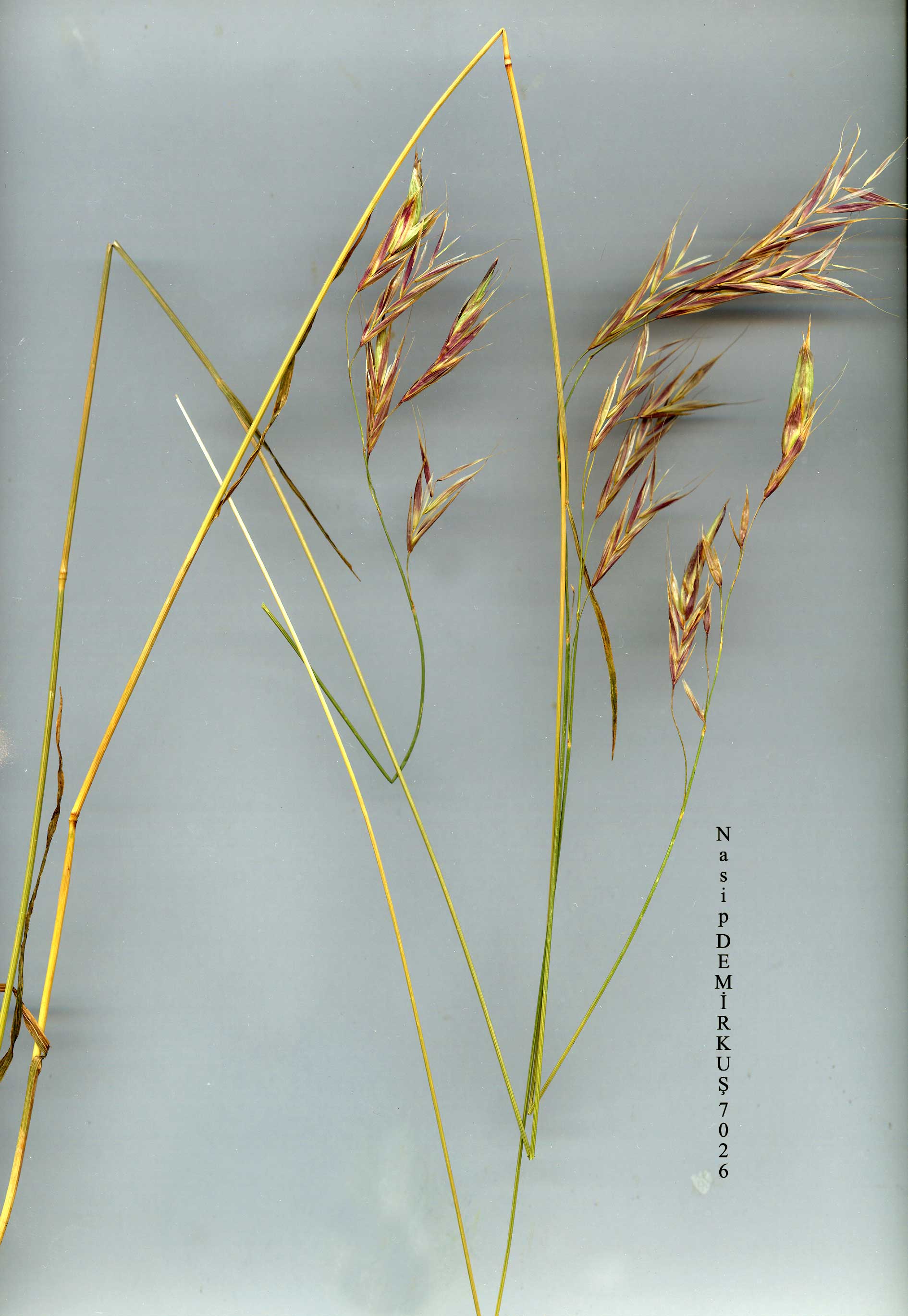 B. erectus Hudson, Fl. Angl. 39 (1762). Syn: Zerna erecta (Hudson) S.F. Gray, Nat. Arr. Brit. PL 116 (1821); Bromopsis erecta (Hudson) P. Fourr. in Ann. Soc. Linn. Lyon n.s. 17:187 (1869). Ic: Hubbard, Grasses ed. 2:74 (1968);F1. RPR 12: t. 58 f. 3 (1972). Map 53. Perennial. Stems 40-100 cm, tufted or very shortly rhizomatous, erect, rigid. Basal leaf sheaths decaying into parallel fibres or remaining intact, glabrous or hairy. Leaf blades 10-25 cm, lower 2-3 mm broad, involute, rather stiff, upper 5-6 mm broad, flat, all glabrous or sparsely pilose. Panicle 10-25 cm, erect, rigid, compound, lax or quite dense, branches equalling or shorter than spikelets, erect or ascending, bearing 1-4 spikelets. Spikelets 15-35 mm, lanceolate at first, becoming somewhat oblong, often reddish-tinged. Glumes subequal, lower 7-12 mm, upper 8-13 mm. Lemma 10-15 mm, narrowly lanceolate, scabrid or rarely hairy; awn 3-8 mm, straight or flexuous. Anthers 4-7 mm. Fl. 6-7. Well drained, often calcareous soils, 1000-2300 m. Type: [England, Kent] in cretaceis circa Rochester, Dartford et Gravesend, in Cantio, Hudson (holo. destroyed). E. & S. Anatolia. A8 Gümüşane: Baibut (Bayburt),Kotschy 235. Erzurum: 27 km from Horasan to Karaurgan, 2000 m, D. 29592! A9 Kars: 6 km from Sarikamiş to Karakurt, 2160 m, D. 46500! Çoruh: Kordevan Da. (Yalnizçam Da.) nr Kütül Y., 2000 m, D. 30256! B9 Kars: 8 km from Kars to Susuz, 1800 m, D. 30595! Ağri: 5-10 km from Hamur to Tutak (Murat valley), 1650 m, D. 44054! Bitlis: Nemrut Da., Peşmen. B10 Ağri: halfway down mt. Ararat (Büyük Ağri Da.), 29 vi 1967, J.G. Ross! C5 Adana: Bolkar Da., 1150 m, Kotschy s.n. C6 Hatay: Amanus Da., Thiébaut. S.W. & C. Europe, N. Africa, S.W. Asia. A specimen from A8 Gümüşane: Kop Da. pass, 2300 m, T. Baytop (ISTE 4751!) may belong here. |