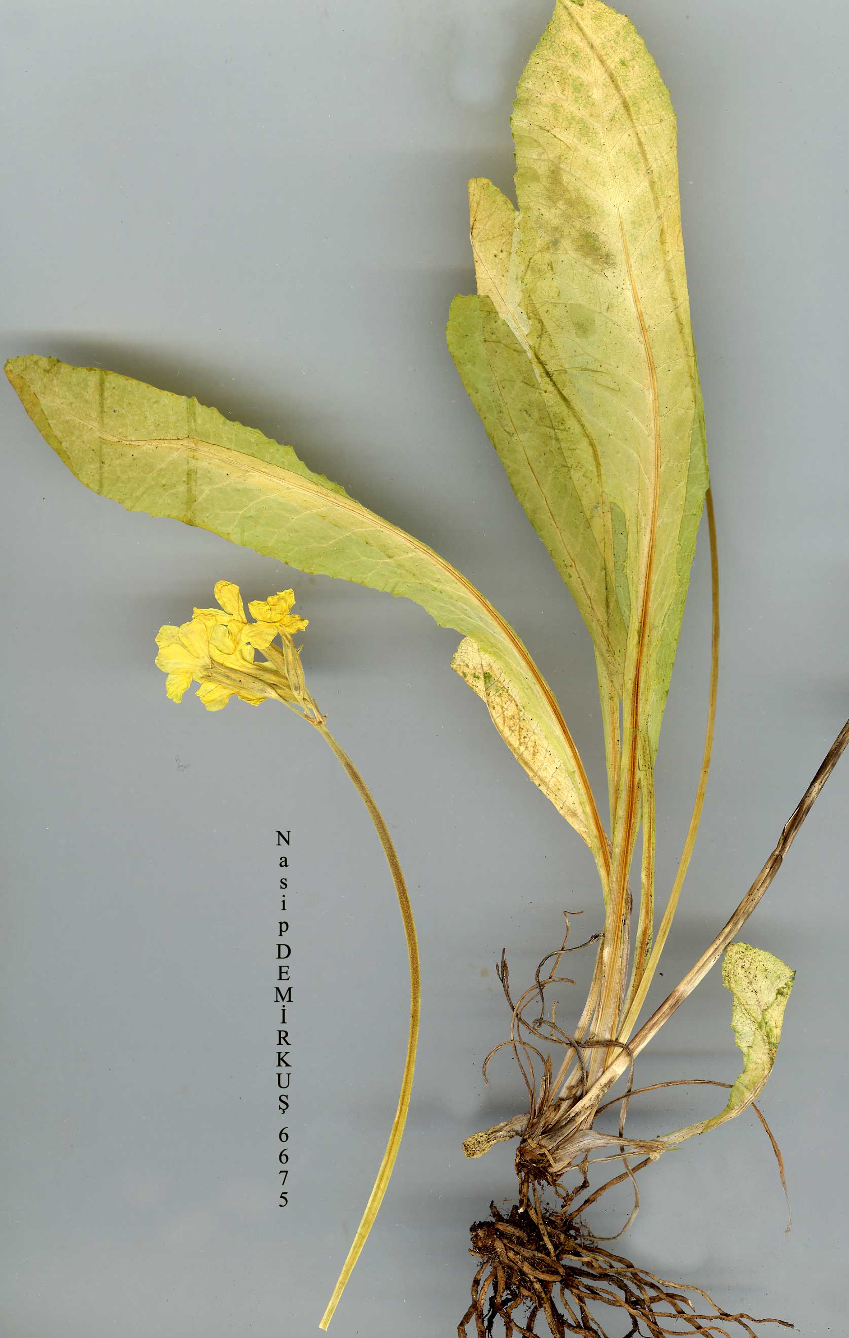 P. elatior (L.) Hill, Veg. Syst. 8:50 (1765); Smith & Fletcher in Trans. Bot. Soc. Edinb. 34:411-429 (1948). Perennial, 7.5-35(-47) cm with sturdy rootstock bearing numerous thickish or stringy roots. Leaves 2.5-16.5(-31) x 0.7-6.5 cm, lamina oblanceolate, elliptic or ovate, base cuneate or truncate, shorter or longer than winged petiole, glabrous to densely tomentose beneath, margin irregularly crenate-dentate. Scape usually with short glandular hairs above. Inflorescence 2-19-flowered, subsecund. Bracts ± linear to broadly triangular, usually shorter than pedicels. Pedicels 2-24 (-40) mm, unequal. Calyx 6-18 mm, cylindrical-campanulate, midribs often darker green, lobes l.5-5(-7) mm, ± acuminate, recurved or not, shortly glandular hairy. Corolla tube 9-19 mm, equalling or longer than calyx, lobes 4-12 mm, emarginate, pale yellow or lavender to purple. Capsule equalling or exceeding calyx in length. 1. Flower lavender to deep purple-violet; capsule often 2 x calyx subsp. meyeri 1. Flower yellow; capsule equalling to 1 ½ x calyx 2. Leaf lamina glabrous to shortly pilose beneath, obovate to elliptic subsp. pallasii 2. Leaf lamina ± densely tomentose beneath, ovate or elliptic subsp. pseudoelatior subsp. pallasii (Lehm.) W.W.Sm. & Forrest in Notes R.B.G. Edinb. 16:42 (1928); Smith & Fletcher in Trans. Bot. Soc. Edinb. 34:424-425 (1948). Syn: P. pallasii Lehm., Monogr. Prim. 38, t. 3 (1817); P. pallasii Lehm. subsp. pontica O.Schwarz, op. cit. 318 (1968)! Ic: Fl. Armenii 6: t. 9 (1973). Fl. (4-)5-7. Marshy alpine meadows and gullies, dry yayla slopes, (1300-) 1900-3200 m. Described from the Altai. Mainly N.E. & E. Anatolia. A7 Gümüşane: Stadodopi, Sint. 1894:5553! A8 Trabzon: Kuzitashi, Mesourach, 2470 m, Balls 438! Çoruh: Otingol, 2000 m, Stn. & Hend. 5971! Erzurum: Kop Da. pass, 2400 m, Tobey 2067! A9 Çoruh: d. Ardanuç, Kordevan Da. (Yalnizçam Da.), 2600 m, D, 30390! Kars: Ardahan to Artvin, 2700 m, Beyazoğlu 37! B6 Sivas: Çamlibel Da., 1300-1400 m, Bornm. 1893:3434 (type of subsp. pontica Schwarz)! B7 Erzincan: c. 20 km N. of Erzincan, road to Trabzon, 2000 m, lt. Leyd. 1959:1672! B8 Muş: Haçreş Da., Kurtik Da. to S. above Muş, 2200 m, Watson et al. 2821! Erzurum: Palandöken Da., 29 km from Çat to Erzurum, 2300 m, D. 47401! B9 Erzurum: Çakmak Da., 2560 m, E.S. Brown 2407! Ağri: Tahir Da. pass, 2400 m, Rix et al. 1650! Bitlis: Karz Da. above Kotum, 1980 m, D. 22231! Van: d. Çatak, Kavuşşahap Da., 3200 m, D. 23092! B10 Ağri/Kars: Ağri Da., Nordmann.C. Russia east to Soviet Central Asia, Transcaucasia. Euro-Sib. element. |