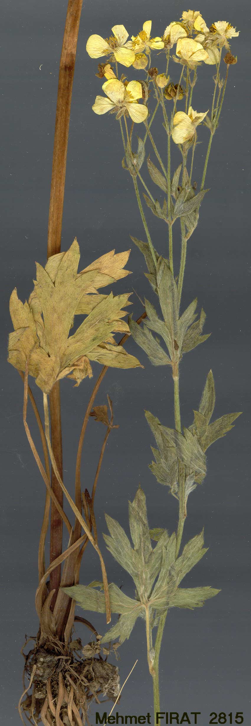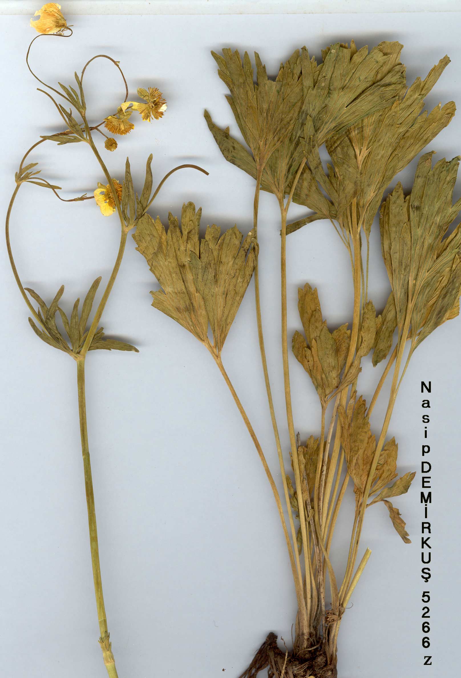 | R. crateris Davis in Notes R.B.G. Edinb. 23: 131, t. 6 (1960). Figures 3, 5, pp. 155, 173. Perennial, 15-40 cm, adpressed-pilose or glabrescent, greyish. Rhizome horizontal; collar strongly fibrous. Stems 1-6-flowered. Radical leaves subpinnatisect, ovate, with a stalked terminal segment and two pairs of lateral segments, all deeply dissected into oblong-cuneate laciniae often shortly incised near apex; upper leaves dissected into several long linear segments. Sepals reflexed. Petals 9-11 mm. Achenes semicircular, compressed, 3-4 mm, with a prominent nerve parallel to the margins, glabrous; beak falcate-circinate, 1-1.5 mm. Fl. 6-8. Volcanic slopes, 2300-3300 m. Type: Turkey B9 Bitlis: Nemrut Da., above Sogurt, 2350 m, Davis & O. Polunin (D. 23565, holo. K! iso. E!). S. Armenia. B9 Bitlis: Süphan Da., 3300 m, D. 24749 (leaves glabrescent, glaucous)! Endemic, Ir.-Tur. element. Closely allied to R. fenzlii. |