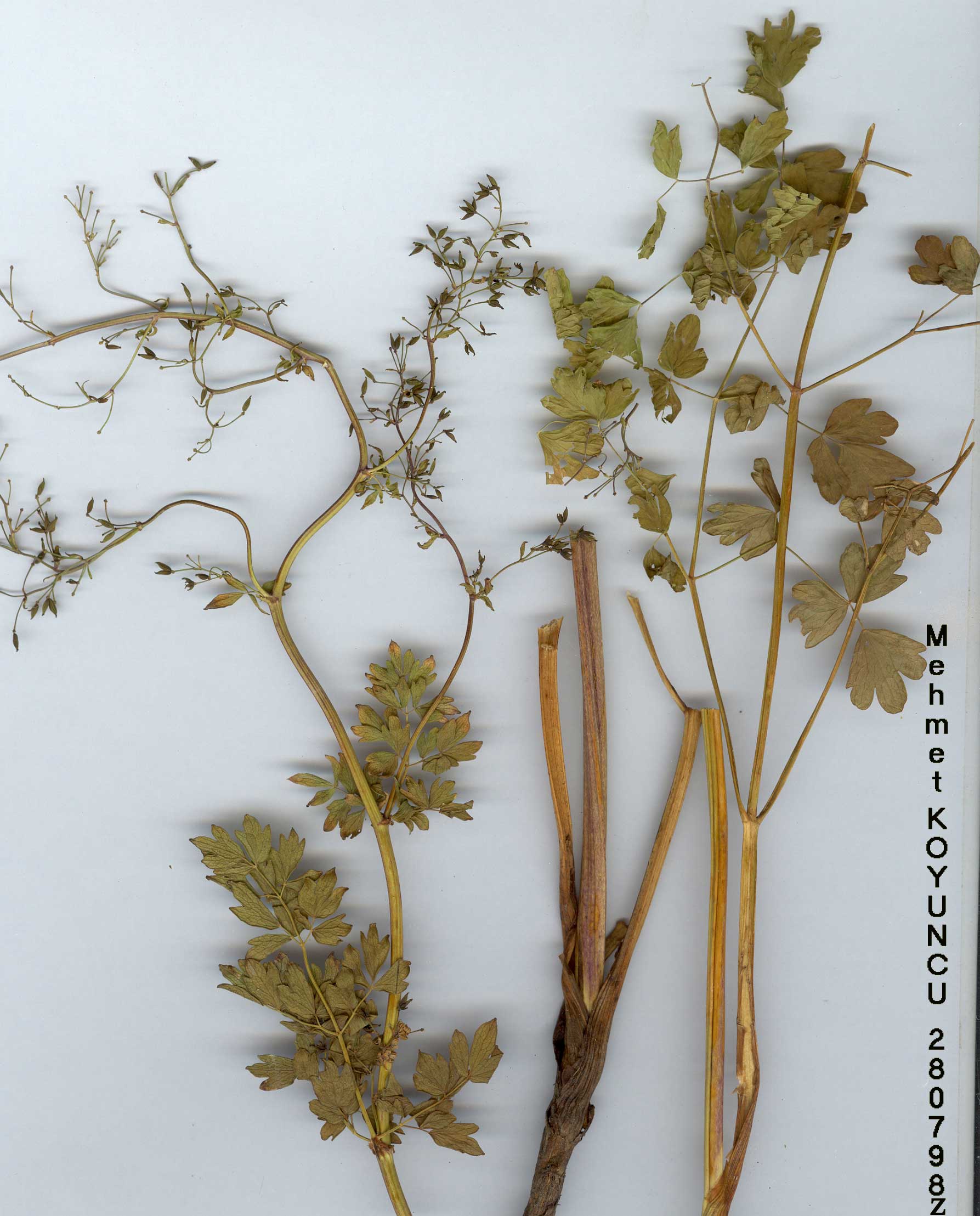 | T. minus L., Sp. Pl. 546 (1753). Usually glabrous herbs, green or slightly glaucous. Stems erect, up to 100 cm. Leaves ± triangular in outline, the two lateral divisions almost as large as the middle division. Ultimate segments very variable. Inflorescence a dense to lax panicle. Stigma not fimbriate. Achenes fusiform, ribbed, not compressed.A complex species which has been divided into many subordinate taxa. Three taxa, which are often difficult to distinguish, are recognisable in Turkey. The following account is only provisional, and further work on the complex is necessary. 1. Largest ultimate leaf segments less chan 9 mm; plants usually erect and strict var. microphyllum 1. Largest ultimate leaf segments more than 9 mm; plant usually not strict 2. Inflorescence lax, its lowest branches arising at about the middle of the stem var. majus 2. Inflorescence compact, its lowest branches arising in the upper part of the stem var. minus var. minus. Syn: T. minus sensu Boiss., Fl. Or. i: 8 (1867) pro parte. Ic.: Ross-Craig, Draw. Brit. Pl. 1: t. 3-5 (1948). Fl. 6-7. Damp meadows, 1800-2200 m. Described from Europe (Hb. Linn. 713/12 photo.!). Scattered. A6 Sivas: Zara to Şerefiye Y., 1550 m, Hub.-Mor. 14308! A8 Erzurum: Kop Da., Aşkale to Bayburt, 2000 m, Hub.-Mor. 10962! A9 Kars: Sari-kamiş, 2100 m, D. 30771! B3 Bilecik: Bozujuk (Bözüyük), 1929, Bernhard. B6 Kayseri: Sariz to Pinarbaşi, 1600 m, Hub.-Mor. 10961! Maraş: d. Göksun, Binboğa Da., 2200 m, D. 20002! C4 Içel: Gülnar to Ermenek, 1400 m, Hub.-Mor. 10402! Hub.-Mor. 10403 (from Içel: W of Gülnar, 915 m) agrees with subsp. minus but is very glandular. This may represent a new taxon. |