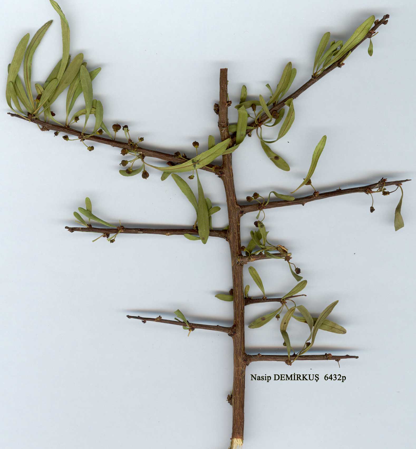R. pallasii Fisch. & Mey., Ind. Sem. Hort. Petrop. 4:46 (1837). Ic: Fl. URSS 14: t. 37 f. 2 (1949). Figure 16, p. 529. Map 59, p. 535. Shrub 1-3 m, branches alternate, young spines glabrous or puberulous, brown. Leaf lamina linear-oblanceolate, 20-30 x 4-6 mm, remotely crenate-serrulate or rarely subentire, puberulous or glabrous on both sides, attenuated into a short petiole. Fruiting pedicels c. 5 mm. Disc glabrous. Fruit 4-5 mm diam.; seed with a bifid groove. Fl. 5. Rocky slopes, 450-1600 m. Syntypes: [Caucasia, N. Iran] in promontorio Caucasico, in Iberia, ad mare Caspium, in altioribus montibus Talüsch, nec non in Persia boreali (BM!) A7 Gümüşane: nr. Gümüşane, Sint. 1894: 5530! A8 Gümüşane: Bayburt, Bourgeau. Çoruh: Çoruh gorge between Artvin and Ardahan, 450 m, D. 30048! A9 Çoruh: Ardanuç, 500 m, D. 30173! Kars: Kars to Göle, 10 km S of Karin-cadüzü, 1600 m, Mutlu! B7 Erzincan: Akdağ, Balls 1510! B8 Erzurum: Tercan to Selepür, 1400 m, D. 30957! B9 Kars: nr. Kağizman (Grossheim 6: map 148). B10 Kars: Aralykh to Takjalty in Aras plain, 9 viii 1910, B. Post! Transcaucasia, N., N.W. & W. Iran. Distinguished from all other Turkish species by its long narrow leaves. R. medwedewii M. Sachok. (R. pallasii var. araratica Medw.), recorded from Ararat (Grossheim 6: map 149), is probably conspecific. Grubov (op. cit.) treats the variable R. spathulifolius Fisch. & Mey. as a hybrid between R. pallasii and R. catharticus. It has been recorded from B9 Kars: Kağizman (Grossheim 6: map 150). |