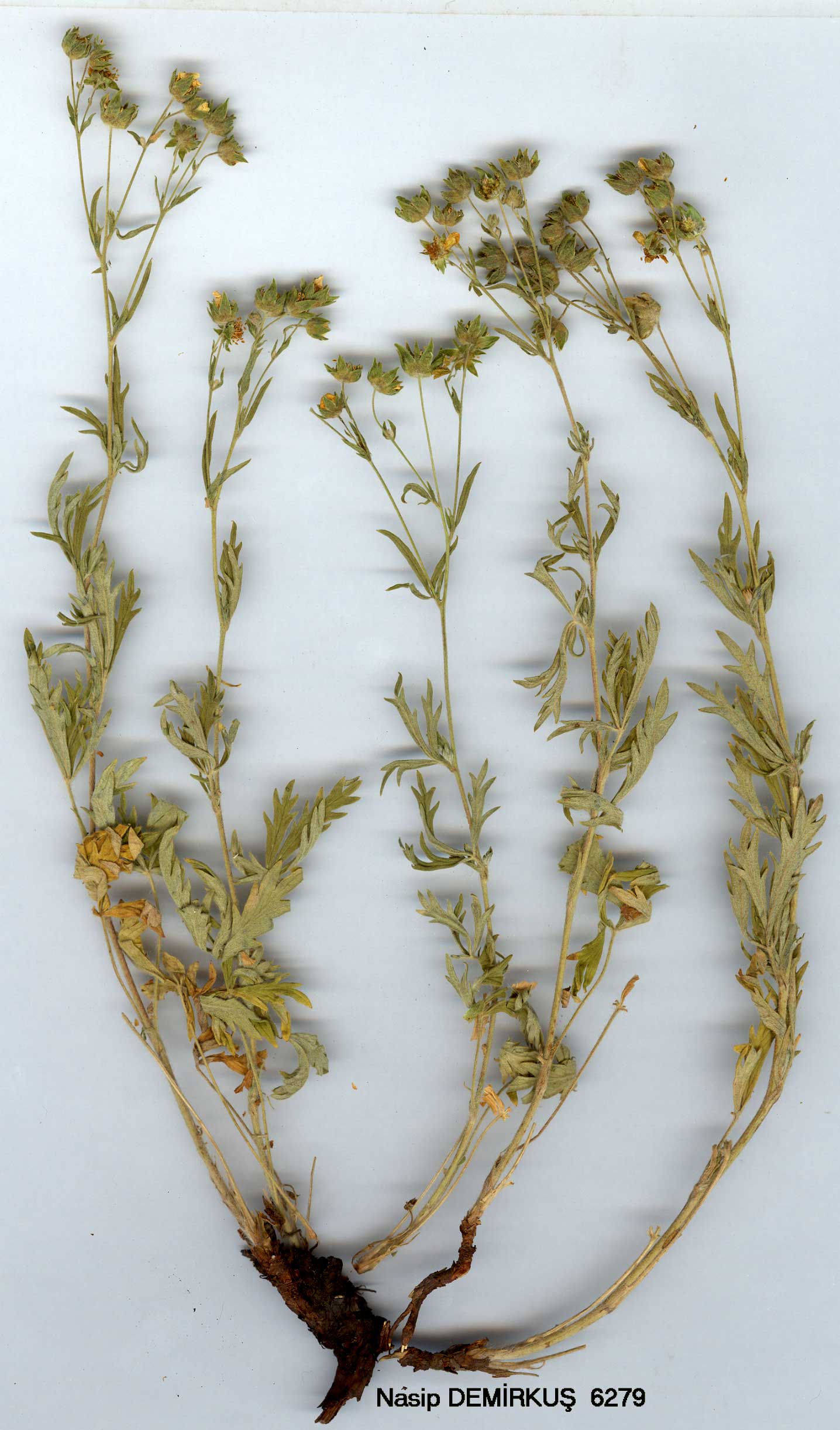| P. argentea L., Sp. PL 497 (1753). Ic: Reichb., Ic. Fl. Germ. 25: t. 23 (1910). Erect or ascending, tomentose perennial, 8,-50 cm. Leaves digitate; leaflets usually 5, cuneate to obovate, 10-30 x 5-12 mm,'incised-dentate to pinnatifid, densely tomentose beneath, sparsely pubescent, green above. Inflorescence a terminal cyme. Epicalyx segments linear-oblong. Sepals ovate-lanceolate, 2-5 mm. Petals yellow, obcordate, 3.5-5 mm, usually longer than sepals. Achenes rugulose; style subterminal, conical and papillose below. Fl. 6-8. Rocky slopes, pastures, 1100-2400 m. Described from Europe (Hb. Linn. 655/16, photo!). N. & E. Turkey. A1(E) Kırklareli: c. 15 km W. of Iğneada, K. Bauer & Spitz. 2622! A2(A) Bursa: Uludağ, Diktekir, 28 vii 1944, Heilbronn! A4 Kastamonu: 30 km S. of Kastamonu, 1300 m, Sorger 69-13-105! A6 Samsun: Nebyan Da., 1100 m, Tobey 354! A7 Giresun: below Tamdere, 1600 m, D. 20641! A9 Kars: Kisir Da. above Susuz, 2000 m, D. 30512! B8 Erzurum: 5 kmN. of Hinis, 1650 m, D. 46290! B9 Ağri: E. side of Tahir Pass, 19 km from Eleşkirt to Horasan, 2400 m, D. 47087! B10 Kars: Aralik, Ağri Da. at Serdar Bulak, 2300 m, D. 46929! Europe, Caucasia, Iran, N. & C. Asia, N. America. A very variable species in density of indumentum and shape and size of leaflets. The following specimens differ in their taller stems, larger leaves and very dense indumentum: A4 Ankara: Kizilcahamam, Alis Da., 1250 m, Khan et al. 573! B7 Tunceli: Hozat-Ovacik, 2000 m, D. 31096! B9 Bitlis: d. Kotum, Karz Da. above Kemer, 2200 m, D. 24575! The possibility that these have arisen through introgression between P. argentea and the closely allied P. meyeri cannot be ruled out. In Europe the P. argentea group is known to be a polyploid complex whose members may be either amphimictic or apomictic (cf. Fl. Europaea 2:41, 1968). |