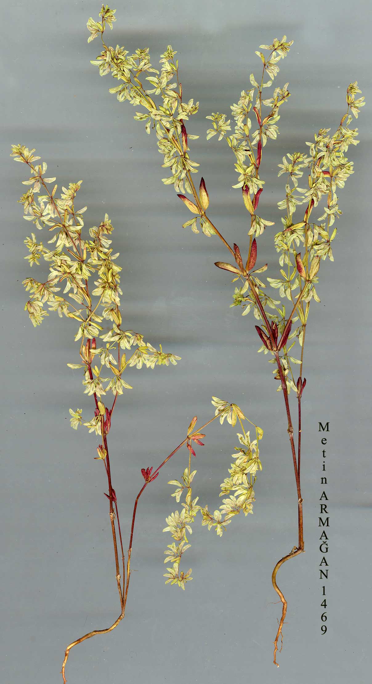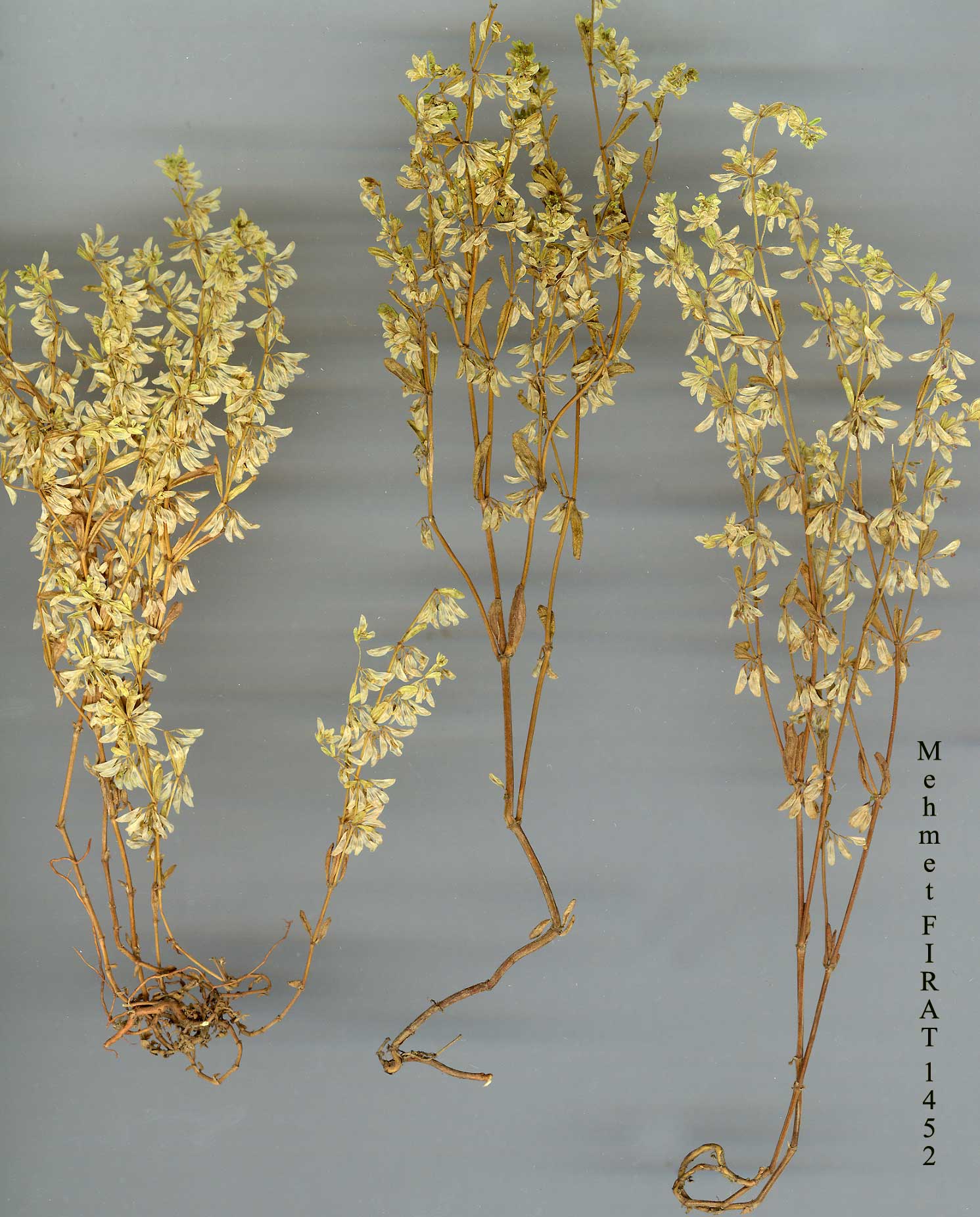 C. cucullaria (L.) Steven in Mem. Soc. Nat. Mosc. 7:275 (1829). Syn: Valantia cucullaria L. in Jusl., Cent. PI. 1:32 (1755) et Amoen. Acad. 4:296 (1759)! C. cucullaris (L.) Rothm. in Feddes Rep. 50:72 (1941). Ic: Boul., Fl. Lib. Syr. t. 191 f. 5(1930). Stems (3-)5-20 cm, erect to ascending, simple to much branched, often from base, branches quadrangular, ± retrorsely scabrid mainly on angles, somewhat hirsute to glabrous. Leaves 3-13 x 1-4 mm, lower in whorls of 4(-6), oblanceolate- to oblong-spathulate, obtuse, shortly petiolate (petiole c. 1-2 mm), upper in pairs, elliptic-oblong to to sublinear, somewhat antrorsely scabrid along margins, glabrous to sparingly puberulent, mainly along vein. Cymes subsessile, 5-7(-9)-flowered, reflexed; central flower sessile, naked; lateral pedicellate, pedicels usually hirsute, 0.5-1.5 mm, subtended by bracts; bracts broadly elliptic to suborbicular, (3-)4-5 mm in fruit, prominently veined below, usually plicate and folded lengthwise around fruit, sometimes flat, glabrous, only margins somewhat hairy towards base. Corolla yellowish-green to purplish, 0.5-0.65 mm diam., cup-shaped. Mericarps dark brown, 1.5-2 mm, cylindrical, somewhat curved, hispidulous mainly towards apex. Fl. 3-5. Dry gravelly or stony places, steppe, 300-2000 m. Type: Buxbaum, Cent. 1: t. 19 f. 2! Widespread except for Wr Anatolia. A2(A) Bilecik: nr Bilecik, 300-400 m, Bornm. 1929:14216. A3 Ankara: NaUihan, 650 m, D. 37035! A5 Amasya: Amasya, 400-600 m, Bornm. 1889:497! A6 Tokat: Erbaa, Kale Köy, 300 m, Tobey 700! A8 Erzurum: 15 km S.W. of Ispitlin, 1350 m, Tatli 4405! A8/9 Erzurum: d. Oltu, Sosnowsky. B4 Konya: 30 km N. from Konya to Afyon, 1300 m, Sorger 66-40-13! B5 Kayseri: Erciyas Da. nr Soisaly, c. 1100 m, vi 1902, Zederbauer! B6 Sivas: 12 km S. of Gürün, 1800 m, Sorger 73-33-54! B7 Diyarbakir: 26 km N. of Diyarbakir, 680 m, Hub.-Mor. 13866! B8 Siirt: Sassun (Sason), 1200 m, Hand.-Mazz. 657. B9 Van: 5 km N. of Çatak, D. 23267a! C2 Denizli: N.E. of Pamukkale, 500 m, Sorger 66-7-18! C3 Burdur: Bucak, 800 m, Tengwall 345! C4 Içel: 25 km E. of Mut, 1350 m, Sorger 71-18-23! C5 Içel: nr Mersin, Siehe 464! C6 Gaziantep: Gaziantep, Haradj. 1326! C7 Urfa: Urfa, c. 460 m, 28 iv 1865, Hausskn.! C8 Mardin: 8 km from Mardin to Nusaybin, 850 m, D. 28492! C9 Siirt: Cizre to Şirnak, 25 km below Şirnak, 750 m, D. 42569! C10 Hakkari: 30 km from Başkale to Hakkari, 1900 m, D. 44675! C. & S. Spain, N. Africa, S.W. & C. Asia. Ir.-Tur. element. A specimen from C6 Gaziantep: 36 km from Gaziantep to Nisib, D. 27896! comprises partly f. aperta (Boiss. & Buhse) Ehrend. in Notes R.B.G. Edinb. 22:397 (1968) (Syn: C. aperta Boiss. & Buhse, Aufz. 110, 1860) with flat bracteoles, not hiding the fruit. |