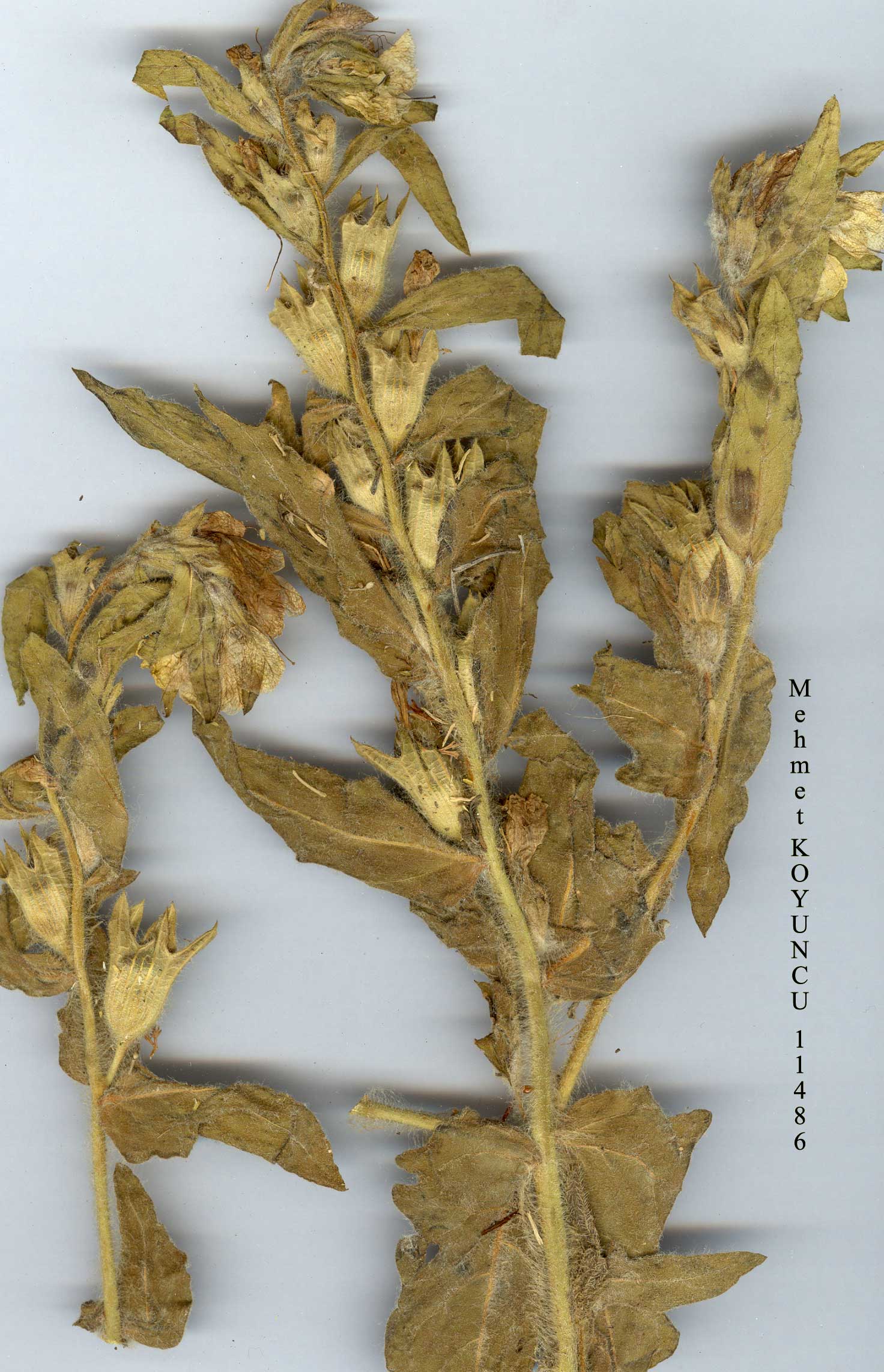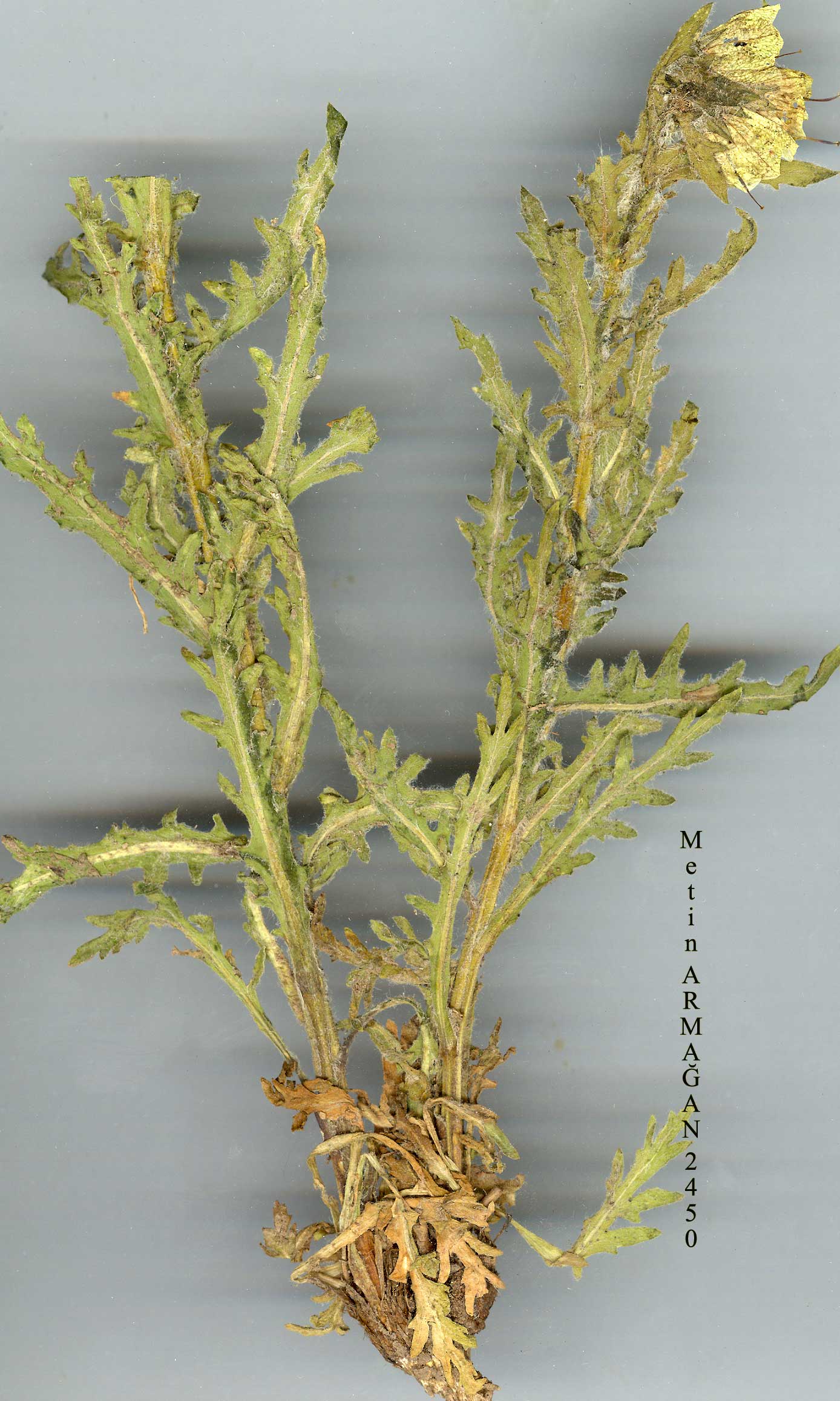 H. niger L., Sp. Pl. 179 (1753). Syn: H. bohemicus F.W. Schmidt, Fl. Boëm. 3:31 (1794); H. pallidus Waldst.' & Kit. ex Willd., Enum. Pl. Horti Berol. 1:228 (1809); H. agrestis Kit. ex Schultes, Österreichs Fl. 1:383 (1814); H. syspirensis C.Koch in Linnaea 22:776 (1849); H. persicus Boiss. & Buhse in Nouv. Mem. Soc. Nat. Mosc. 12:158 (1860). Ic: Yakar, Renk. Türk. Bitk. Atl. t. 40 (1964); Polunin, Fls. Europe t. 117 (1969). Glandular-villous annual or biennial, stems 20-100 cm. Leaves ovate-oblong to oblong-lanceolate, 5-25 cm, lobes triangular-lanceolate, acute, basal tapering into a short petiole, cauline sessile, amplexicaul. Calyx 10-15 mm, in fruit 20-40 mm, constricted at middle, ventricose part densely hairy, teeth pungent. Corolla lurid yellow, purple reticulate, throat dark purple, rarely completely pale, 25-35 mm. Stamens included. Anthers purple. Fl. 4-8. Stony or rocky places, cereal fields, roadsides, waste places, s. 1.-2300 m. Described from Europe (Hb. Linn. 244/1, photo). Widespread. A1(E) Kirklareli: Kirklareli to Dereköy, 300 m, A.Baytop (ISTE 24437)! A2(E) Istanbul: Çatalca, A.Baytop (ISTE 7609)! A2(A) Kocaeli: Yalova to Izmit, A.Baytop (ISTE 12536)! A3 Bolu: Abant, A.Baytop (ISTE 2515)! A4 Kastamonu: 10 km from Daday to Azdavay, 1200 m, Coode & Yalt. (D. 38645)! A5 Amasya: Kavza to Merzifon, T. Baytop (ISTE 15441)! A6 Ordu: Fatsa to Aybasti, 800 m, Tobey 1380! A7 Trabzon: Meryemana, 1220 m, Apold et al. 79! A8 Erzurum: Ispir, 1844, C.Koch (type of H. syspirensis). A9 Kars: Ziyaret Da. (Yalnizçam Da.), above Yalnizçam, 2300 m, D. 30325! Bl Çanakkale: Edremit to Ezine, TV. & M.Tanker (ISTE 11074)! B2 Kütahya: Tavşanli, Benli (ISTE 5844)! B3 Eskişehir: Kütahya to Bozüyük, 1100 m, A.Baytop (ISTE 25805)! B4 Ankara: Çankaya, 1000 m, Lindsay 82a! B5 Niğde: Taşpinar to foot of Hasan Da., D. 18857! B7 Tunceli: Pülümür, 1550 m, D. 29244! B8 Siirt: Kandiltepe, Hergemo village, 10 km W. of Kozluk, 1500 m, Watson et al. 1145! B9 Ağri: nr Suluçem (Musun), 1850 m, D. 47239! Cl Aydin: Koçarli, Çakmar köyü, N. & M.Tanker (ISTE 8040)! C2 Muğla: Fethiye to Korkuteli, nr Dirmil, Büyüktimkin (ISTE 26330)! C3 Isparta: Davras Da., A.Baytop (ISTE 9619)! C6 Maraş: 10 km S. of Maraş, 550 m, D. 27331! C7 Urfa: Siverek, Kainar, Sint. 1888:1229! C10 Hakkari: 10 km W. of Yüksekova, 1950 m, Duncan & Tait 234! Is: Lesvos, Rech. 5887a. Temperate regions of N. Hemisphere. |