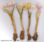 Corm 1.5-3(-4) x (l-)2-3 cm, ovoid; outer tunic blackish-brown, inner reddish-brown, papery to subcoriaceous, neck absent or vestigial. Leaves 2-3, synanthous, ligulate or very narrowly linear-lanceolate, suberect, extending 2-6(-12) cm at anthesis, (12-) 16-21 (-25) x(1.2-}2-3.5 cm at maturity, apex acute and often cucullate, glabrous. Flowers (l-)2-5(-7), ovoid-campanulate, sometimes campanulate or narrowly campanulate. Perianth segments deep to pale purplish-pink or white, strongly suffused purplish-pink, obianceolate to very narrowly elliptic, (2.1-)2.7-3.5 cm x 4-10 mm, acute or less frequently obtuse, occasionally with basal auricles. Filaments 7-11 mm, giabrous; anthers purplish-black or greenish-black, 2-4(-5) x i mm; pollen yellow. Styles straight, stigmas punctiform. Capsule ellipsoid to rotund, 3.5(-4 x 1.5-2.2 cm, mid-brown, glabrous, apiculate. Fl, 2-5(-8). Wet meadows, moist alpine turf, steppe, edges of Pinus forest, 200-3250 m. Type: [USSR, Caucasia] in montibus Somchetiae, Szovits (holo. LE! iso. — leaf & fr. — H!). The isotype in H also bears flowers of C. laetum or C. autumnale. N. Turkey, Inner & S. Anatolia. A 1(E)Tekirdağ: Tekirdağ to Inecik, 200 m, A. Baytop (ÎSTE 14883)! A3 Bolu: AbantG., 1100m.Brickell&Mathew 8508! A4 Ankara: Isık Da. pass between Gerede and Kizilcahamam, 1500 m, Watson et al. 510! A6 Sivas: 30 km W. of Suşehri, 1850 m, Kukkonen 5429! A7 Gümüşane: Kaldirim Da., Sint. 1894:5466! Kolath dagh (Kolat Da.), 2440-2475 m, v 1853, Huet (type of C, szovitsii var. nivale)\ A8 Gümüşane: Kop Da. pass, 2400 m, Furse & Synge 829! A9 Kars: Sarikamiş 2000 m, Güneş 1557! B3 Kütahya: Yenice köyü, T. Baytop (ISTE 12486)! B5 Kayseri: Erciyas Da., 2130 m, Balls 240! B6 Maraş: Göksün, 1300 m,Yildiz 2364? B7 Erzincan: Refahiye to Erzincan, 2150 m, Bails 268! B8 Erzurum: 10 km E. of Erzurum, 1890 m, Uotila 15656! B9 Ağri: 15 km W. of Ağri, 1700 m, Kukkonen 5445! C3 İsparta: d. Eğridir, Kapiz, 2 km to Yakaköyil, 1500-1600 m, Peşmen & Güner 2004! C5 içel: nr Giosna (Gözne), Siehe 95 (as C. acuti-folium)\ C6 Maraş: Berit Da., 2500 m, Yildiz 2035! C8 Diyarbakir: nr Diy-arbakir, Sauer 136/57! C10 Hakkari: Mor Da., 3250 m, Watson et al. 2990! Caucasus, Iran. Ir.-Tur. element. Considerable confusion has occurred since Stefanoff used the name C. szovitsii Fisch. & Mey. for plants from N.E. Anatolia, S. & W. Iran and Transcaucasia having 4-5 canaliculate, narrow leaves and starry white or purplish-pink flowers which are here referred to C. falcifolium Stapf. Examination of the holotype of C. szovitsii has shown it to be quite distinct, with 2-3 broad leaves and squat obovoid flowers. ît appears to be inseparable from C. bifolium Freyn & Sint. ex Freyn (1896). The holotype of C. armenum B. Fedtsch. (1920), also at LE, does not significantly differ from specimens of C. szovitsii and the two taxa are here united. The name C, nivale Boiss. & Huet ex Stef. has been applied to diminutive, few-flowered forms of C. szovitsii but variation in the size and number of the flowers and leaves occurs throughout the range of the latter and appears to be more of ecological than taxonomic significance. Siehe 95 from C5 içel, labelled C. acutifolium, closely resembles small, few-flowered plants from A7 Trabzon and A7 Gümüşane previously identified as C. nivale; they appear merely to form part of the natural variation of C, szovitsii. The most vigorous plants are normally found growing in lush meadows, often in very wet conditions, while those of smaller stature occur mainly in well-drained montane steppe. Although the tunics of the shorter plants are usually less well-developed than those from moister habitats, no other significant differential characters have been found to separate them. Extreme states appear distinct but specimens intermediate in size and other characters occur throughout the range. The number of leaves has been considered significant but plants with 2 or 3 leaves may grow together in natural populations. Vigorous plants with 3 leaves from C5 içel, separated as C. hydrophilum Siehe, differ in no other way from 2- or 3-leaved plants from N. Anatolia here referred to C. szovitsii. Material collected by Siehe in Cappadocia (Siehe 101, as C. hygrophilum Siehe) and referred by Hayek in Ann.Nat.Hofmus. Wien 28:183 (1914) to C. brachy-phyllum Boiss. & Hausskn. ex Boiss., is inseparable from robust 2-3-leaved specimens of C. szovitsii. The holotype of C. brachyphyllum (Hausskn. 923, G!) has 4 leaves (the outermost narrowly ovate, the inner lanceolate) and up to 15 flowers. Other specimens apparently referable to C. brachyphyllum have 4-6 lanceolate to narrowly lanceolate leaves but no authentic material of this taxon has been seen from Turkey. |