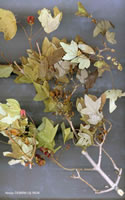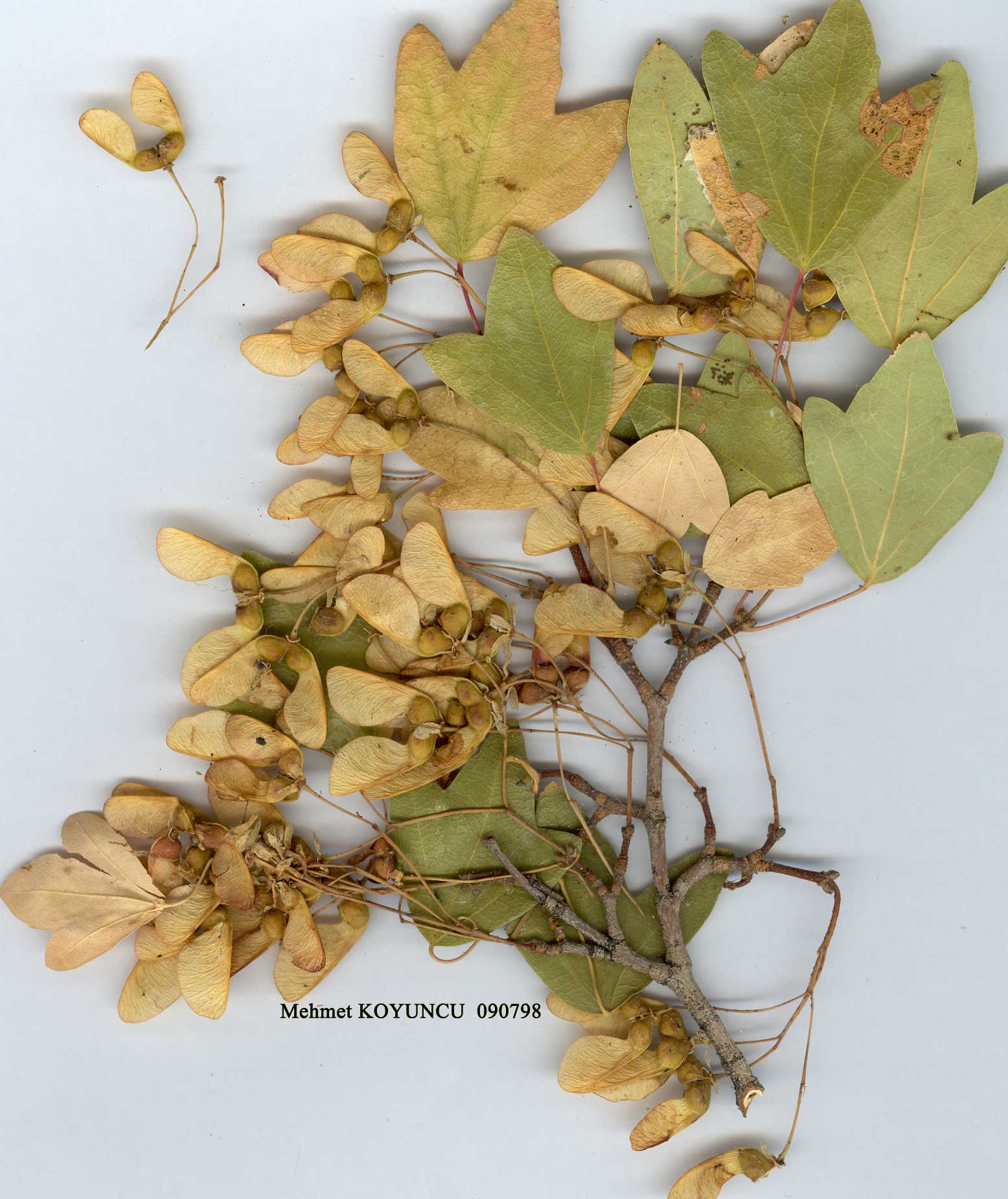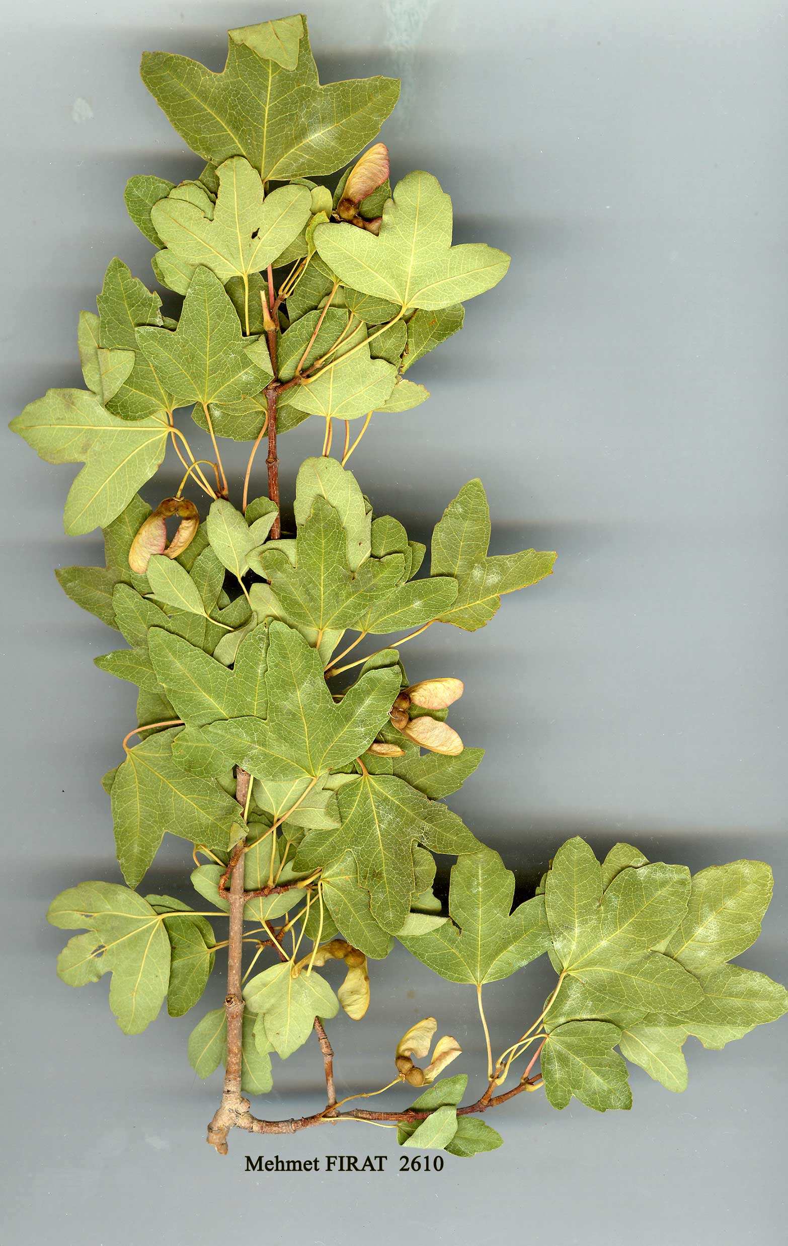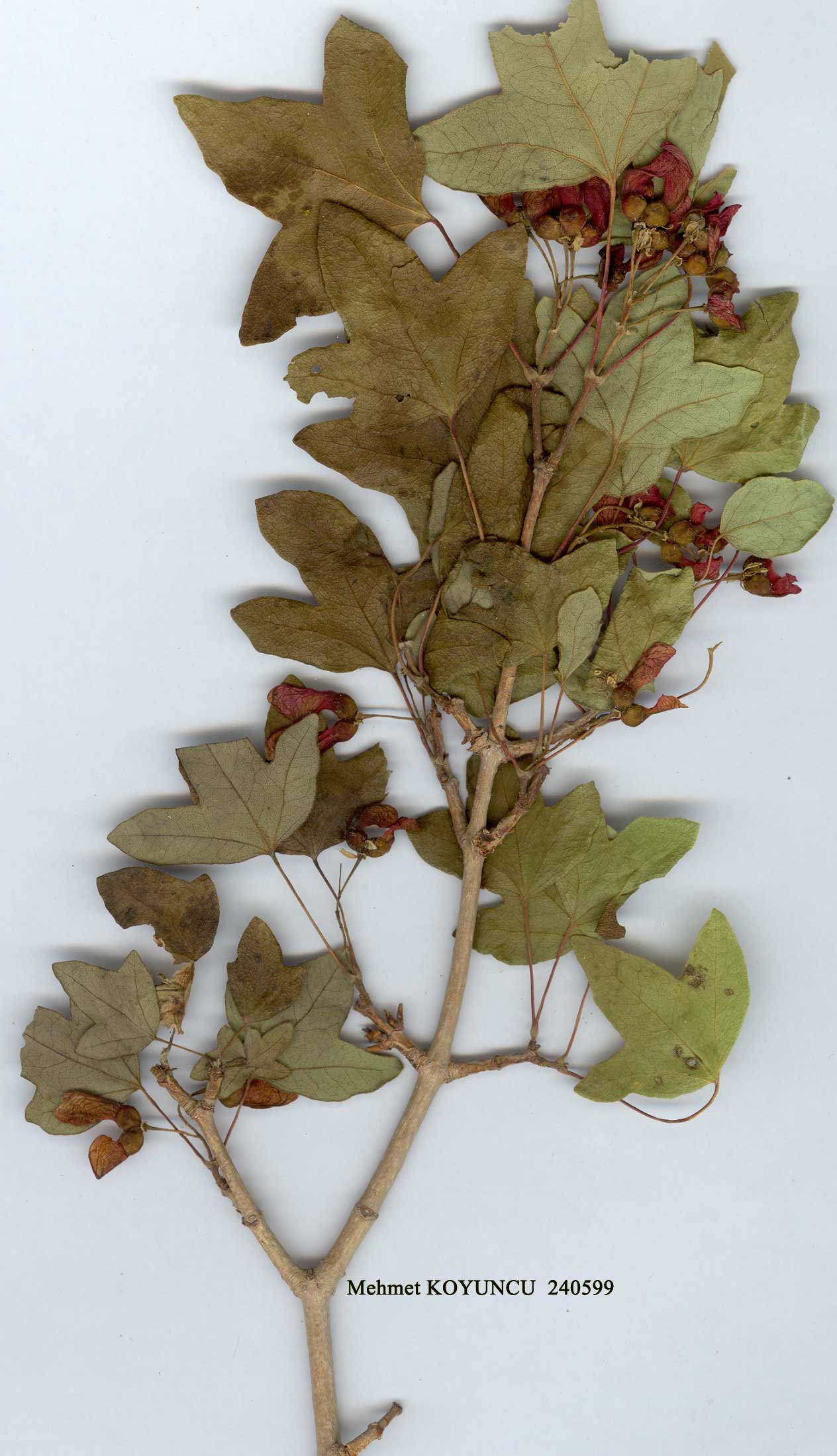 | A. monspessulanum L,, Sp. PL 1056 (1753). Map 49, p. 515. Shrub or small tree up to 7(-12) m. Young branches glabrous, pubescent or villosulous. Leaf blade 3-lobed to ½-? (sometimes 5-lobed or coarsely dentate on sterile shoots), 1.1-6 x 1-7.8 cm, rounded or subcordate at base, lobes triangular-ovate to ovate-oblong, entire or ± denticulate, subcoriaceous, lower surface glabrous, pubescent or tomentose; petiole glabrous, pubescent or tomentose, 5-10 cm, not lactiferous. Flowers in erect, shortly pedunculate, more than 5-flowered corymbs. Fruit wings nearly parallel to divaricate (angle between the outside edges of the wings 20-85°), 14-22 x 5-11 mm; nutlets not compressed, rounded, glabrous, pubescent or tomentose; loculus hairy or glabrous. Fl. 4-5. A very variable species. Five subspecies can be recognised in Turkey; other taxa occur in Iran. 1. Loculus (inside) glabrous; sepals not ciliate; leaves glabrous subsp. monspessulanum 1. Loculus (inside) hairy; sepals ciliate; leaves glabrous or hairy beneath . 2. Nutlets glabrous; leaves glabrous or shortly pubescent beneath 3. Leaves glabrous on both sides 4. Leaf blade divided to f, usually less than 3.5 cm, middle lobe narrowly oblong-ovate, 7-15 mm broad at base subsp. microphyllum 4. Leaf blade divided to halfway, more than 3.5 cm, middle lobe broadly ovate, 17-25 mm broad at base subsp. ibericum 3. Leaves shortly adpressed-pubescent on the lower surface (leaf shape as in subsp. ibericum, 2-6 cm) subsp. cinerascens 2. Nutlets ± tomentose; leaf tomentose beneath subsp. oksalianum subsp. cinerascens (Boiss.) Yalt. in Notes R.B.G. Edinb. 28: 10 (1967). Syn: A. cinerascens Boiss., Diagn. ser. 1(4): 29 (1845)! A. assyriacum Pojark. in Act. Inst. Bot. Acad. Sc. Fasc. 1: 145 (1933). Ic: Schneider, I11. Handb. Laub. 2: f. 158, 159 (1907). Rocky limestone slopes, 1100-2000 m. Type: In Persia australi prope urbem Schiraz, Kotschy 37 (K!). B9 Bitlis: Reşadiye to Kotum, 2000 m, D. 22375! Van: 15 km N of Şatak, D. 22986a! C6 Maraş: Ahir Da., 1200 m, Balls 924! C8 Mardin: 5 km E of Mardin, 1100 m, D. 28598! C9 Hakkari: Zab gorge, 40 km S of Başkale, D. 23846! N. Iraq, W. & S. Iran, S. Transcaucasia. Ir.-Tur. element. A very similar specimen has been seen from Algeria. |