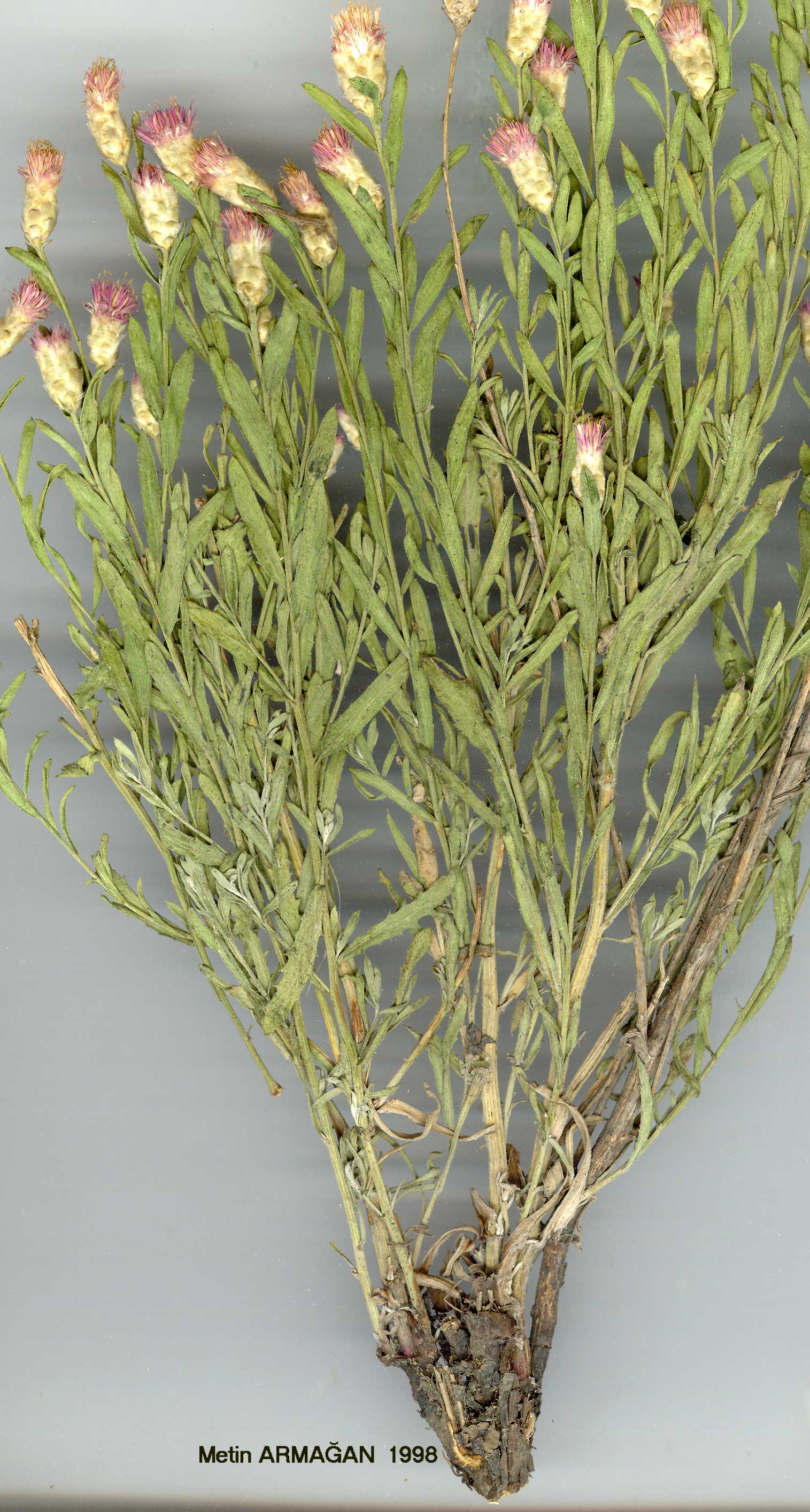 | A. repens (L.) DC, Prodr. 6:663 (1838). Syn: Centaurea repens L., Sp. PL ed. 2:1293 (1763); C. picris Pallas ex Willd., Sp. Pl. 3:2302 (1803); Serratulapicris (Willd.) Bieb., Fl. Taur.-Cauc. 3:546 (1819); Acroptilon picris (Willd.) DC, op. cit. 662. Ic: Jaub. & Spach, I11. Pl. Or. 1: t. 10, 11 (1842); Not. Syst. (Leningrad) 7(3): f. 4A (1937); both as A. picris. Plant erect, 16-40 cm, stems branched from base. Leaves simple, subsessile, elliptic to linear, usually lower and median serrate, upper entire, up to 7 x 2 cm. Involucre up to 1.5x1 cm; outer phyllaries short and broadly oblong, inner longer and narrowly oblong, basal parts almost concealed by appendages; appendages broadly crescentic and often apiculate on median phyllaries, narrowly triangular on innermost, villous, sometimes purplish. Achenes c. 3-4 x 2 mm;pappus c. 8-10 mm. Fl. (5-)6-7(-10). Gravel river terraces, edge of salt lakes, steppe, waste fields, 800-1650 m. Described from the Orient (Hb. Linn. 1030/34, photo!). Mainly Inner & S. Anatolia. A4 Ankara: 36 km N.W. of Ankara, 950 m, Sorger 62-80-33! A5 Kastamonu: Tosya, Karvak-Tschesme (Kavakçeşme), Sint. 1892:4388! A9 Kars: Kağızman to Akçay, 1100-1200 m, D. 46872! B2 Kütahya: Gediz, 850 m, D. 36890! B3 Eskişehir: 11 km E. of Eskişehir, Sorger 64-11-23! B4 Ankara: N.E. shore of Tuz G., 950 m, Darrah 194! B5 Nevşehir: nr Ürgüp, Alava 7161! B7 Erzincan: Baş-taş on Demir Maghara Da., Sint. 1890:2921. B8 Erzurum: 66 km from Hinis to Pasinler, 1650 m, D. 46450! B9 Van: Van, N. foot of castle rock, D. 22633! B10 Ağri: Doğubayazit, 915 m, Hewitt 155! Cl Aydin: Scalanova (Kuşadasi), Schwarz obs. C2/B3 Afyon: Denizli to Çardak, 25 km from Dinar past Aci G., 800-900 m, Dudley (D. 35613)! C2 Antalya: Elmali, 16 vi 1860, Bourgeau 292! C3 Isparta: d. Sütçüler, between Tota beli Y. and Daribükü, 1000 m, D. 15886! C4 Konya: Göksu De. below Ermenek, 800-1000 m, D. 16213! S. Russia, Crimea, Caucasia, N. Iraq, Iran, Afghanistan, Transcaspia, Mongolia. Ir.-Tur. element. A noxious weed in N. America. |