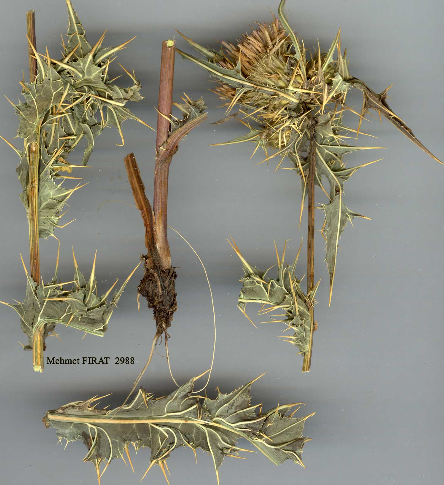 | C. obvallatum (Bieb.) Fischer in Cat. Jard. Gorenki ed. 2:35 (1812). Syn. Cnicus obvallatus Bieb., Fl. Taur.-Cauc. 2:279 (1808). Ic: Fl.Azerb. 8: t. 40 f. 2 (1961), poor. Perennial, 25-70 cm. Stems unwinged, shortly corymbose and few-capitulate above. Median cauline leaves oblong-pinnatifid, lobes shortly divided into several triangular shortly spined lobules (spines slender, 1-6 mm), subglabrous, pale bright green (in vivo), base ampiexicaul and spinose-lobulate. Capitula 2-6(-10) per stem, overtopped by many involucrate leaves which are linear-lanceolate and deeply dissected into many very unequal slender whitish simple or pinnatisect spines. Involucres hemispherical, 17-20 mm, glabrous, phyllaries 6-7-seriate, median oblong-lanceolate, with a darkened linear 4-6 mm vitta, acuminate intoa short spinule. Corollas 16-18 mm, greenish-white; anther tube mauve. Achenes c. 4 mm. Pappus c. 14 mm. Fl. 8. Ravines, rocky igneous slopes near streams, 2050-2800 m. Type: [Georgia] in herbidis subalpinis Caucasi, circa acidulam Narzana, versus cacumen Beschtau et in convallibus alpium ibericarum (LE). N.E. Anatolia. A8 Çoruh: Şavval Tepe above Murgul, 2700-2800 m, D. 32272! A9 Çoruh: Yalnizçam Da., nr Kutul, 2050 m, D. 32444! Caucasia, N. & N.W. Iran. Hyrcano-Euxine (mt.) element. Material seen from N. Iran (Bornm. 7284) has longer stouter spines than that from Turkey. In N.W. Iran this species varies in the direction of C. hygrophilum Boiss. In Turkish material of C. obvallatum grown in Scotland (D. 32444), the involucral leaves are shorter and less conspicuous than in the wild gathering. A hybrid between this species and C. simplex (C. x koslowskyii Petrak!) has been collected at Bakuriani in Adjaria and should be looked for in neighbouring Çoruh. |