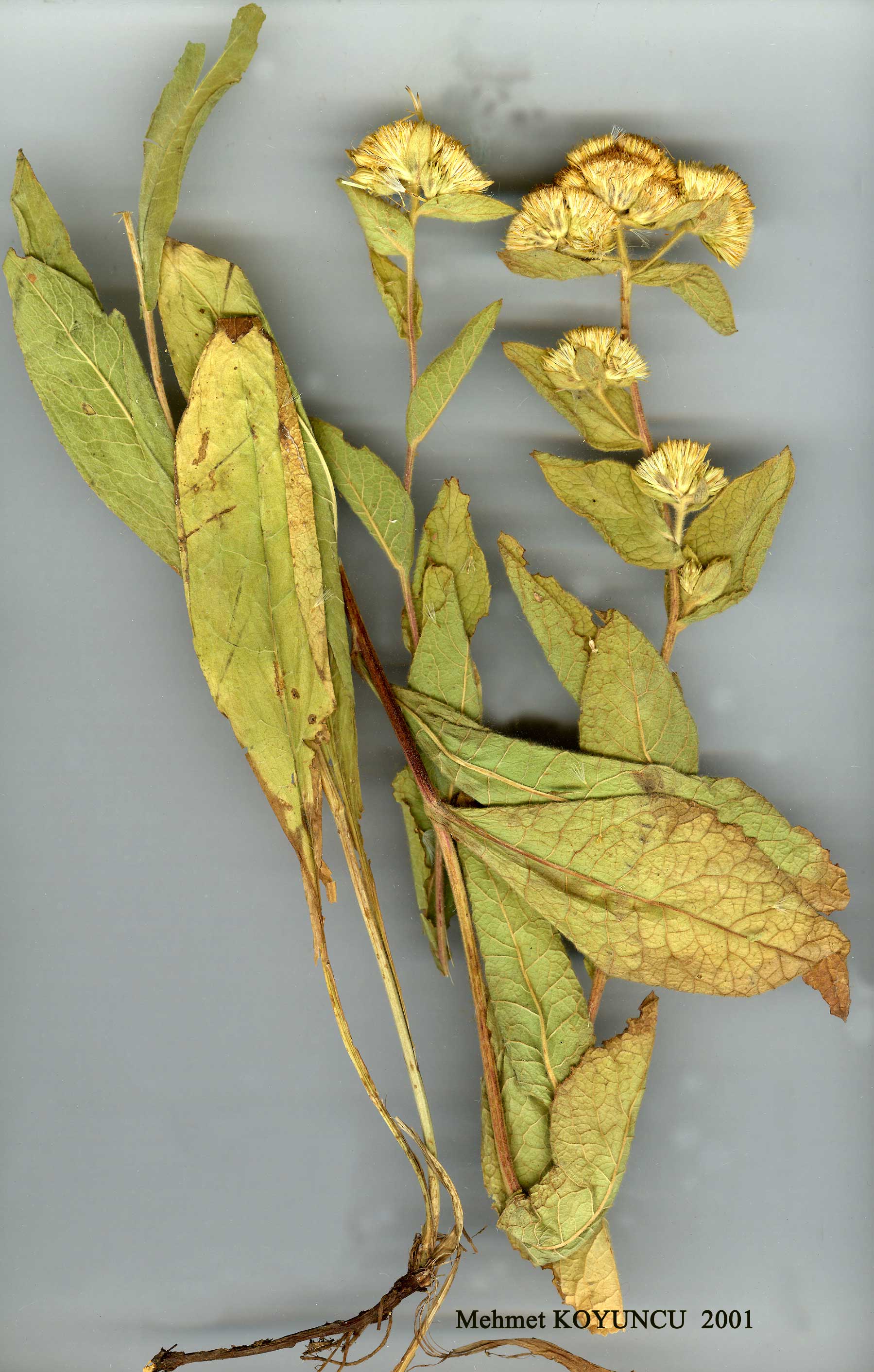 | I. thapsoides (Bieb. ex Willd.) Sprengel, Pug. PI. Minus Cogn. 58 (1813). Ic: Reichb., PI. Crit. 3:347 (1826). Rhizomatous perennial herb. Stems ± erect, 45-150 cm, leafy, sometimes winged, spreading brownish-pilose. Leaves oblanceolate, 14-18 x 1∙5-4 cm, apex acute, base attenuate and sometimes decurrent, margins denticulate, softly pilose on both surfaces, venation sometimes prominent beneath. Capitula obconical, disciform, borne in dense clusters of 6-10 on short peduncles from axils of upper leaves, ± corymbose. Involucre c. 0∙75 cm broad; phyllaries imbricate, 4-5-seriate; outer lanceolate, 3-4x1∙5 mm at base, adpressed-pilose above; inner linear-lanceolate, membranous, 8-10x0∙5 mm, ciliate. Female flowers few, tubular and subligulate, 4-5 mm, shorter than involucre. Disc flowers 5-6 mm. Achenes 2∙5-2∙75 mm, ± glabrous. Pappus brownish, 5-7 mm; hairs c. 25, scabrous, connate at base. Fl. 7-8. On limestone slopes and in thin woodland, 1600-2200 m. 1. Stems noticeably winged; leaves strongly decurrent, densely pilose, veins scarcely prominent beneath subsp. thapsoides 1. Stems not or scarcely winged; leaves only shortly decurrent, ± sparsely pilose, veins prominent beneath subsp. australis subsp. australis Grierson in Notes R.B.G. Edinb. 33:425 (1975). Type: Turkey B9 Van: Gevaş, 1800 m, [13 vii 1954] Davis & O.Polunin, D. 22670 (holo. E!). S.E. Anatolia. B8 Bitlis: Kambos Da., 1800 m, McNeill 636! B9 Bitlis: S. shore of Van G. between Avata and Garzit, 1640 m, Hub.-Mor. 11308! Kotum, Karz Da., 2200 m, D. 24573! C10 Hakkari: Zab gorge nr Kalolans, D. 23867! Distribution of species: Crimea, Caucasus, Iran. |