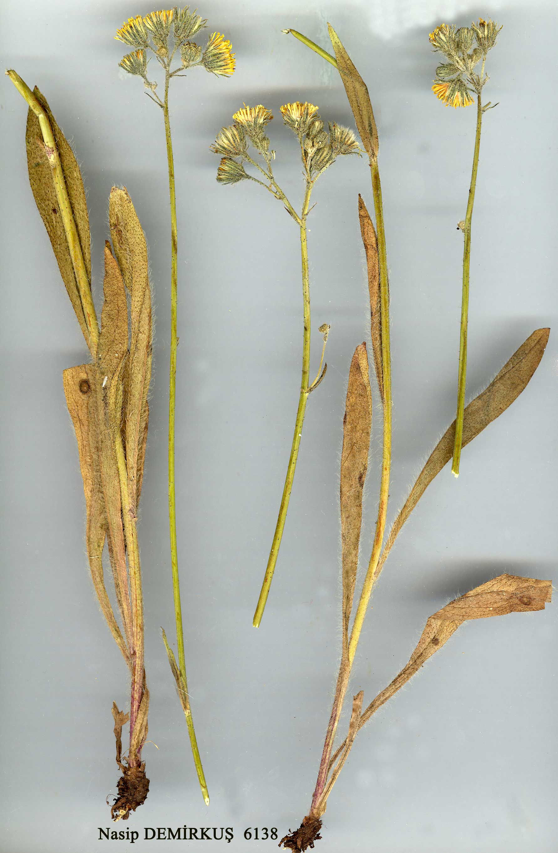 | P. verruculata (Link) Sojâk in Folia Geobot. & Phytotax. 6:218 (1971). Syn: Hieracium incanum Bieb., Fl. Taur.-Cauc. 2:253 (1808), non L. (1753); H. verruculatum Link, Enum. Hort. Berol. Alt. 2:287 (1822); P. incana G.H. &F. W. Schultz in Flora 45:431 (1862); H. verruculatum subsp. barevanicum Woronow & Zahn in Monit. Jard. Bot. Tiflis 22:21 (1912); H. verruculatum subsp. tephro-polium Zahn in Engler, Pflanzenreich 82 (IV.280):1374 (1923), nom. superfl. illegit. pro H. incanum subsp. incanum. Stolons absent. Rosette leaves 30-200 x 5-40 mm, usually elliptic to linear-lanceolate, ± acute, entire, attenuate at base, withering early, with numerous stellate hairs, few to numerous rigid simple eglandular hairs and scattered glandular hairs. Flowering stems 45-110 cm, with numerous stellate and few to numerous glandular hairs throughout, with simple eglandular hairs only at base, with 4-12 leaves smaller and narrower than those of rosette and usually semi-amplexicaul. Inflorescence laxly paniculate to umbellate; capitula 10-60. Phyllaries 8-11 x 1-2 mm, linear-lanceolate, obtuse to acute, with dense stellate and glandular hairs, with or without few simple eglandular hairs. Ligules yellow. Fl. 6-8. Mountain pastures and steppe, woodlands, 1150-2500 m. Described from a plant of unknown origin in the Berlin Botanical Garden. Mainly E. Anatolia; rare in the S. A7/B7 Gümüşane: Erzincan to Kelkit, 2100 m, D, 31896! A8 Erzurum: 59 km from Erzurum to Ispir, 1900 m, Hub.-Mor. 16368! A9 Kars: c. 20 km from Akçay to Cumaçay, 2200 m, D. 46737 ! B5 Kayseri: Erciyas Da., c. 1800 m, Zederbauer. B6 Maraş: Binboğa Da. above Yalak, 1500 m, D. 19954! B7 Erzincan: Sipikör, in valley Kainikdere, Sint. 1890:3317b! B8 Bingöl: foot of Bingöl Da. between Karlıova and Çaylar, 1950 m, D. 46197! B9 Ağri: 53 km from Ağri to Doğubayazit, c. 1900 m, Lamond 5036! C5 Içel: Çayir De. nr Findikpinari, 1400 m, Siehe 1912:598! C6 Adana: Nur Da., E. of Yarpuz, 1150-1250 m, Bııttler & Erben 17799! C10 Hakkari: Yüksekova, 1950 m, Duncan & Tait 168! Caucasia, W. Iran, C. Russia. Hybrids not included in Key |