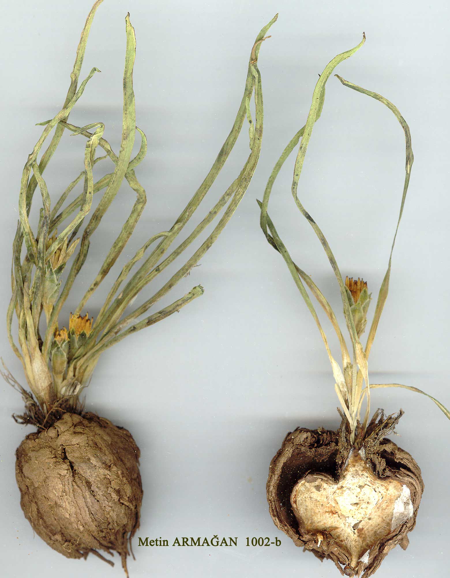| S. inaequiscapa Boiss., Fl. Or. 3:762 (1875). Subscapigerous perennial, 12-20 cm; rootstock swollen, tuberous. Leaves entire, 4-13 x 0.5-1.4 cm; lamina lanceolate to linear-lanceolate, contracted below into a short petiole but expanding again into an amplexicaul base, sparsely crisped-pubescent. Capitula 1 per stem, 18-25 mm long. Inner phyllaries c. 20 mm, glabrous to crisped-pubescent. Flowers pale yellow. Achenes c. 7 x 1 mm, cylindrical, ridged, transversely rugulose-tuberculate, glabrous; pappus dirty white, hairs plumose below, barbellate above. Fl. 6. Fallow clay fields. Type: [Turkey A8 Gümüşane] in arvis derelictis argillosis Armeniae Turcicae prope Baibut, 26 vi 1862, Bourgeau 141 (iso. K! LD!). C. & E. Anatolia, rare. B5 Yozgat: Akdağmadeni forest station, Curtis 177! An endemic species of uncertain affinity. The Yozgat plant has narrower leaves and more hairy phyllaries than the type. |