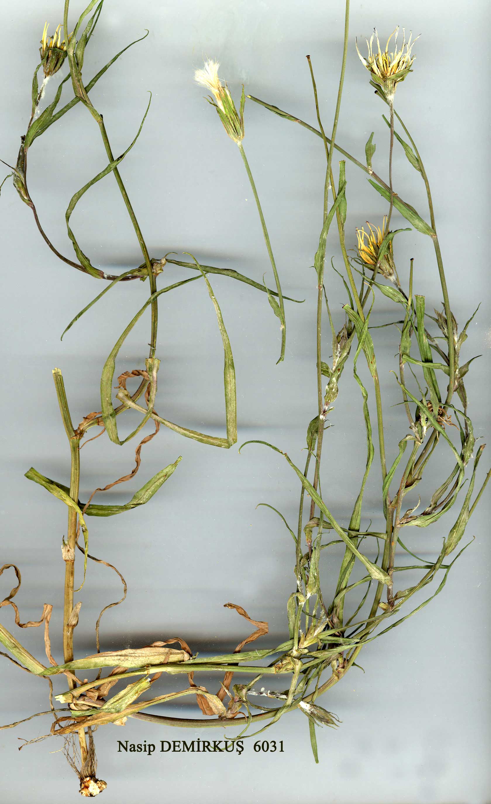 | T. reticulatus Boiss. & Huet in Boiss., Diagn. ser. 2(3): 90 (1856). Figure 25, p. 661. Sparsely floccose to glabrous perennial, 10-60 cm, base of stem with fibrous remains of old leaf bases, often very dense. Stems little-branched or unbranched. Leaves linear to narrowly linear, 3-15 mm wide, margin flat or undulate. Peduncles not thickened below capitula. involucre often floccose at base. Phyllaries (5-)8(-10), lanceolate, shorter than flowers, 2-3 cm in flowering capitulum, 2.5-4.5 cm in fruiting capitulum. Flowers yellow, often turning bluish when dry. Achenes 18-30 mm, whitish-fawn, with 5 longitudinal rows of remote scales, beak ± equal to or slightly shorter than achene, clavate at apex. Pappus 20-23 mm, pale greyish-brown, annulus hairy. Fl. 4-9. Stony slopes, meadows, damp places, 450-3350 m. Type: [Turkey B8] in Armenia prope Erzeroum, Huet du Pavilion. N.E. & E. Anatolia. A7 Trabzon: Zigana Da., 1600 m, Tobey 1993! Gümüşane:Kurdomer, 9 vii 1894, Sint. s.n.! A8 Çoruh: Mağara Y., Şavval Tepe, Murgul, 2400 m, Stn. & fiend. 6041! Erzurum: ridge E. of Ferik Da., E.S.E. of Ispir, Barclay 960! A9 Kars: Yalnizçam, 1900 m, D. 29615! Çoruh: 1 km from Ardanuç, 450 m, Hub.-Mor. 15906! B7 Tunceli: 8 km from Pülümür, 1760 m, Reese (Hub.-Mor. 16869)! Erzincan: Eğin (Kemaliye), Sint. 1890:2272! B9 Van: Çuhgediği pass between Hoşap and Başkale, 2820 m, Hub.-Mor. 11287! Bitlis: Pelli Da. above Pelli, 2590 m, D. 22454! Hakkari: Kara Da., 3350 m, D. 24417! B10 Kars: Gt. Ararat (Büyük Ağri Da.), 2400-2700 m, B.Post 2116! C10 Hakkari: Cilo Da., Djezra, 2800 m, Nábělek 3746! Caucasia. Close to T. graminifolius DC. from Caucasia and Iran with which it may be synonymous (see p. 668). A specimen from A9 Kars (Sarikamiş, 2100 m, D. 30779!) matches the material of T. reticulatus but has white flowers. |