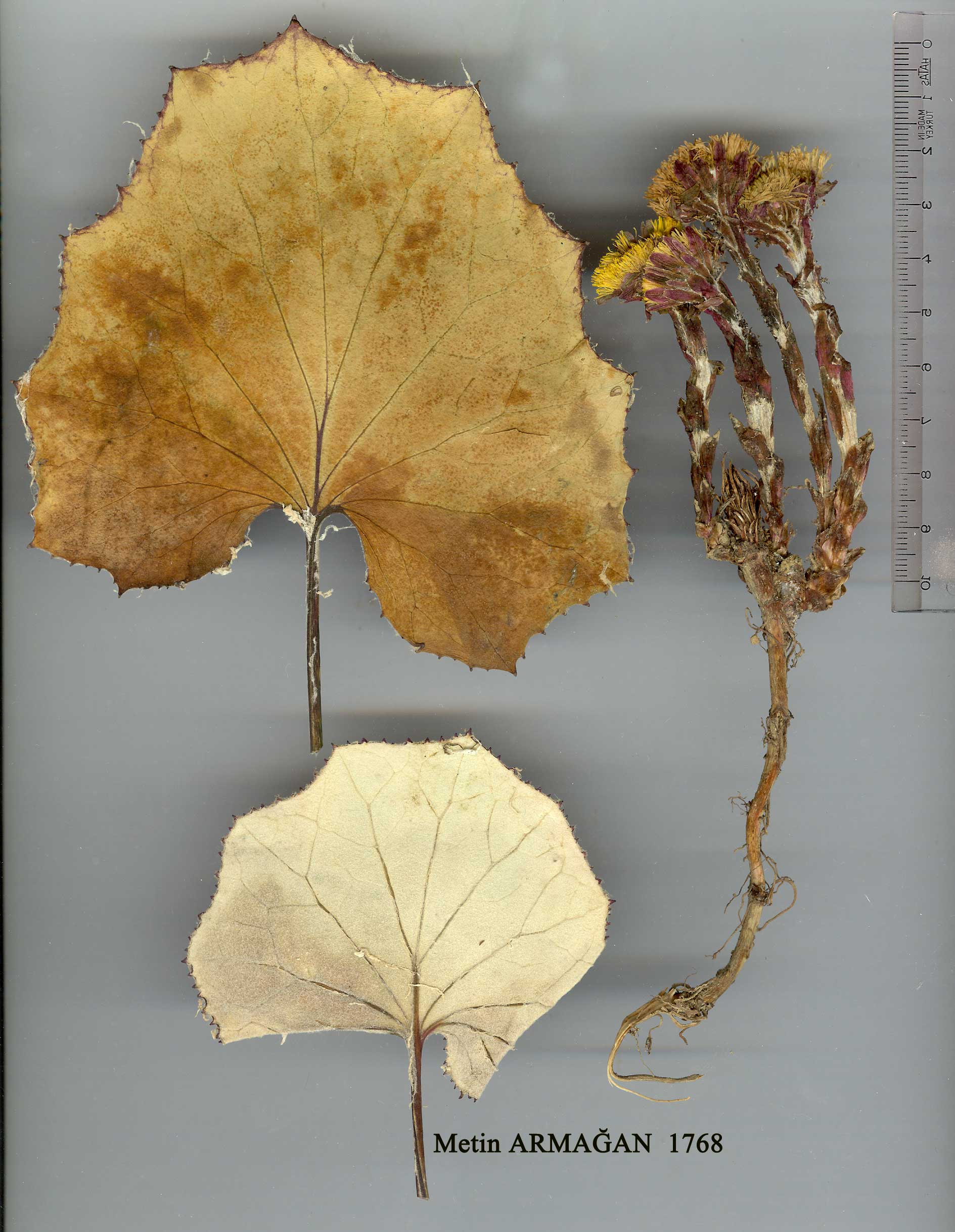 | T. farfara L., Sp. Pl. 865 (1753). Ic: Ross-Craig, Draw. Brit. Pl. 16: t. 20(1961); Polunin, Fls. Europe t. 149 (1969). Leaves petiolate, lamina 10-20(-30) cm diam., with rather acute lobes, margin irregularly toothed, at first white-floccose on both sides, becoming glabrous above. Scapes 4-15 cm (lengthening in fruit to c. 30 cm), with numerous purplish scale-leaves, floccose, erect in bud, nodding after anthesis. Capitula 1.5-2.5 cm broad. Phyllaries linear, obtuse, often purplish and white-hairy, sometimes with black glandular hairs. Achenes 3-4 mm. Pappus 10-15 mm. Fl. 3-4. Waste and sandy places, damp ground, s.1.-2400 m. Described from Europe (Hb. Linn. 995/10, photo!). Widespread except in E. Anatolia; commonest in N. Turkey. A1(E) Tekirdağ: Gölçük Köyü, A.Baytop (ISTE 13503)! A1(A)Çanakkale: Renkoei (Erenköy). Sint. 1883:279! A2(E) Istanbul: Therapia (Tarabya), 29 iii 1896, Azn.! A2(A) Istanbul: Beicos (Beykoz), 16 ix 1900, Azn.! A3 Bolu: below Abant G., 1200 m, D. 37268! A4 Kastamonu: Tosya, Karadere to Devrendi, Sint. 1892:3830! A5 Samsun: Çetirli Pinar Köy, Bafra, 70 m, Tobey 450a! A6 Samsun: 3 km N. W. of Samsun, 10 m, Tobey 450! A7 Gümüşane: above Gümüşane, Sint. 1894:5429! A8 Erzurum: Kop Da. pass, 2400 m, Tobey 2069! Bl Izmir: Yamanlar Da., Kara G., 13 iii 1969, Fitz & Spitz.! B4 Ankara: Beynam Orman, Kasapligil. B6 Sivas: Sivas, Maunsell! B7 Elaziğ: Maden, Romieux s.n. B8 Erzurum: nr Erzurum, Calvert & Zohrab! C2 Antalya: Ak Da., 1300 m, Sorger 68-25a-10! C3 Isparta: Dedegöl Da., 1400 m, Sorger 66-45-7! C4 Konya: 20 km W. of Konya, 1300 m, 2 iii 1969, Fitz & Spitz.! C5 Niğde: Ulukişla to Pozanti, 900 m, D. 26309! C6 Hatay: Amanus, Hasan Beyli to Osmaniye, 500-800 m, Haradj. 3940. Is: Samos, Runemark & Snogerup 19418. Europe except extreme N., N. & W. Asia, N. Africa. Euro-Sib. element. Introduced in N. America. The leaves of this species are medicinal. |