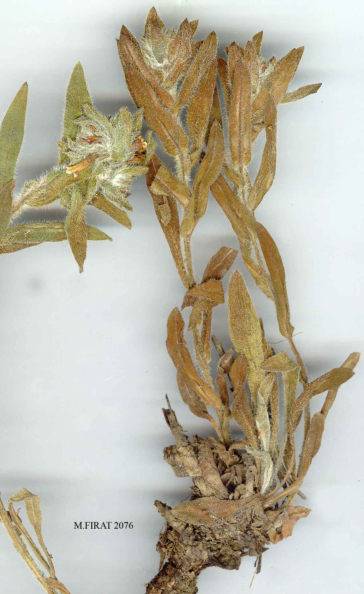 numerous, spreading, 1-3 mm, tuberculate at base, ± without intermediates between short pubeseent and longer setiform hairs. Basal-leaves linear-lanceolate with entire margins, 6-20x0.7-2 cm; cauline lanceolate to elliptic, 4-8 x 1-2 cm. Cymes 10-25 cm in fruit. Bracts lanceolate to ovate, 1-6x0.5-2.5 cm. Calyx 8-10 mm in flower, 13-15 mm in fruit, densely covered with setiformhairs. Corolla yellow, glabrous outside, 10-20 mm, limb 5-8 mm diam. Nutlets 4-6 mm diam., scrobiculate-reticulate; beak strongly deflexed. Fl. 5-7. Fields, rocky slopes, steppe, Quercus scrub, 1000-2500 m. Type: [Turkey B9 Siirt] Südseite des Passes Aghzi Gedik, 10 km nördlich von Mukus, 2500 m, 24 vi 1939, Frödin 147 (holo. W! İso. UPS). , E. Anatolia. B7 Erzincan: Çağlayan, 1700 m, Karamanoğlu 66-38! Tunceli: 16 km N. of Tunceli, 1000 m, Hub.-Mor. 11060! B8 Siirt: Halkis Da. above Şeyhan W. of Sason, 1000-1500 m, Watson et al. 1204(!). B9 Bitlis: 5-8 km N.W. of Tatvan, 1800 m, D. 43353! Van: 5 km W. of Gevaş, 1670 m, Hub.-Mor. 11055! C9 Hakkari: Çukurca, 1300 m, 22 v 1966, Eiselt(!). Endemic. Ir.-Tur. element. Related to A. cordifolia. |