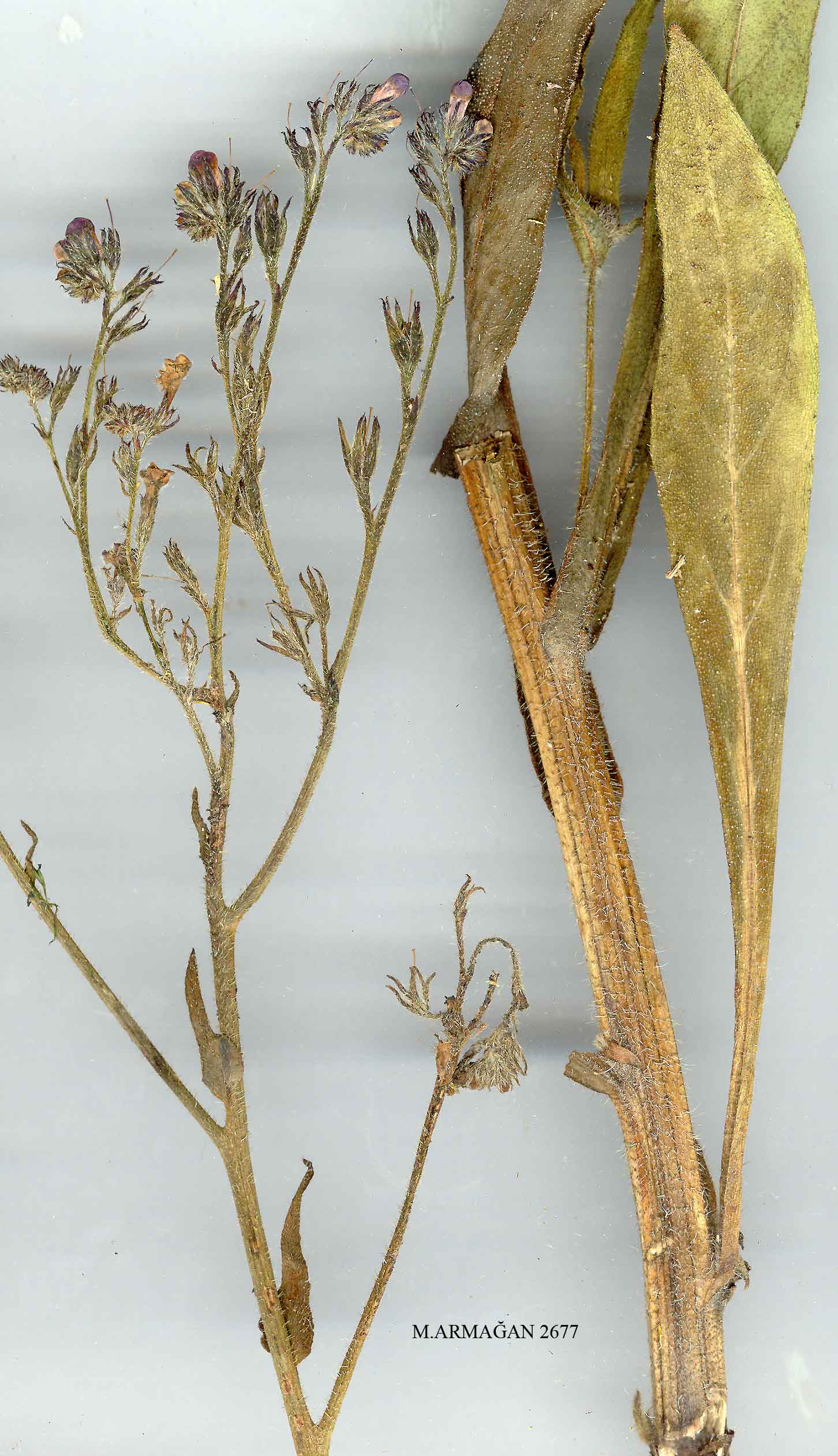 | A. strigosa Labill., Icon. PI. Syr. 3:7, t. 4 (1809). Ic: Boul., Fl. Lib. Syr.: t. 288 (1930). Map. 27, p. 397. Stout tuberculate-strigose biennial or perennial; stems erect, 40-80 cm. Leaves 70-300 x 15-35 mm, narrowly elliptic to oblanceolate, coriaceous, sparsely tuberculate-strigose. Cymes becoming lax in fruit; bracts minute, linear. Calyx 6-8 mm, only slightly elongating in fruit, divided to 2/3 or almost to base into obtuse, ligu-late, sparsely strigose lobes. Corolla bright blue, tube c. 8 mm, lobes 3-4 mm. Stamens inserted at top of tube. Nutlets 6-8 x 2-3 mm, oblong, erect. Fl. 5-6. On serpentine, limestone banks, waste places, 150-1300 m. Type: Lebanon juxta Tripolim, Labillardiére (FI). S. & E. Anatolia, Islands. B7 Malatya: Malatya, 1300 m, Zel 1033! C6 Hatay: valley above Dörtyol, 150 m, Darrah 629! Gaziantep: mt. Dülük Baba, N. of Aintab (Gaziantep), 1000-1250 m, Haradj. 1363! Urfa: Rum Kala'a, Sint. 1888:365! C7 Urfa: Urfa to Suruç, Hausskn. C8 Mardin: Mardin castle, 1200 m, D. 28350! Is: Rodhos, Asgura, Rech. 8576! Cyprus, W. Syria, Syrian Desert, Iraq, Iran. Specimens from Rodhos are referred to var. decalvata Beg. & Vacc. which may be synonymous with subsp. tonsa Bornm. from N.W. Iran. Subsp. tonsa is said to differ from subsp. strigosa in its subglabrous stems and less aculeate leaves. Plants intermediate between A. strigosa and A. azurea occur (q.v.). |