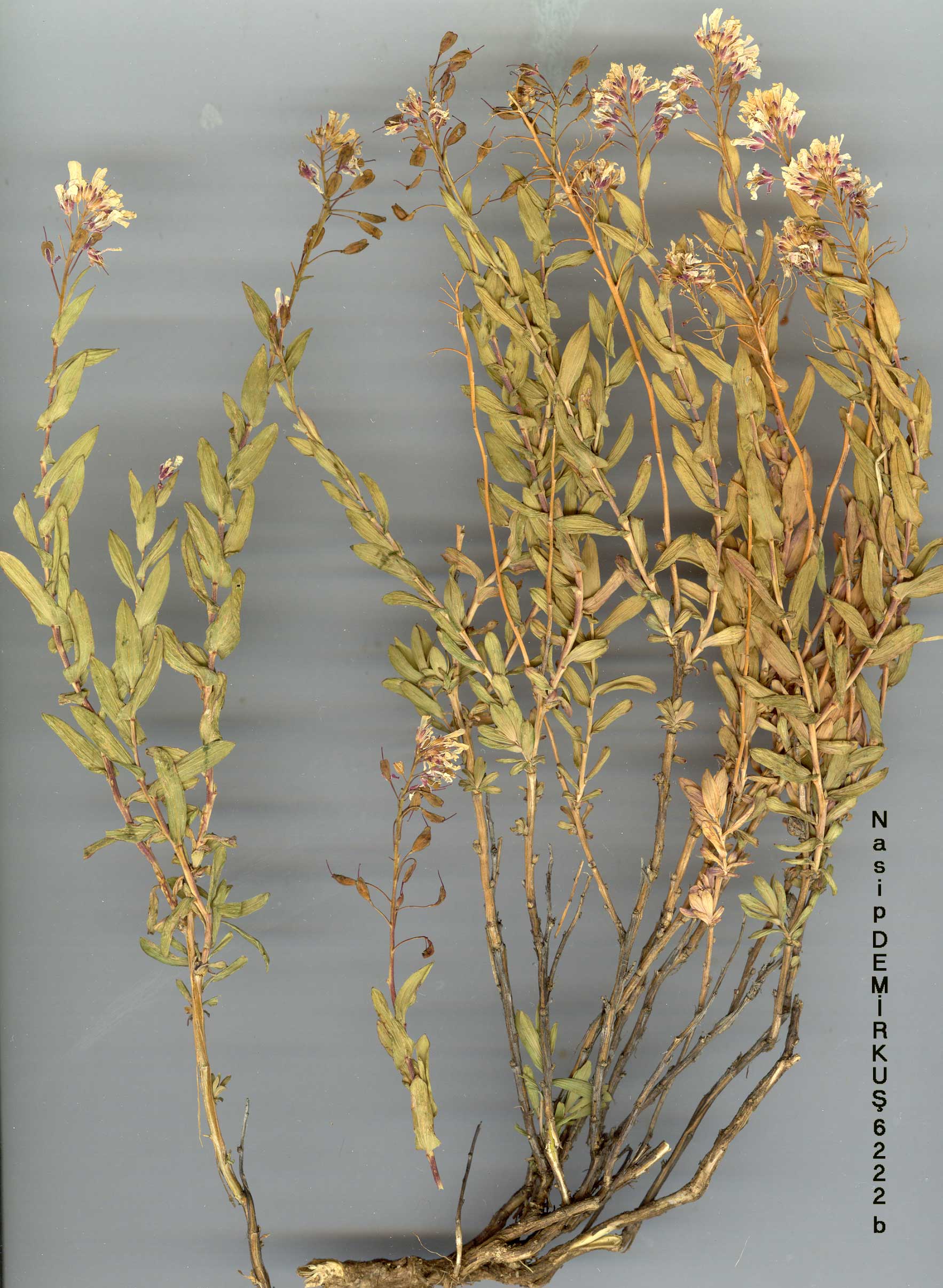 | Ae. trinervium (DC.) Boiss., Fl. Or. 1: 342 (1867). Syn: Hutchinsia trinervia DC, Syst. 2: 387 (1821); Iberidella ovalifolia Boiss. in Ann. Sci. Nat. 17: 189 (1842)! /. sagittatum Boiss., op. cit. 188! Ae. salmasium Boiss., Fl. Or. 1: 350 (1867); Eunomia trinervia (DC.) Prantl in Pfianzenfam. 3(2): 165 (1891); Eunomia sagittata (Boiss.) Schulz in Bot. Jahrb. 66: 95 (1933). I?: Fl. URSS 8: t. 30, f. 5 and t. 31, f. 4 (1939). Figure 10, p. 251. Perennial, woody at base, 15-20 cm, flowering stems simple, glabrous. Leaves oblong or oblong-lanceolate, of firm texture, 3-nerved, amplexicaul or sessile, cordate-hastate or attenuate at base, acute at apex. Petals white, 1-nerved at base, 6-10x2-3 mm. Filaments slender, neither connate nor toothed, anthers apiculate. Inflorescence much elongating in fruit. Ovary 2-locular, usually each loculus 2-ovuled. Fruiting pedicels erect, ascending, 5-8 mm. Siliculae oblong, or obeordate, 5-9 x 3-4 mm; septum 6-9 x 1.5-2.5 mm; wings entire-margined 0.5 mm or absent; sinus c. 0.5 mm; style 2-3 mm. Seeds 1-2-3, smooth, not mucilaginous. Fl. 5-6. Rocky slopes, 2000-2700 m. Syntypes: [W. Iran] in monte Elwend, Michaux, Olivier. N. Armenia & Kurdistan. A9 Kars: nr. Iğdir (Grossheim 4: map 161). B8 Bitlis: Kambos Da., 2000 m, D. 23392! B9 Bitlis/Van: mt. 10 km SE of Pelli, 2500 m, D. 22591! Van: 24 km SW of Gevaş, 2700 m, Frödin 240! (as Ae. stylosum DC). N. Iraq, N., W. & S. Iran, Transcaucasia, Afghanistan. |